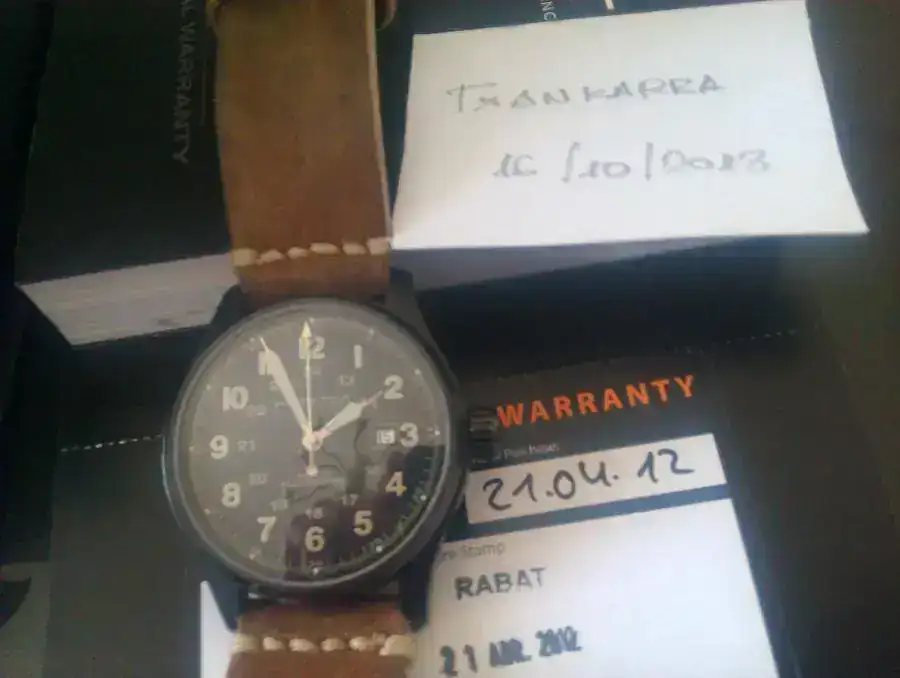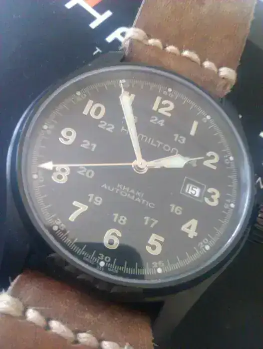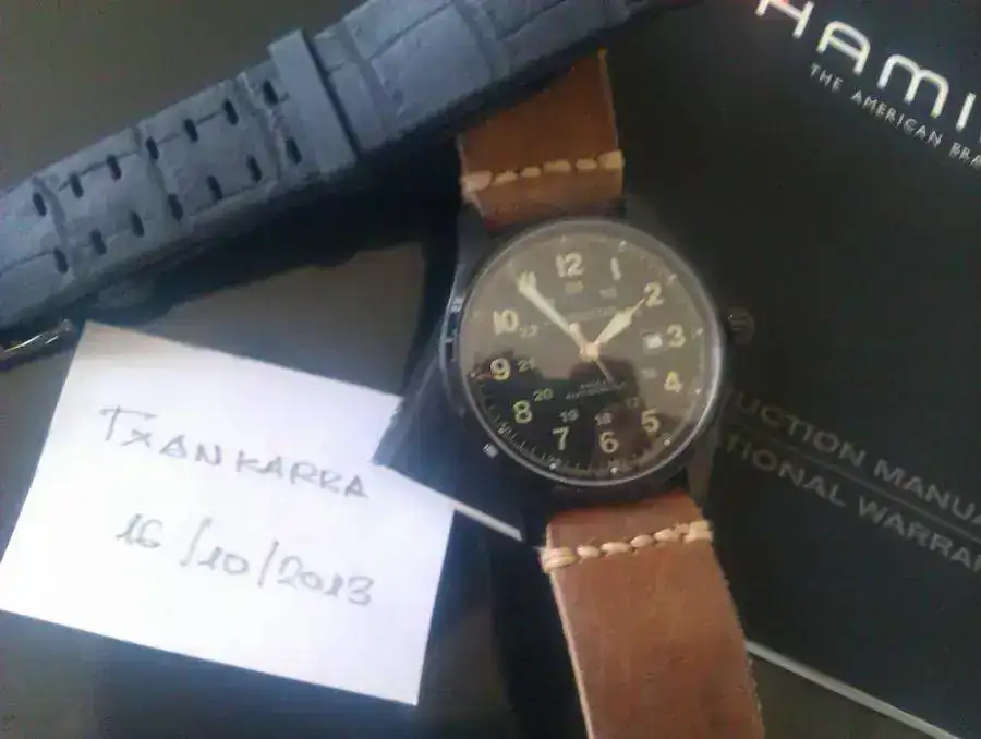 Hola, pues por necesidad de cash saco a la venta un recien llegado, un Hamilton Khaki automatico de 44mm en PVD, el reloj viene con garantía sellada oficial, aún está en garantía. El reloj no tiene ninguna marca, ninguna, no ha salido de casa, está impoluto, con toda su dotación,garantía sellada el 12 de abril 2012 pero como digo no lo he usado, lo vendo con la correa de caucho original sin usar, la otra vintage hecha a mano solo es para la foto aunque todo es negociable.