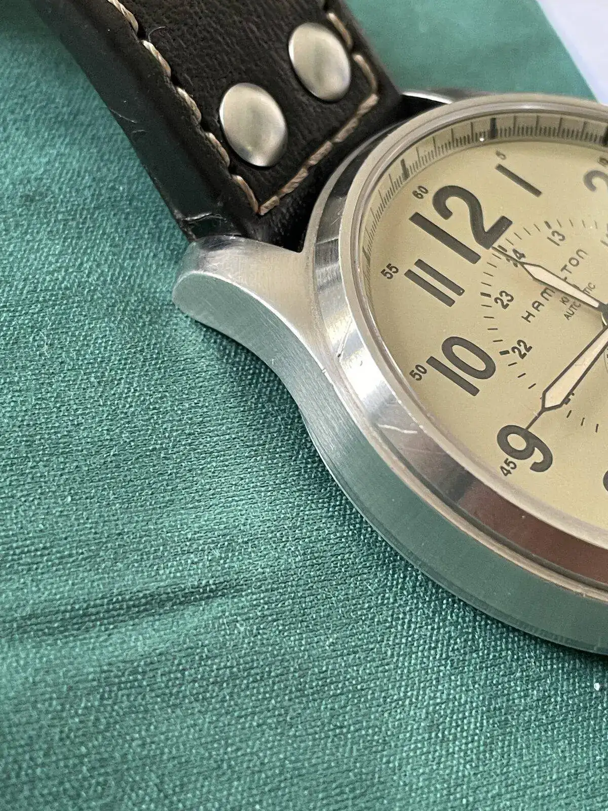 Avanzando en la primavera quiero aprovechar para sacar este Hamilton. Ya lo intenté previamente, pero lo retiré pues no hubo acuerdos entre las proposiciones, etc. Por eso, le doy una segunda intentona a este reloj que viene de una relación antigua, de ahí que no tengo papeles ni caja. Hay que destacar que funciona correctamente, pero con algunas marcas a la altura de las 10 (Intento reflejarlas en las fotos). ¡De ahí el precio!
