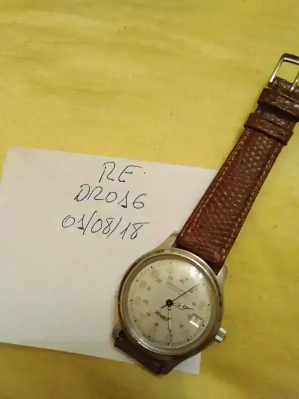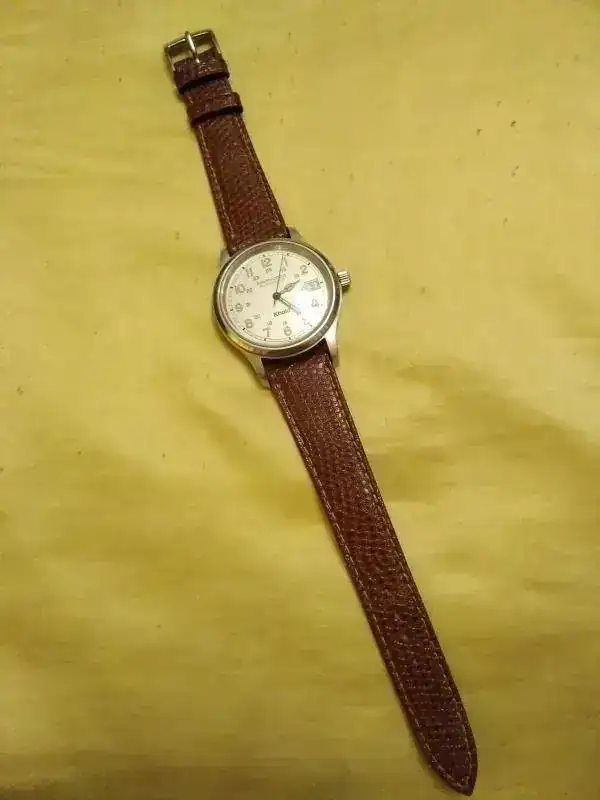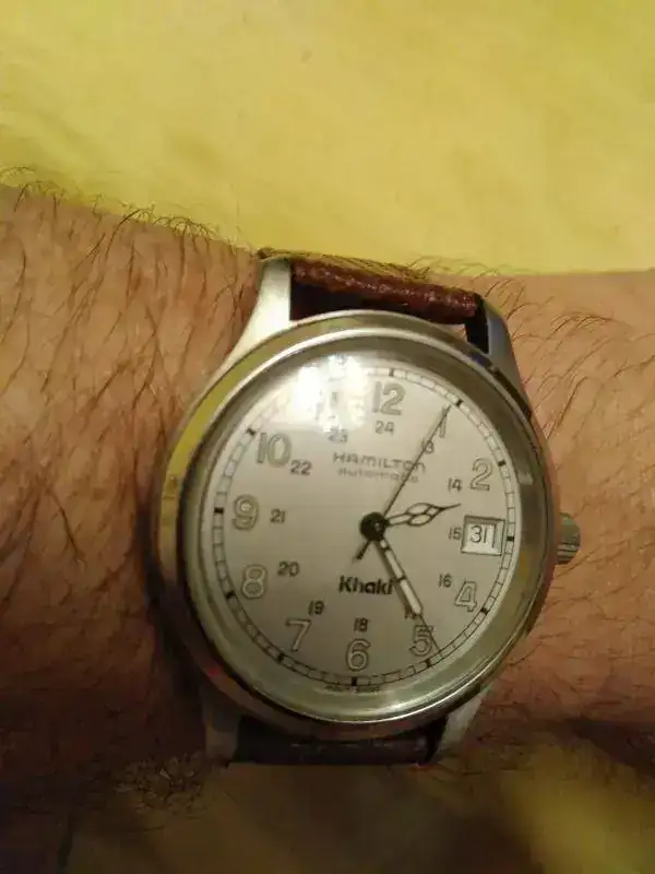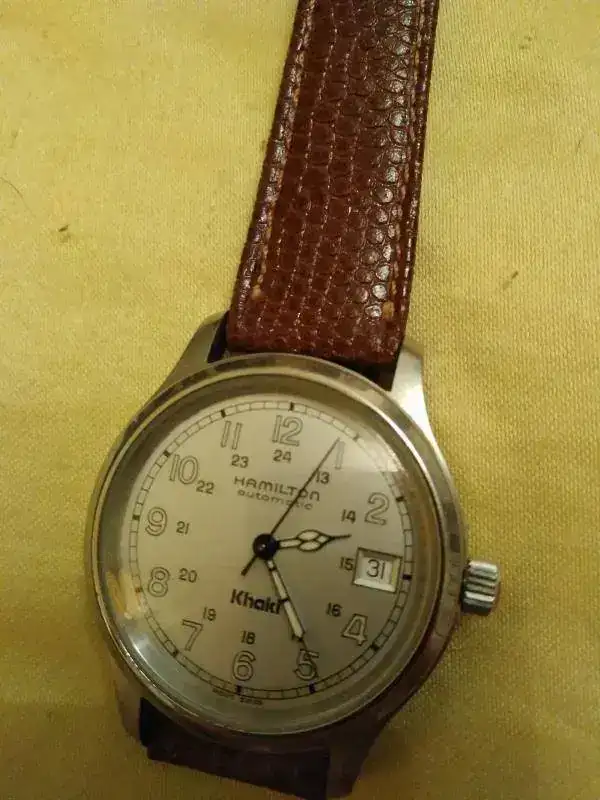 Ofrezco este reloj Hamilton Khaki con esfera blanca y manecillas clásicas. Es el modelo 9721B.