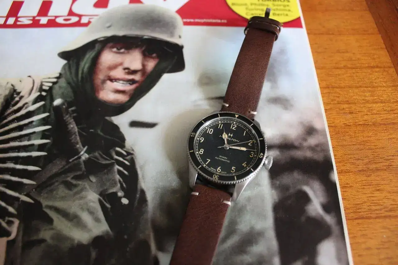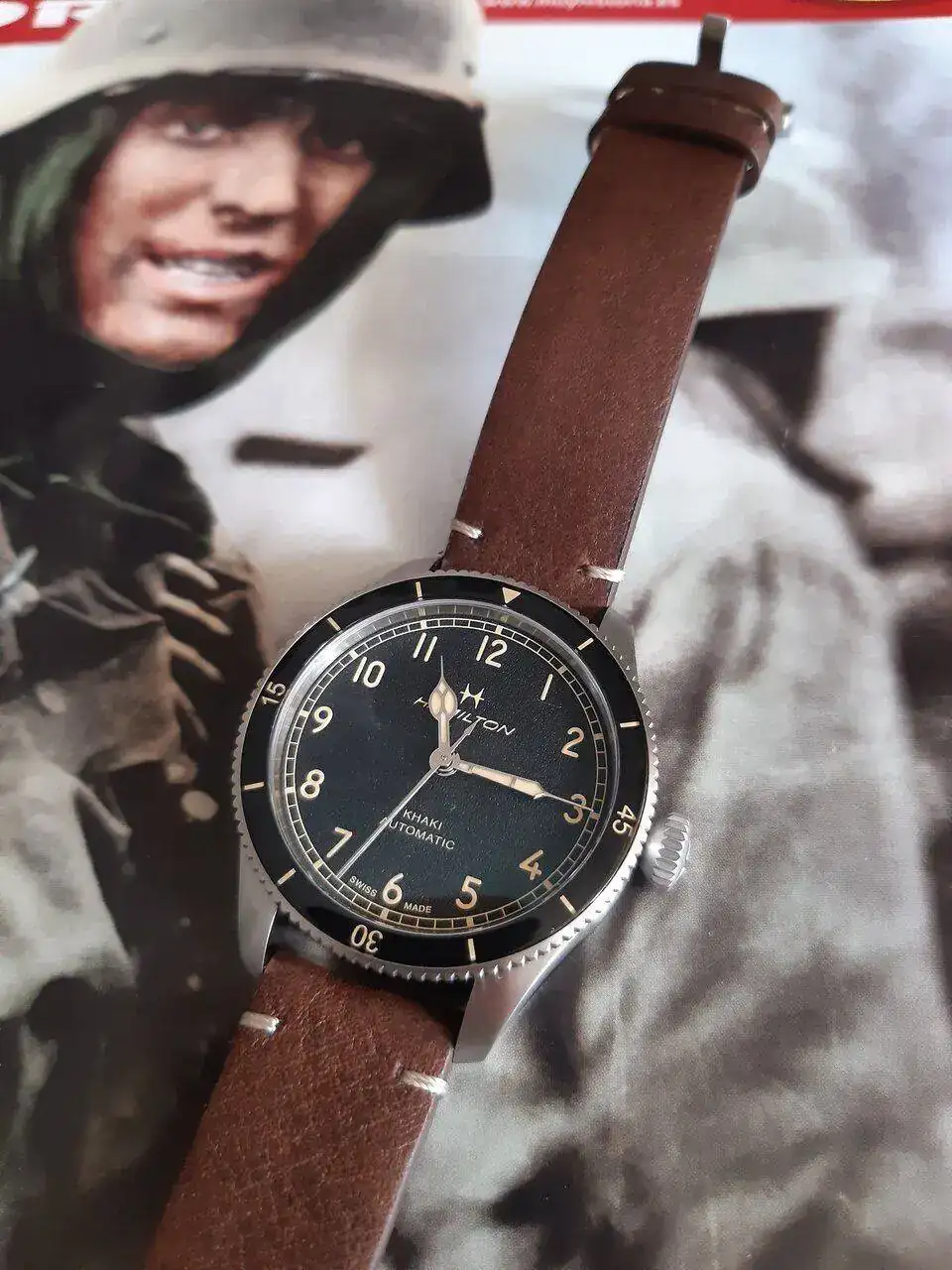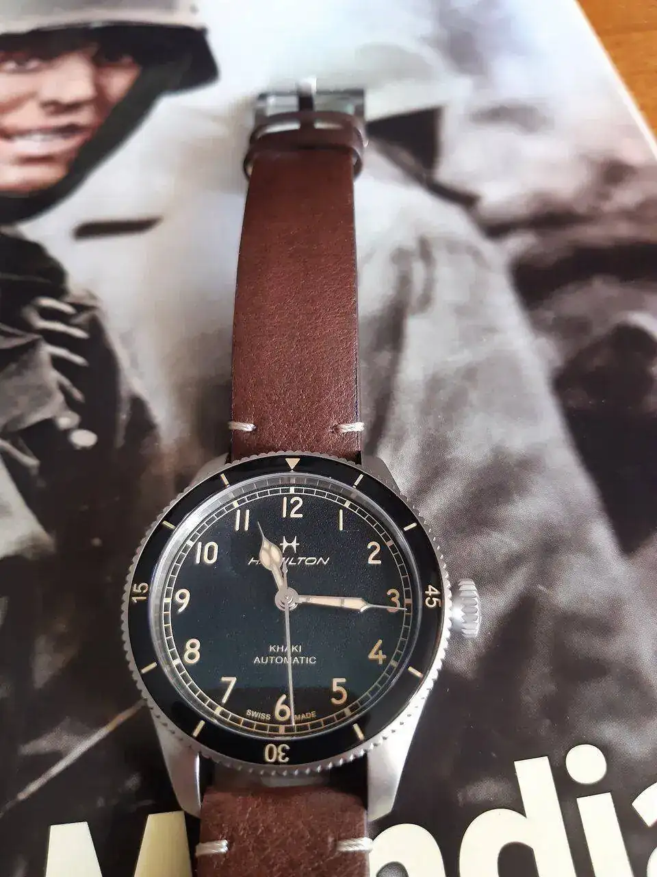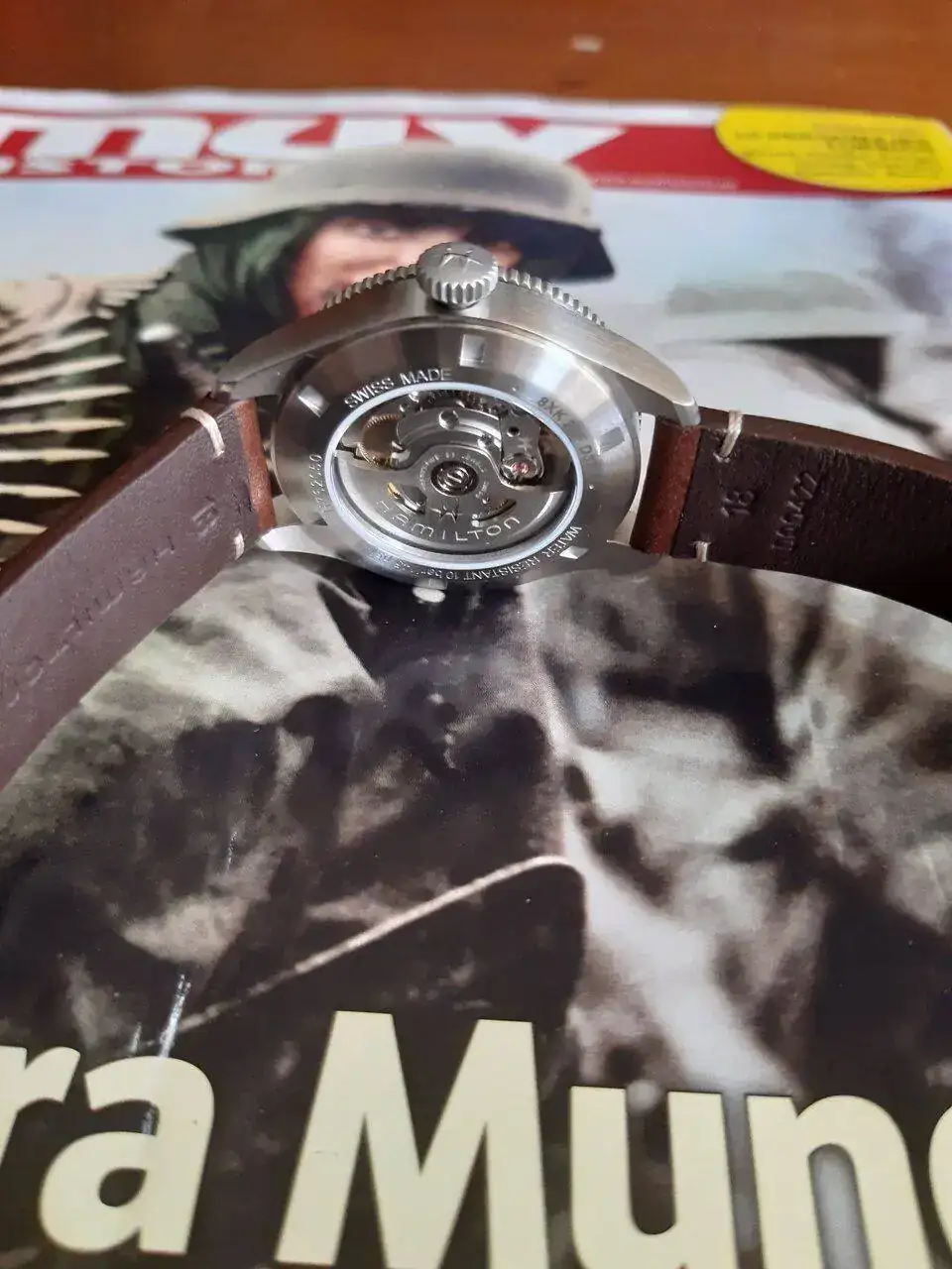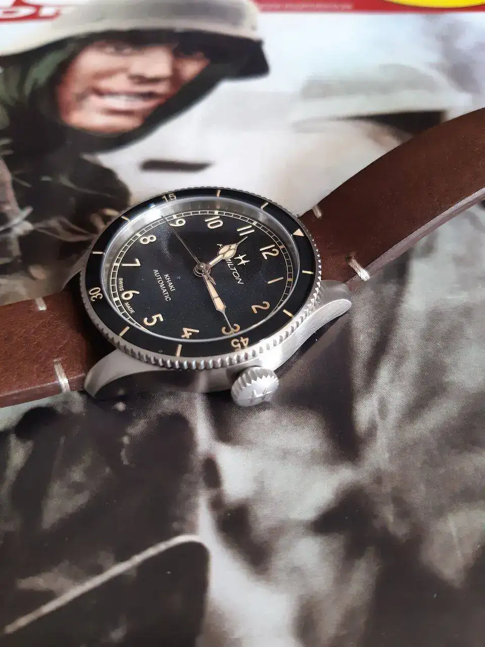 Tras reducir mi caja drásticamente en los últimos meses con esta incorporación me quedó actualmente con 6 relojes. Buscaba un reloj de estética flieger y aunque tenía en mente otras opciones más puristas, me acordé de este Hamilton. Es un reloj un poco híbrido entre reloj de piloto y diver, con sus 100 m wr y su bisel y hay un par de detalles clave para decantarme por este reloj. El primero, su tamaño. Esos 38 mm en mi muñeca de 16,5 cm son ideales, el lug to lug le sientan como un guante a mi muñeca. El calibre H10 lo conozco de otro Hamilton y es una pasada por su gran precisión y su enorme reserva de marcha.