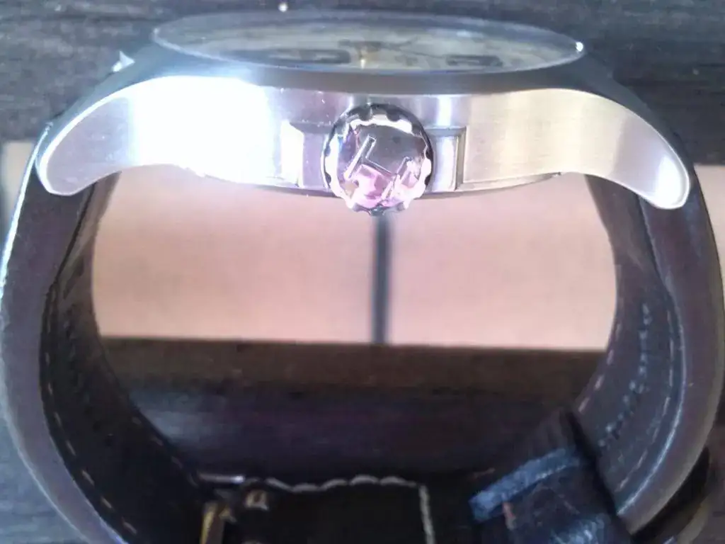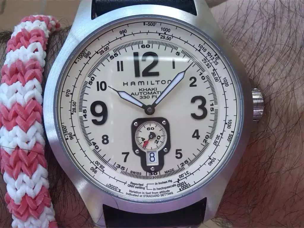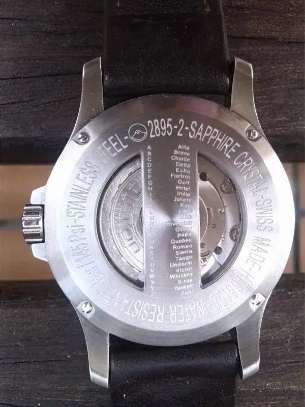 Un resumen de sus características: movimiento automático ETA 2895-2, caja de 44 mm en acero inoxidable, esfera de un beige precioso, cristal de zafiro, fondo abierto con alfabeto de aviación“zulu”. Sumergible a 100m (aunque éste no ha olido el agua)… Y la correa… ¡Qué correa, señores! De piel marrón oscuro sencillamente es-pec-ta-cu-lar. ¡Rezuma calidad por los cuatro costados! Ancho entre asas de 22mm.