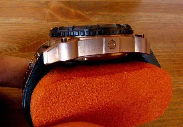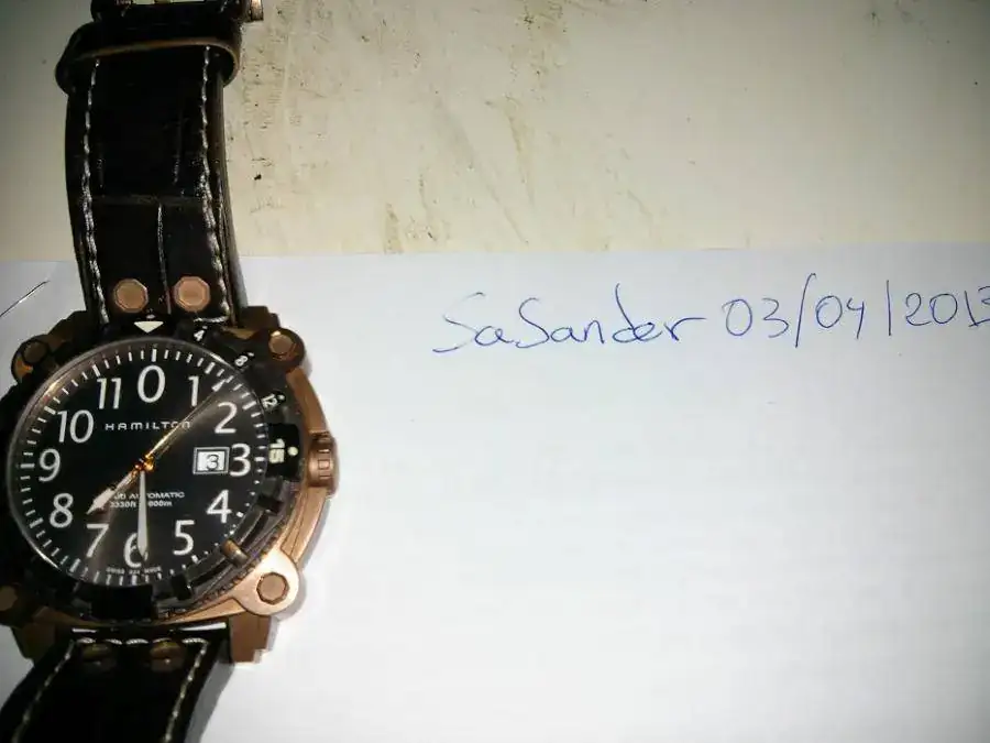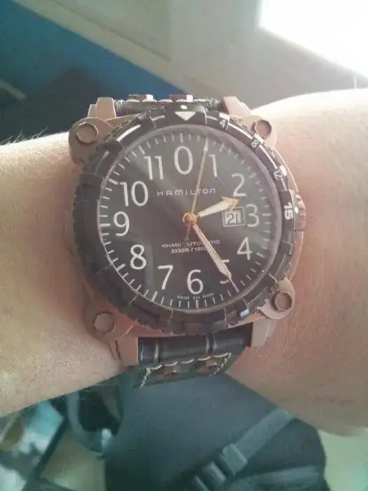 Hola compañeros, hace un par de semanas que le compré a otro forero este hamilton y la verdad que cada vez que lo miro me gusta más, pero tiene un problema y es que es demasiado grande para mí. El reloj está en un estado fantástico, no tiene ninguna marca en caja ni bisel, y el cristás está impoluto. Algún pelillo en el cierre pero es que casi ni se ve. El reloj es el modelo con la caja en color bronce que contrasta genial con la esfera marron oscura. La correa al 90% es de cuero marrón y por la parte trasera de caucho, para poder meterla en el agua, aunque conmigo el agua no la ha tocado.