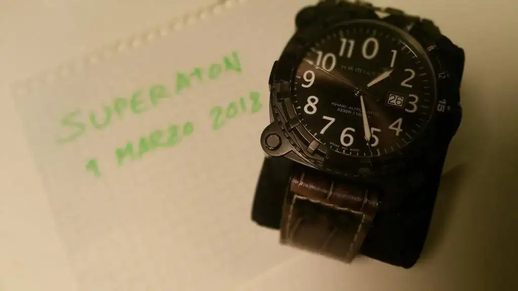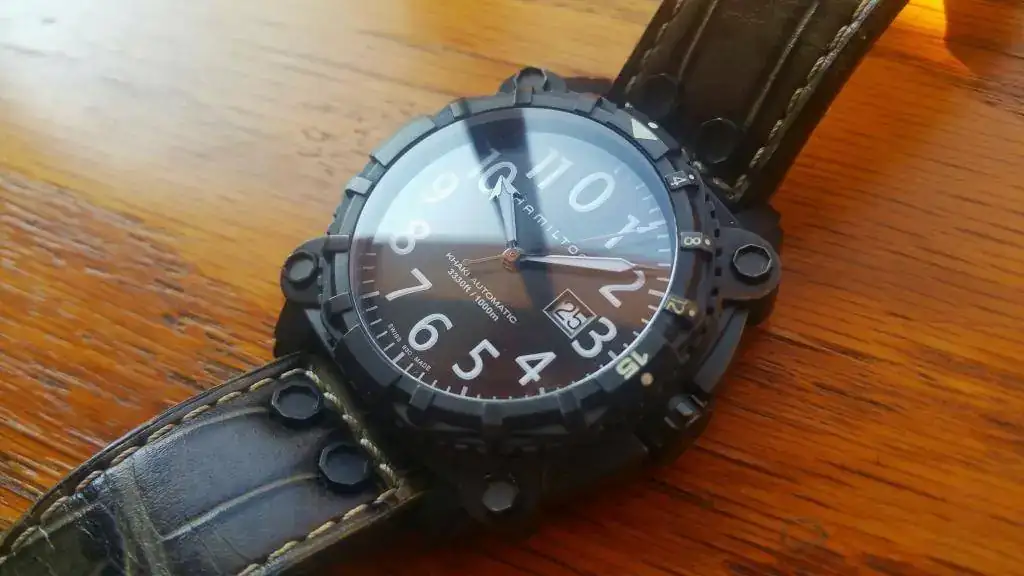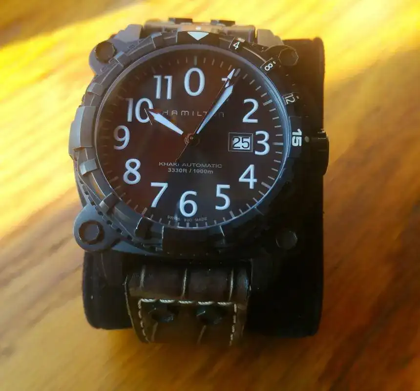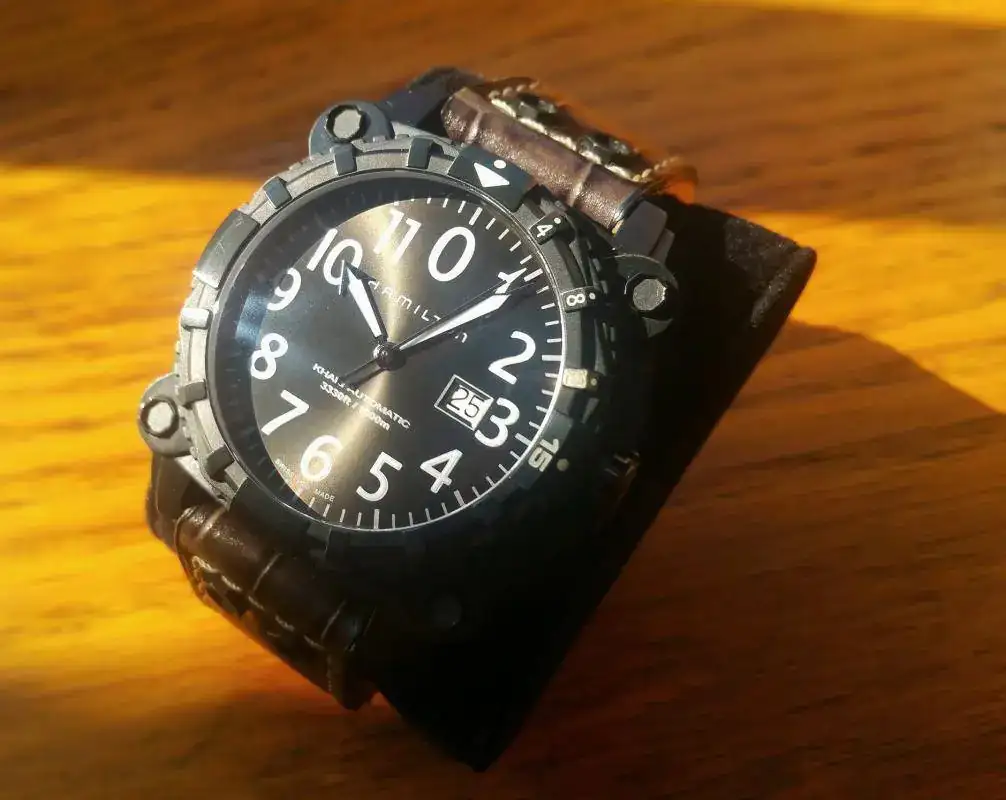 Vendo mi HAMILTON KHAKI BELOWZERO H785750 en PVD. Se trata de un 1.000mts con válvula de helio y con un calibre ETA 2826-2 con reserva de unas 40h y que permite el remonte manual. con un cristal de zafiro con AR de 5,6mm de grosor. Correa de lagarto con mucha vida por delante. La corona (a rosca) queda embutida en la caja con lo que queda absolutamente protegida,