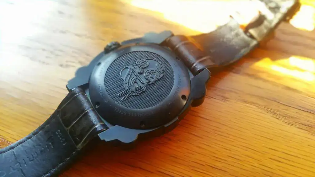 Tapa trasera: Acero inoxidable pavonado PVD. Con logo e inscripciones. Sujeta con 6 tornillos.