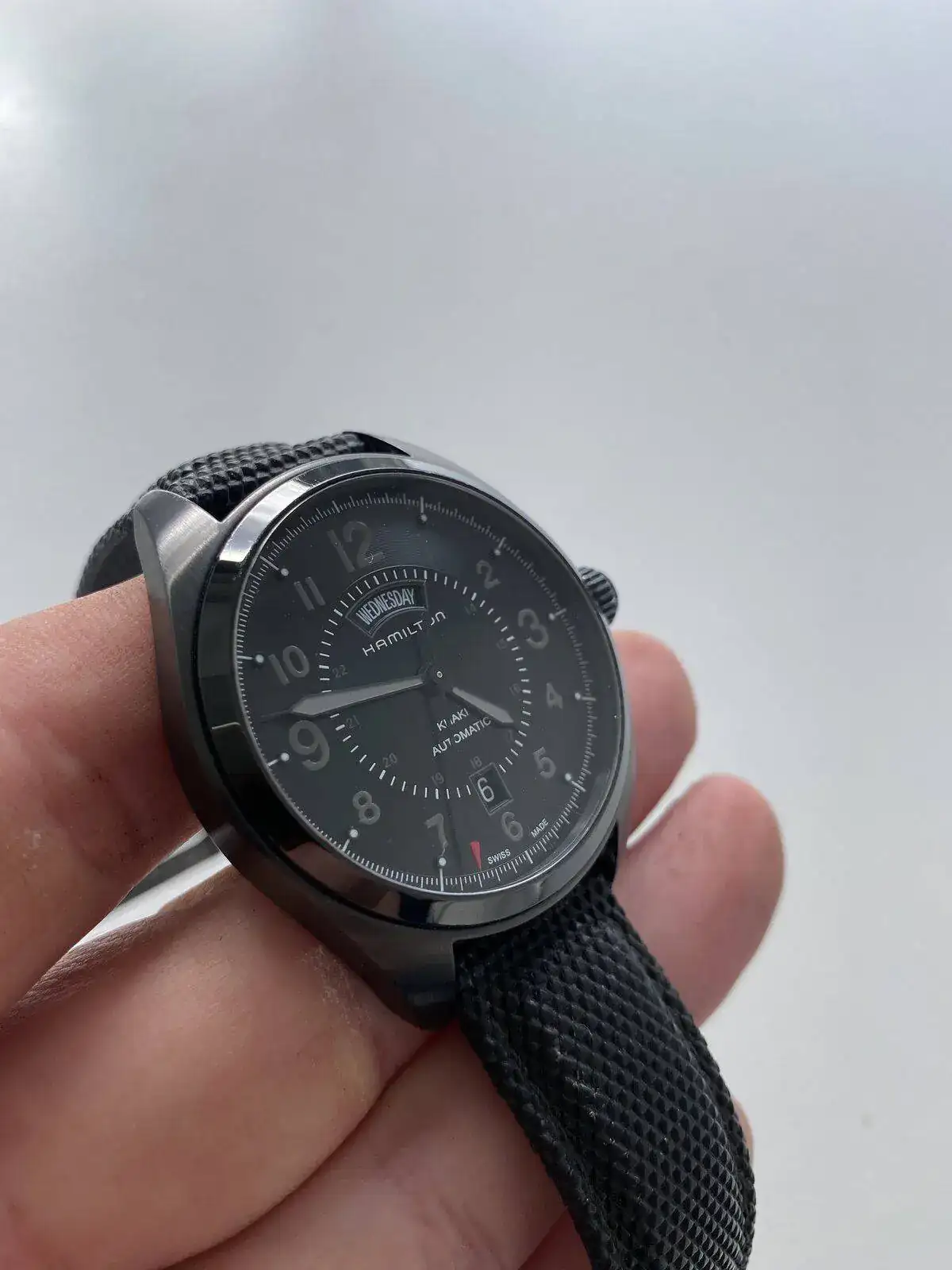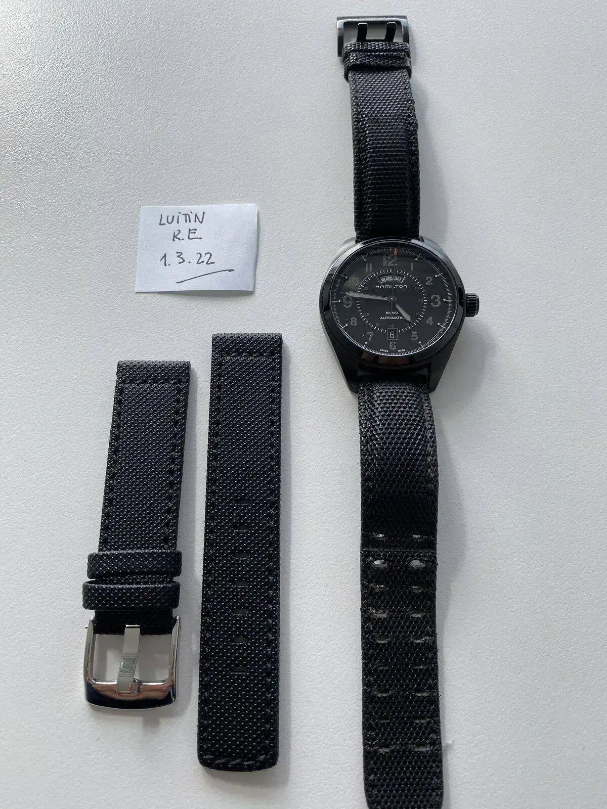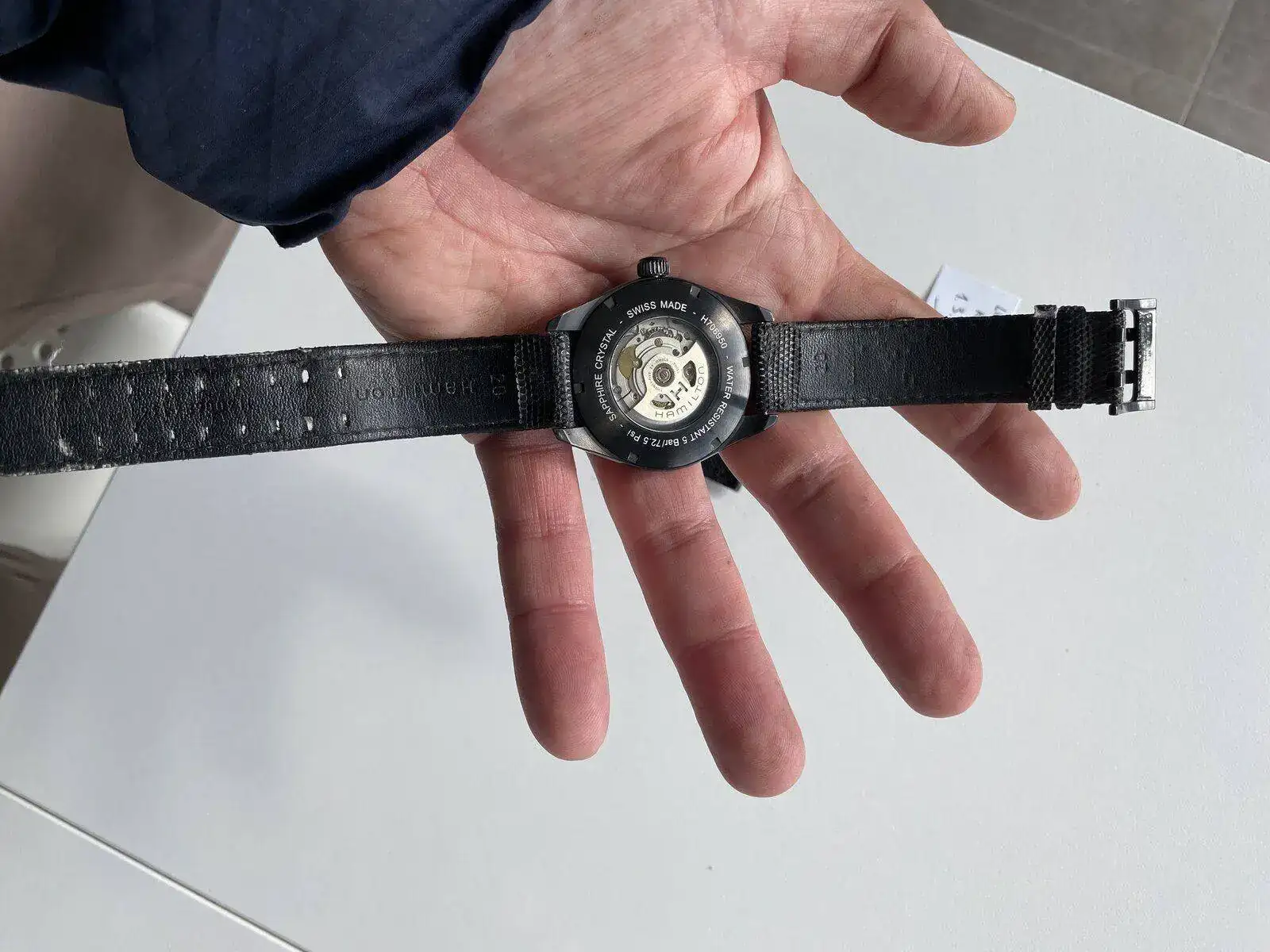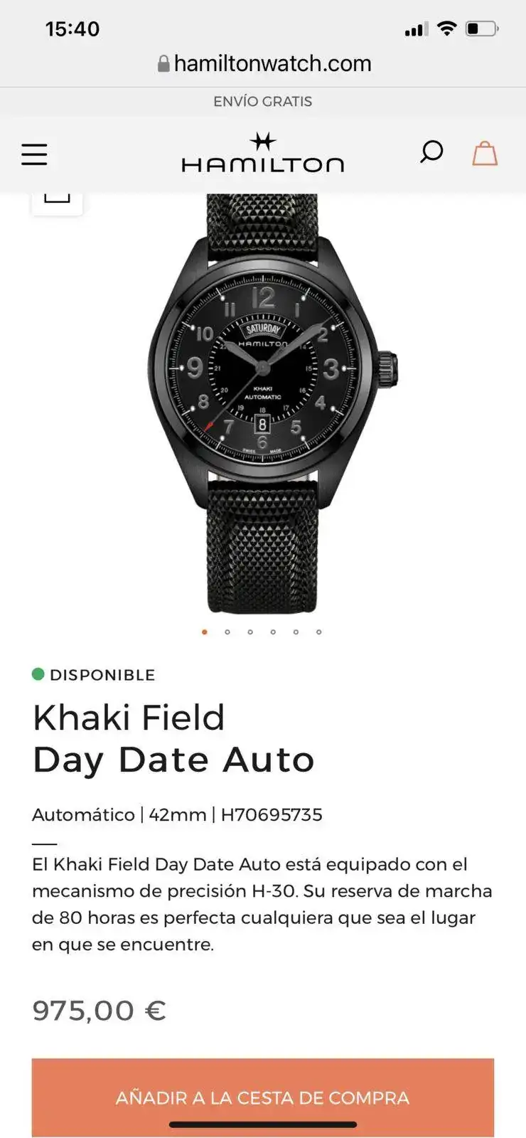 saco a venta este Hamilton Khaki day date con el espectacular calibre H 30 de Hamilton con 80 horas de reserva de marcha, su pvp es de 975€, 42 mm sin contar corona , cristal de zafiro, acero PVD solo presenta algún micro pelillo en el bisel cualquier cosa que se pueda ver en las fotos blanco es la foto por eso he hecho varias en distintas posiciones para que se vea que no tiene nada; solo tiene la correa desgastada pero regalo otra aftermarket de alta calidad sin estrenar solo reloj sin caja ni papeles acepto entrega en cualquier concesionario Hamilton en Barcelona sin cambios por favor muchas gracias saludos