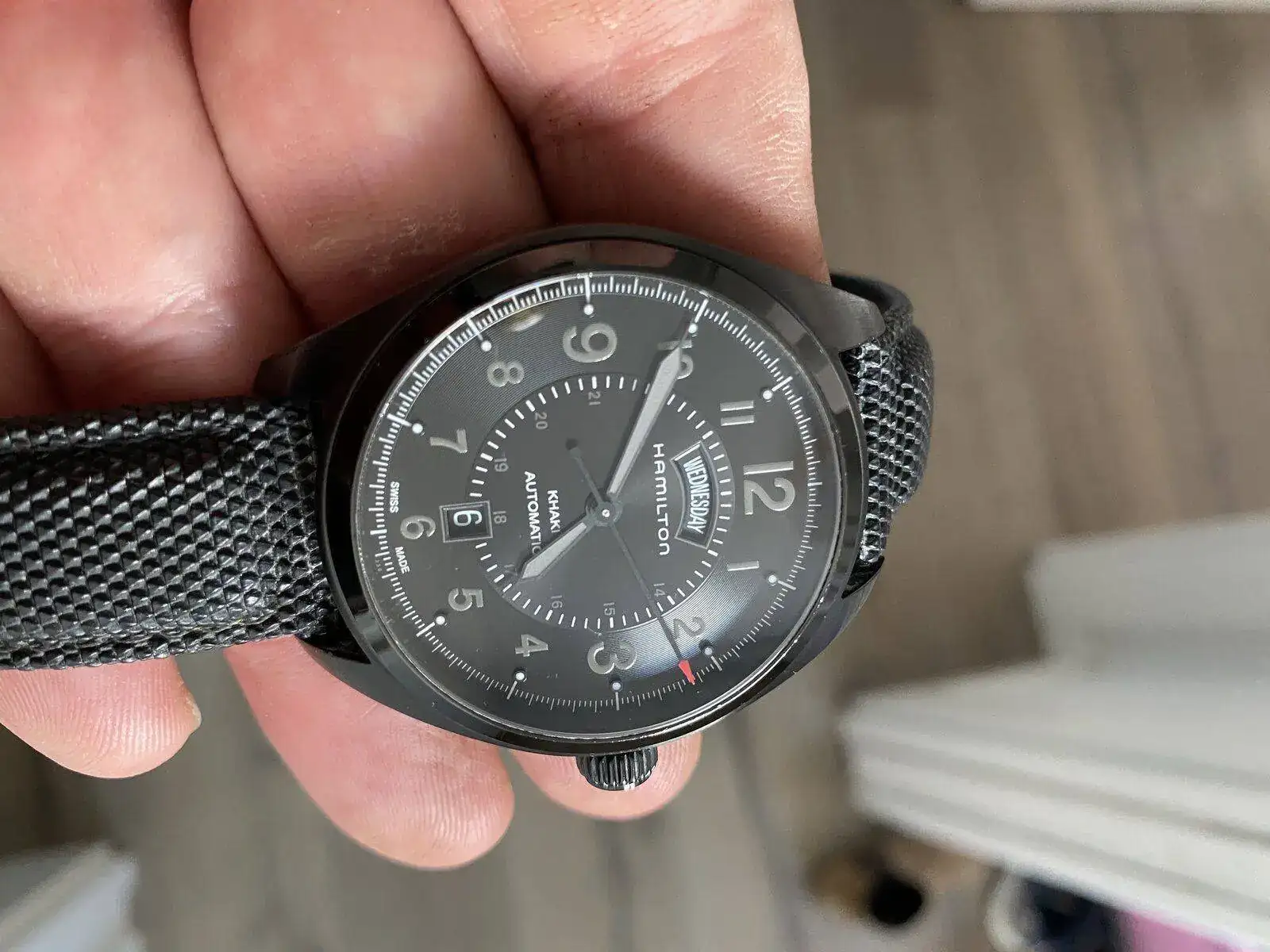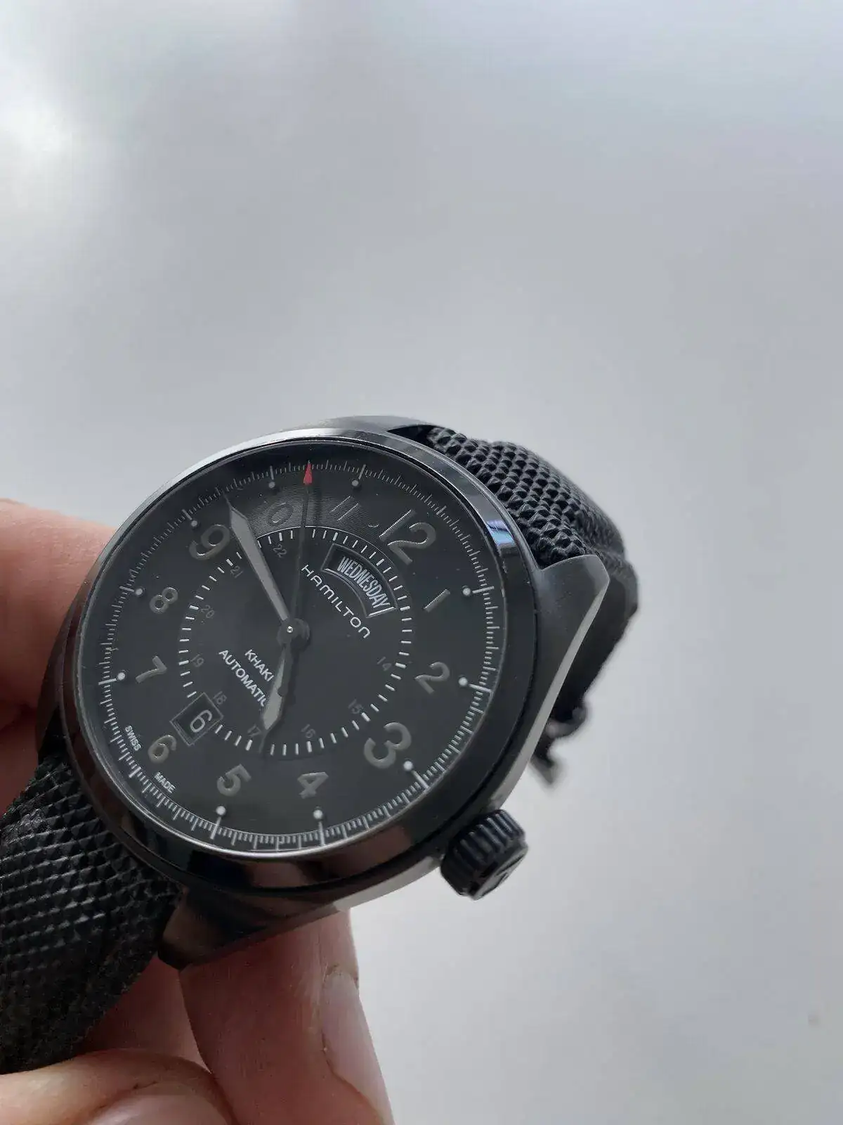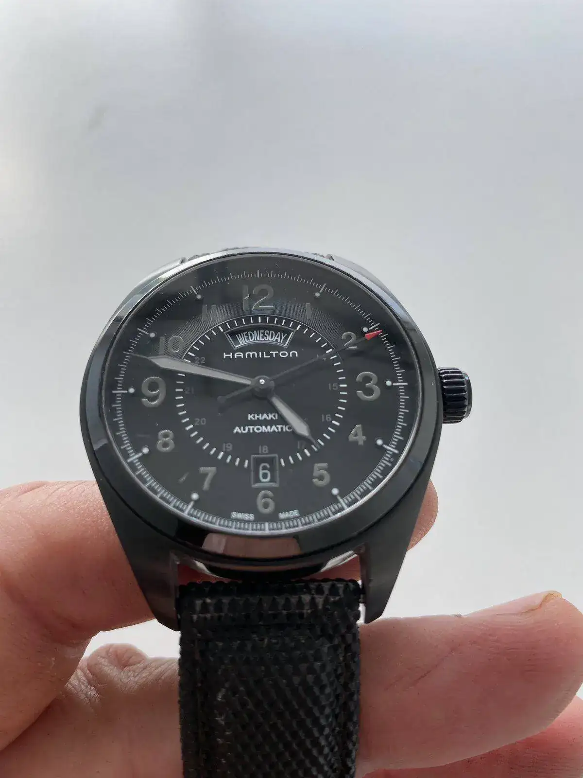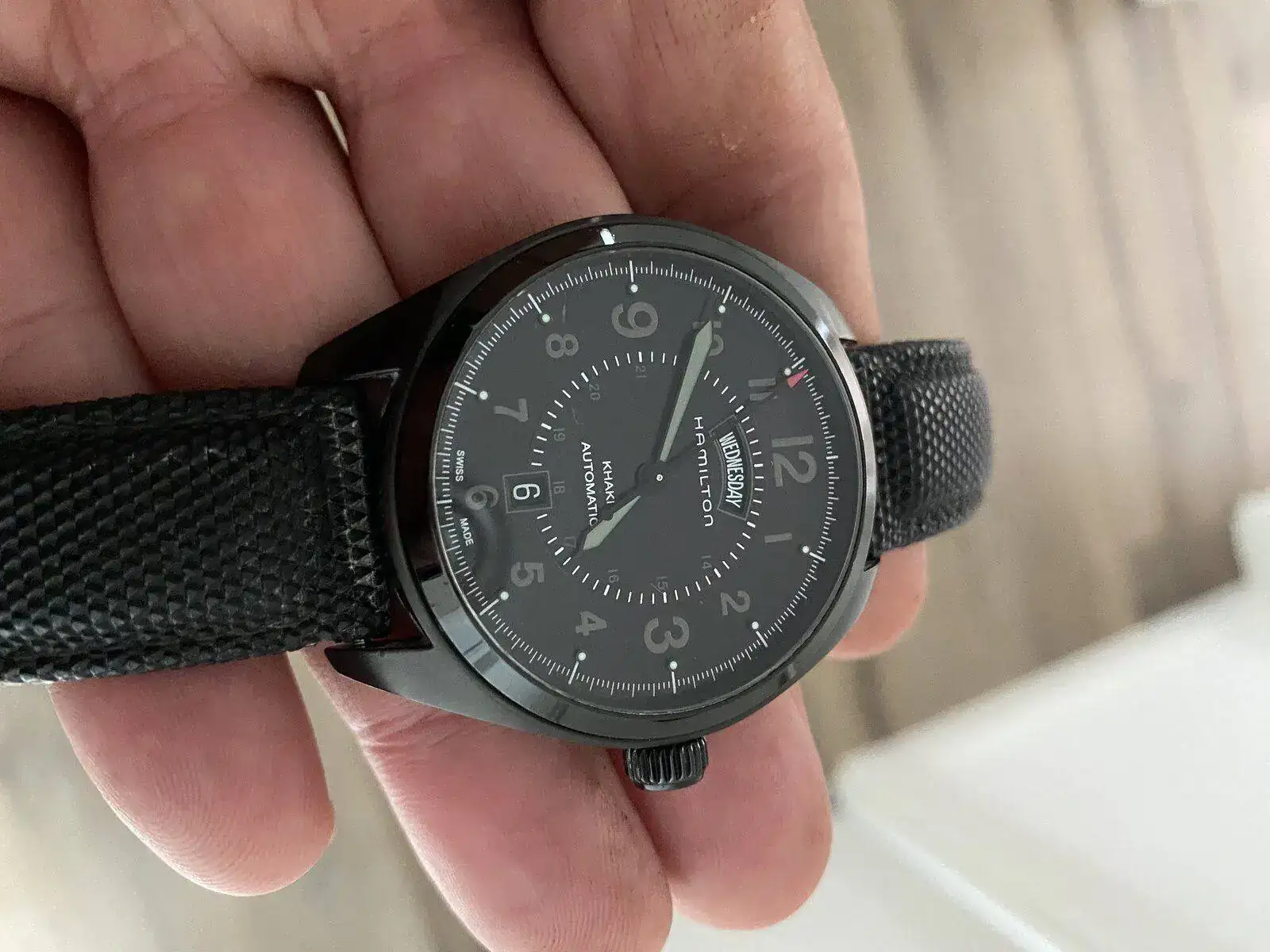 saco a venta este Hamilton Khaki day date con el espectacular calibre H 30 de Hamilton con 80 horas de reserva de marcha, su pvp es de 975€, 42 mm sin contar corona , cristal de zafiro, acero PVD solo presenta algún micro pelillo en el bisel cualquier cosa que se pueda ver en las fotos blanco es la foto por eso he hecho varias en distintas posiciones para que se vea que no tiene nada; solo tiene la correa desgastada pero regalo otra aftermarket de alta calidad sin estrenar solo reloj sin caja ni papeles acepto entrega en cualquier concesionario Hamilton en Barcelona sin cambios por favor muchas gracias saludos
