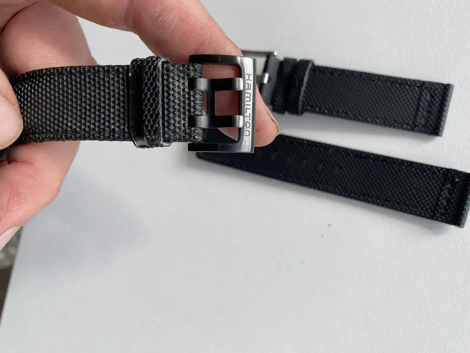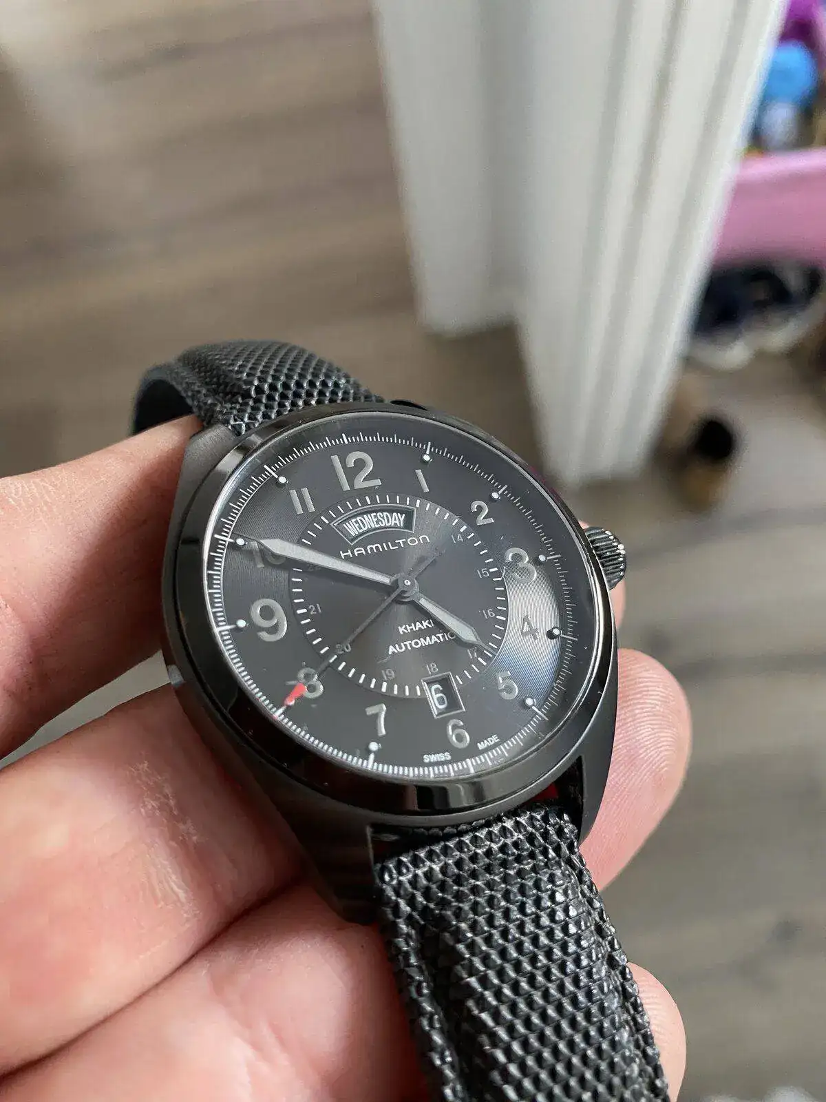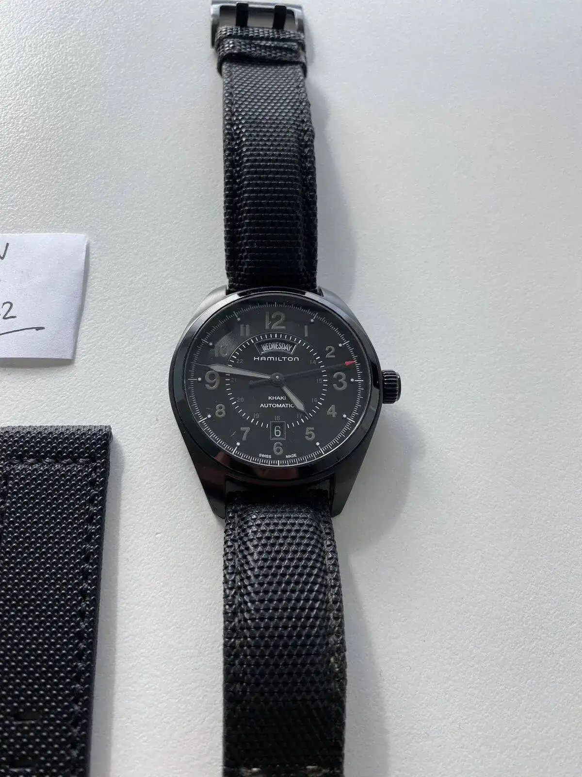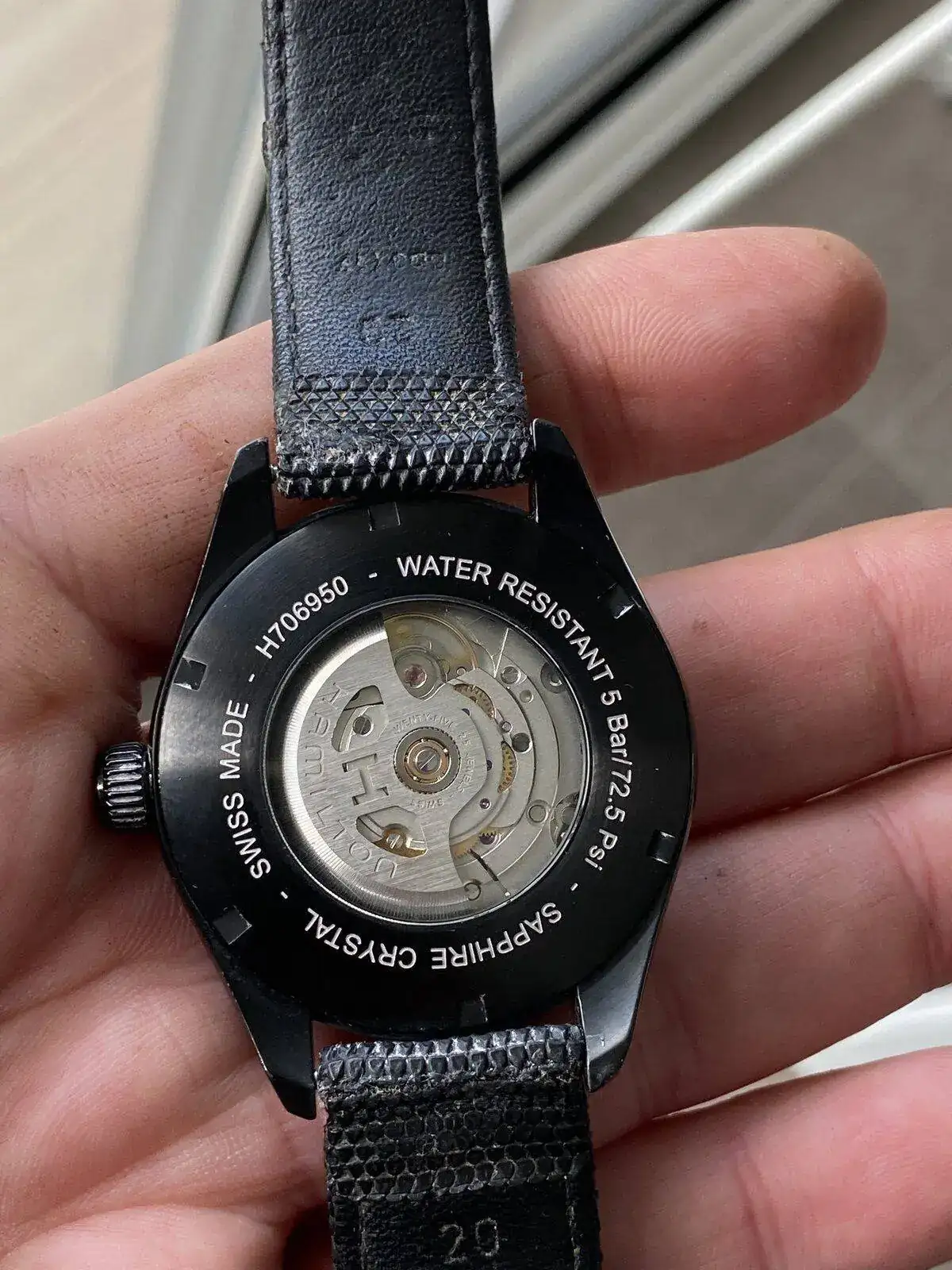 saco a venta este Hamilton Khaki day date con el espectacular calibre H 30 de Hamilton con 80 horas de reserva de marcha, su pvp es de 975€, 42 mm sin contar corona , cristal de zafiro, acero PVD solo presenta algún micro pelillo en el bisel cualquier cosa que se pueda ver en las fotos blanco es la foto por eso he hecho varias en distintas posiciones para que se vea que no tiene nada; solo tiene la correa desgastada pero regalo otra aftermarket de alta calidad sin estrenar solo reloj sin caja ni papeles acepto entrega en cualquier concesionario Hamilton en Barcelona sin cambios por favor muchas gracias saludos
