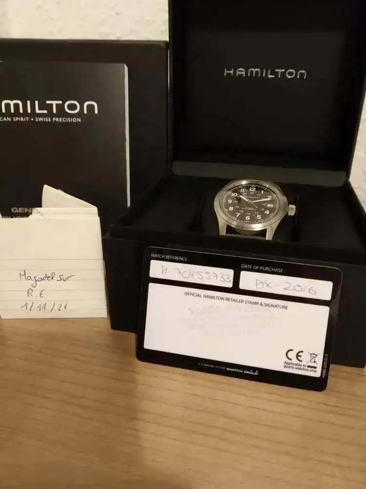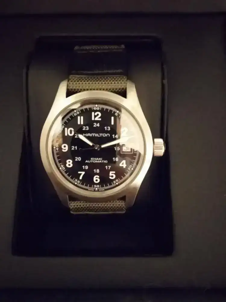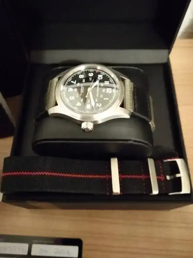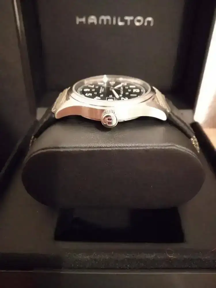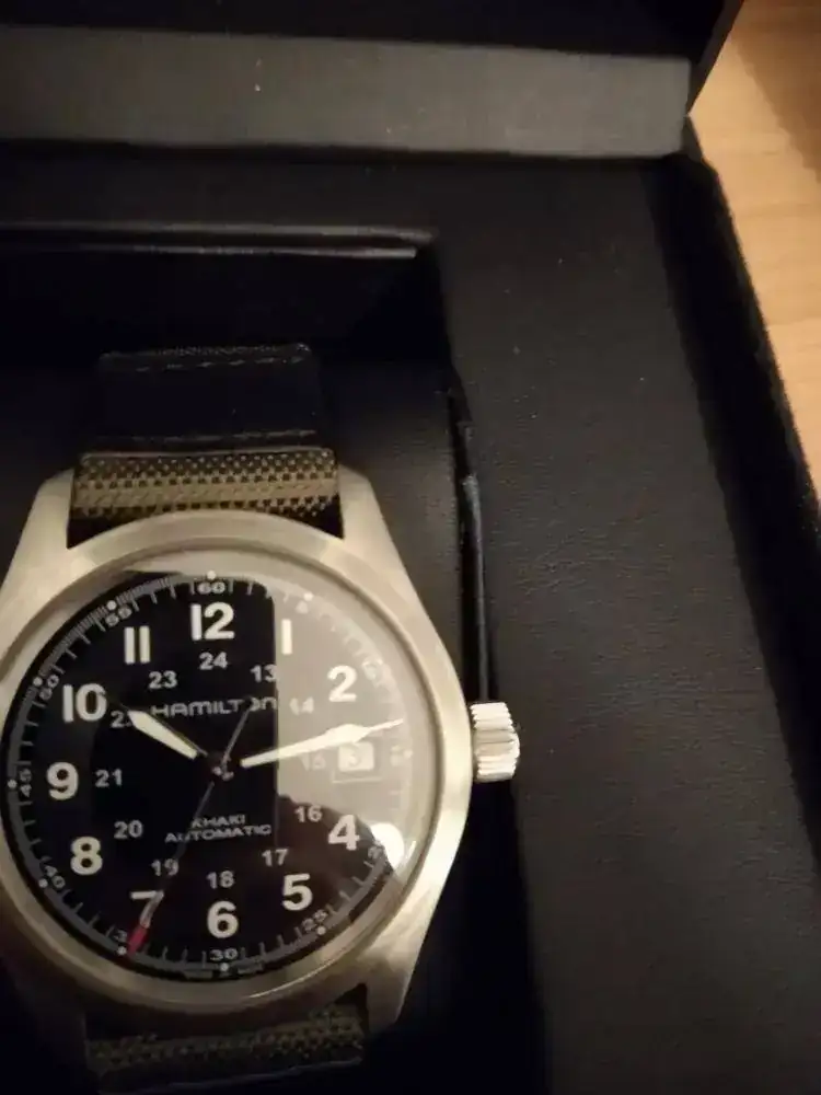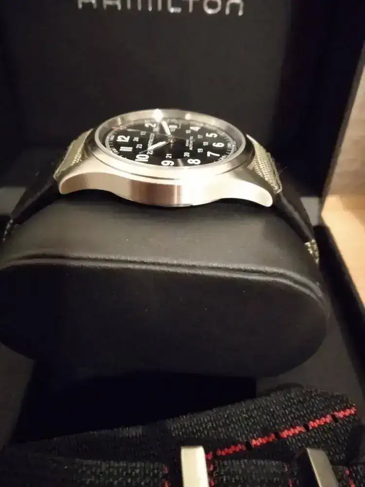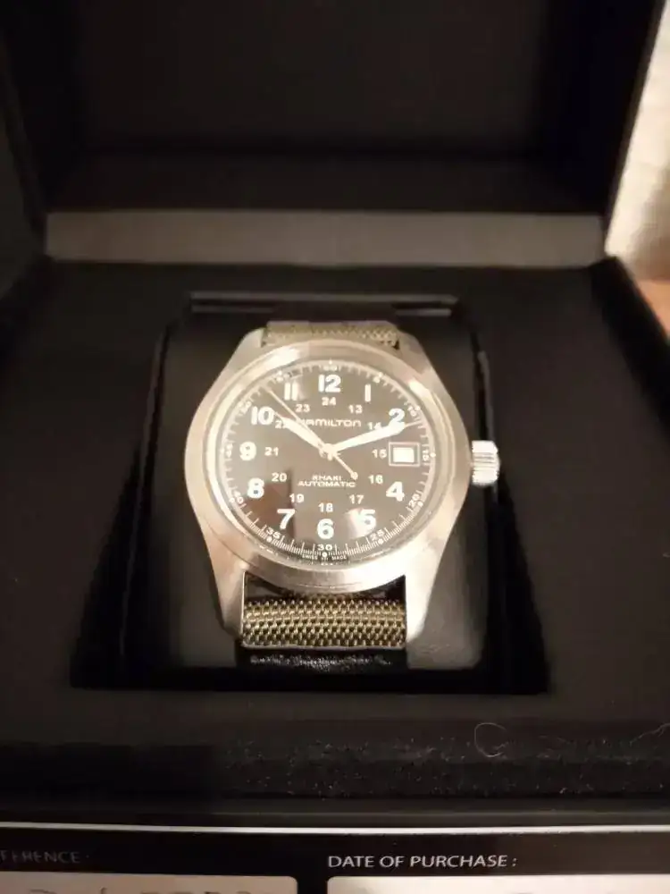 Hola compañeros, en esta ocasión por motivos de fuerza mayor saco a la venta mi Hamilton khaki field 38 mm, el reloj está en buen estado tiene un pequeño roce en el asa de arriba derecha que he intentado reflejar, aunque apenas se ve. El reloj lo envío con toda su dotación, correa Canvas más una nato elástica.