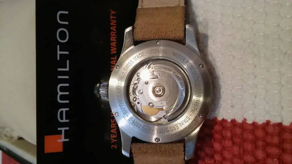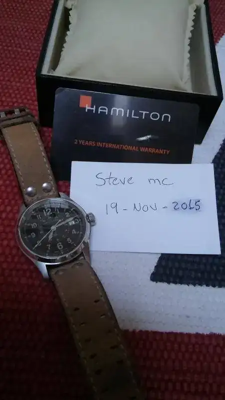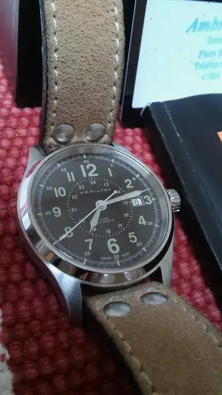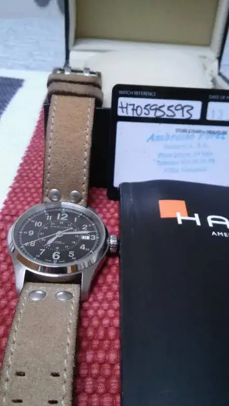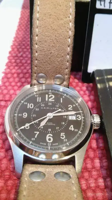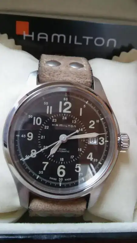 Comprado en Julio de este 2015, 40 mm. perfectos de caja, atomático, cristal de zafiro, con esa esfera de patina envejecida que enamora, con su documentacion y toda la garantia por delante, sin caja (la regale antes de tiempo) entrego una genérica. El Hami tiene 4 ó 5 puestas esta impecable.