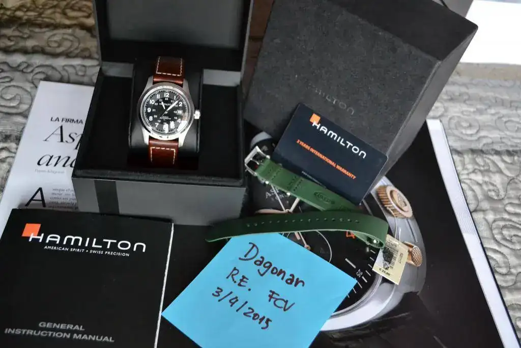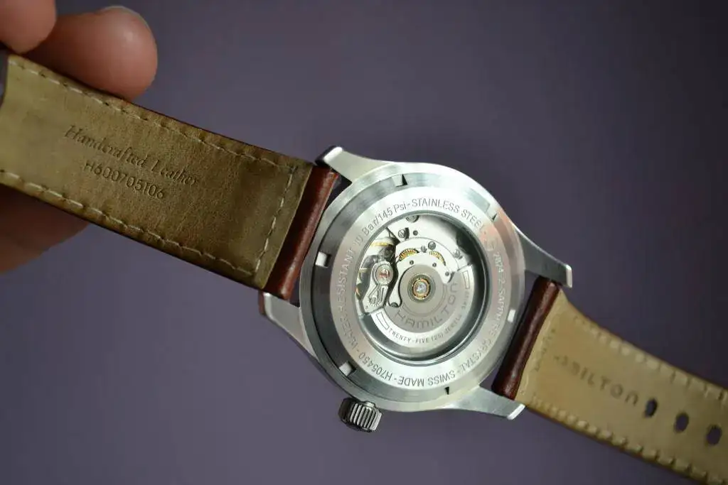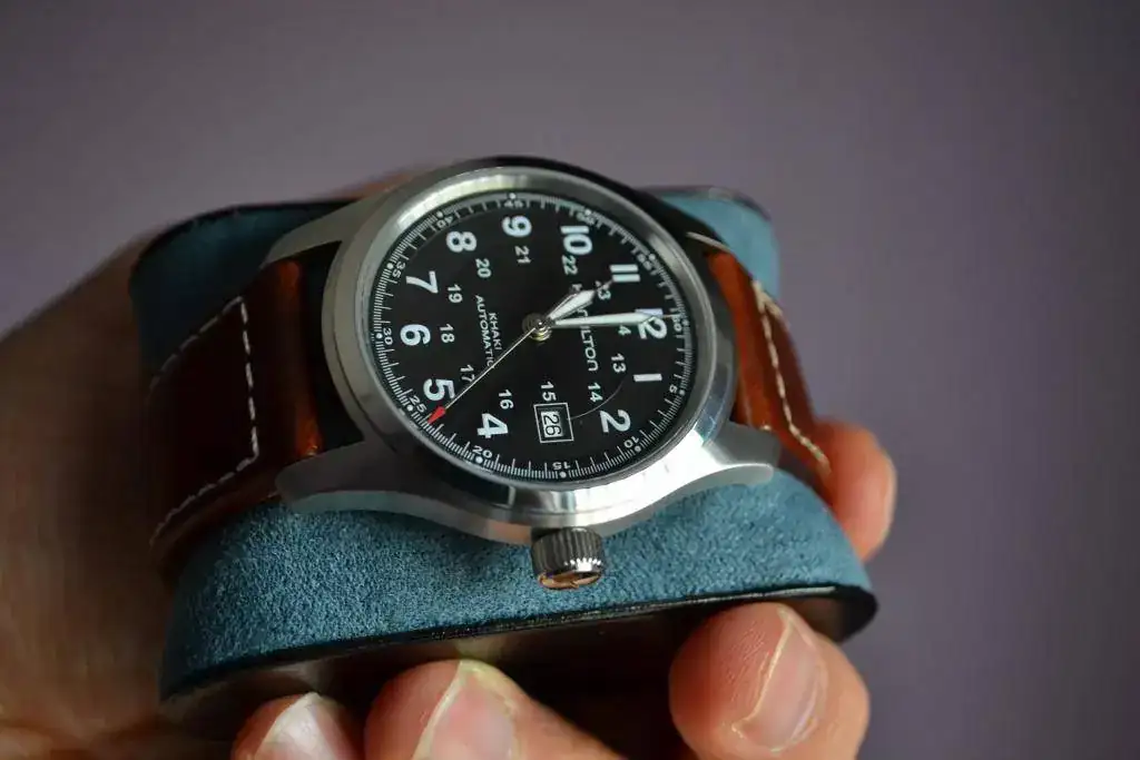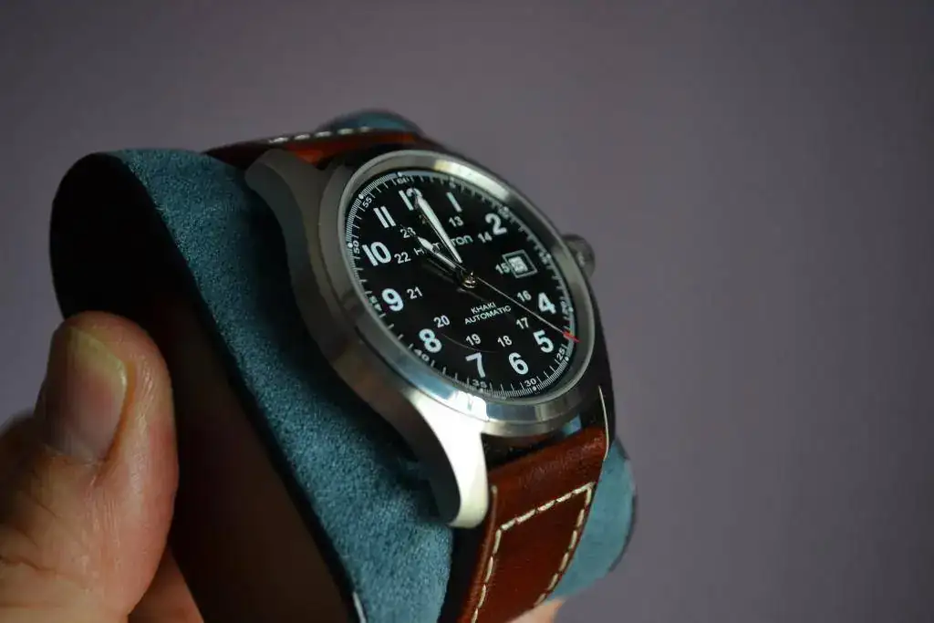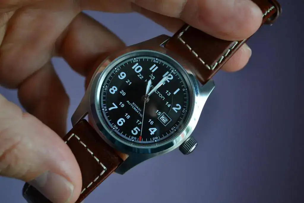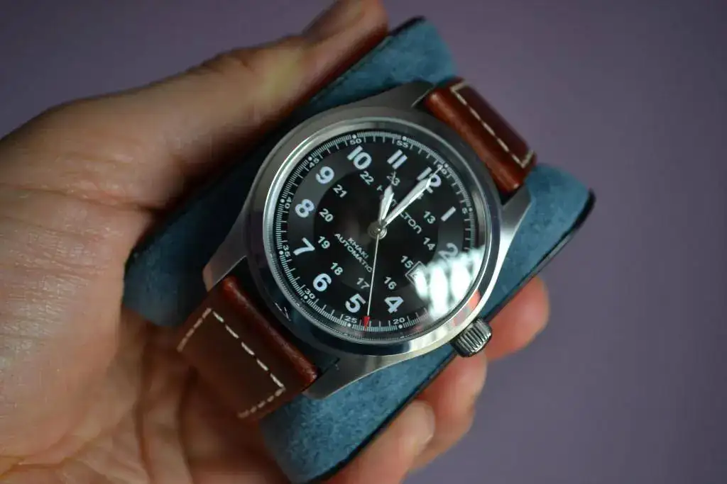 Hamilton Khaki Field de 42 con su correa de piel marrón.