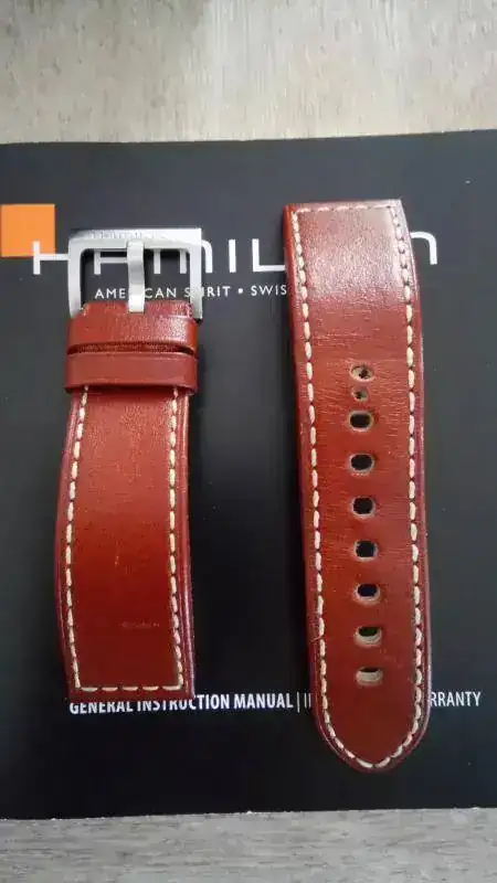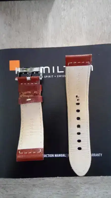 Lo entrego con la correa original, de bastante mala calidad, y que apenas he usado (le hice dos agujeros para adptarla a mi muñeca), y con una Hirsch James, con forro de caucho ideal para el verano, que es infinitamente mejor que la original y que está nueva a estrenar. Decir también que la correa original me vino con la trabilla que va suelta pegada a la correa junto a la fija, por eso se ve el cuero deteriorado en esa zona, porque la despegué para que pudiera ir libre. Va con toda su dotación, caja, papeles y libreto. Por lo demás creo no me dejo nada. Lo mando por Nacex y el envío está incluido en el precio. Para este reloj NO quiero cambios, para cualquier cosa un privado.