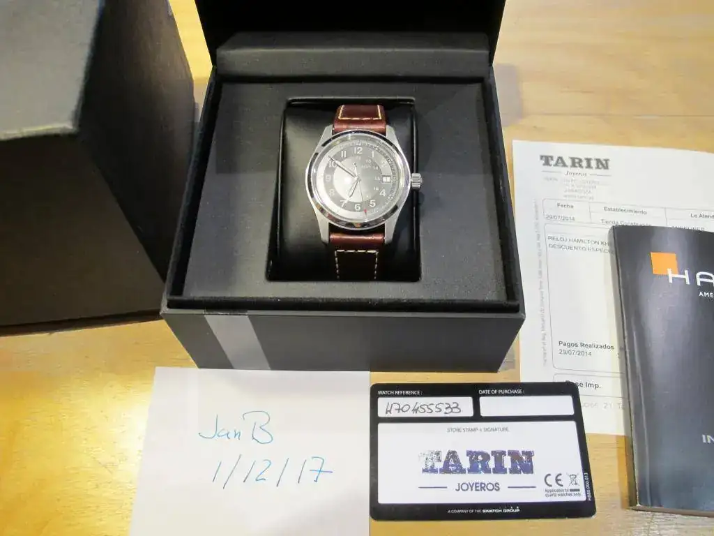 Se entrega con sus cajas originales (la de cartón exterior un poco estropeada), manual y factura de compra. La correa de piel original está casi sin uso.