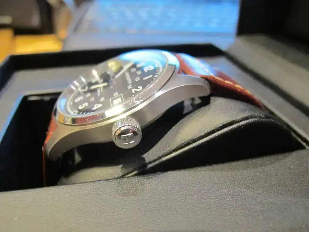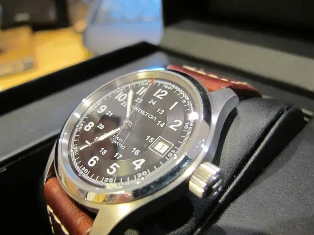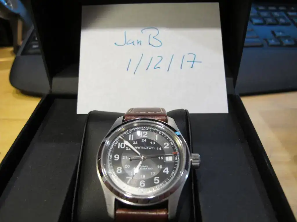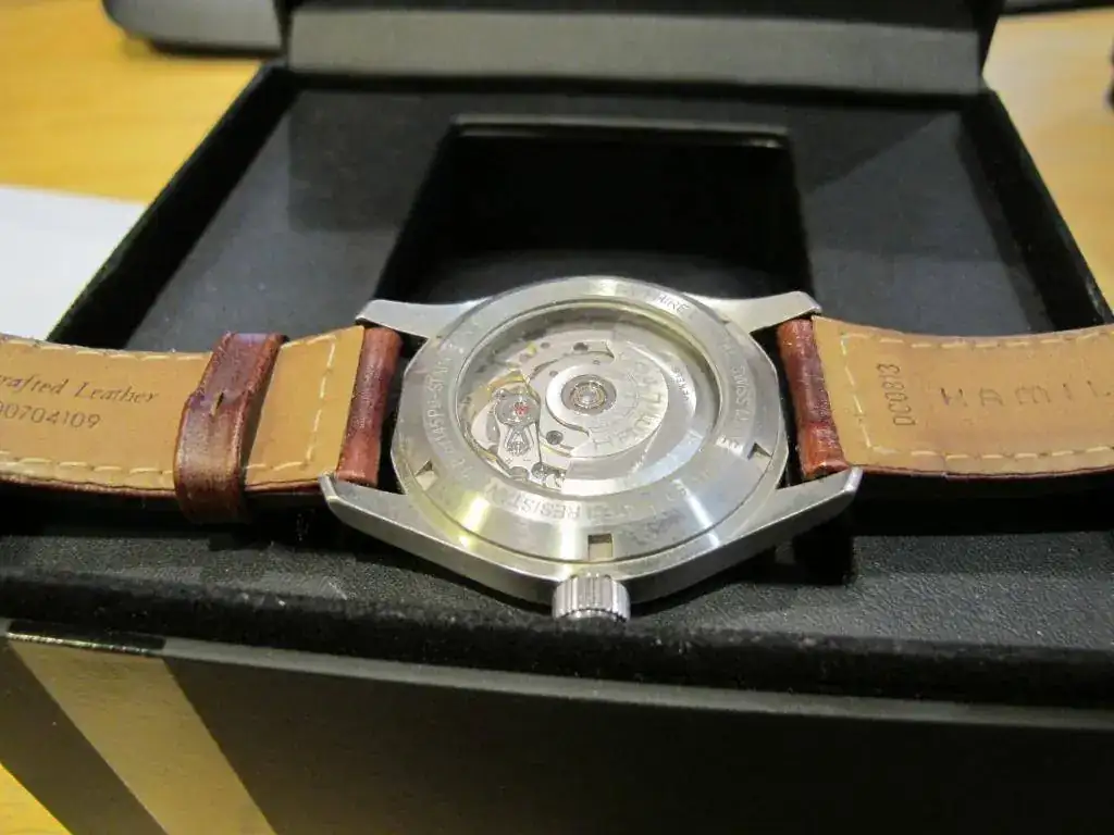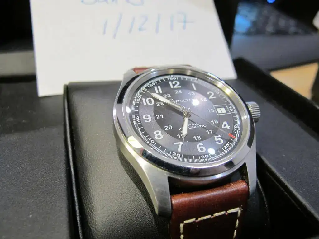 Se vende Hamilton Khaki automático de 38mm esfera negra, cristal de zafiro, fondo visto, usado en buen estado.