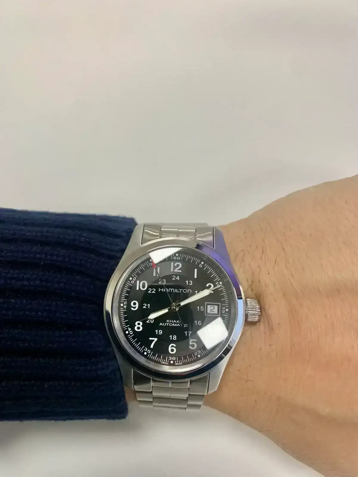 La verdad es que estoy muy satisfecho de la elección, quería homenajearme con un reloj que fuera un must en cualquier colección, y creo que elegí bien con este Hamilton. La caja de 38mm pega muy bien con mi muñeca de tamaño contenido, si le añadimos un peso de 135g, tenemos como resultado un conjunto muy manejable y llevadero que convierte el Khaki en un daily watch, un field watch y con la pulsera de acero, incluso en un reloj deportivo.