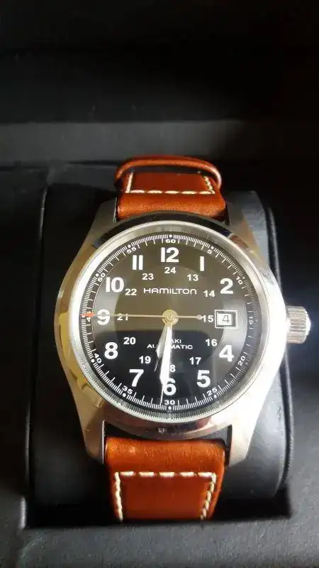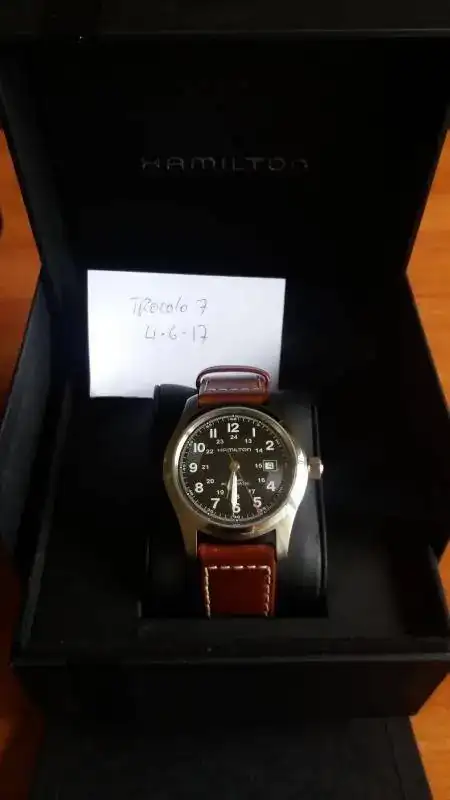Buenas tardes. Vendo o cambio Hamilton Khaki auto de 42 mm en un estado muy muy bueno. Adquirido a un compi del foro no hace un mes (soy su segundo dueño), está en un estado realmente bueno, funcionando rozando parámetros cosc. Tiene leves marquitas, inevitables por otro lado, de cambiar la correa y el armis, pero sin importancia. el zafiro impoluto. La correa está al 90% de vida, así que hay correa pa rato. Adjunto su armis original, apto para muñecas de hasta 18 cm. Va con su caja y libreto de instrucciones. No está en garantía. Para cambio fundamentalmente Seiko Sumo Azul o Seiko Tortuga Azul y por lo demás, bueno, proponedme y si me gusta, hablamos, pero priorizo venta. Poco más que no sepamos puedo decir de él, así que voy con el cuadro y fotos.