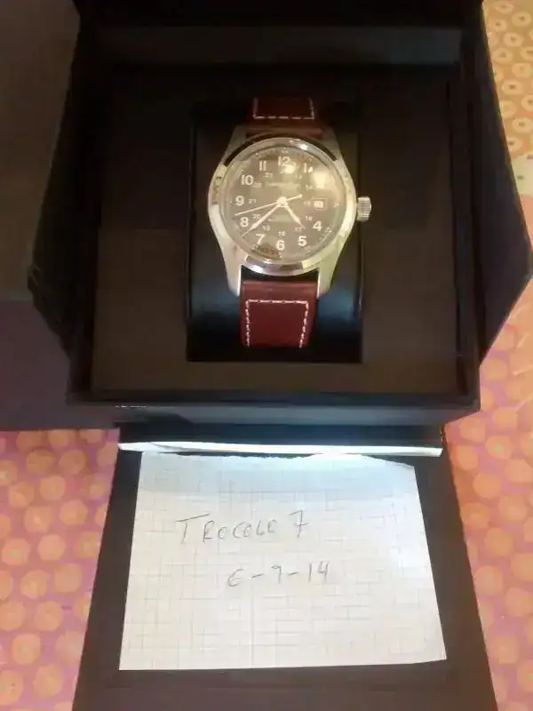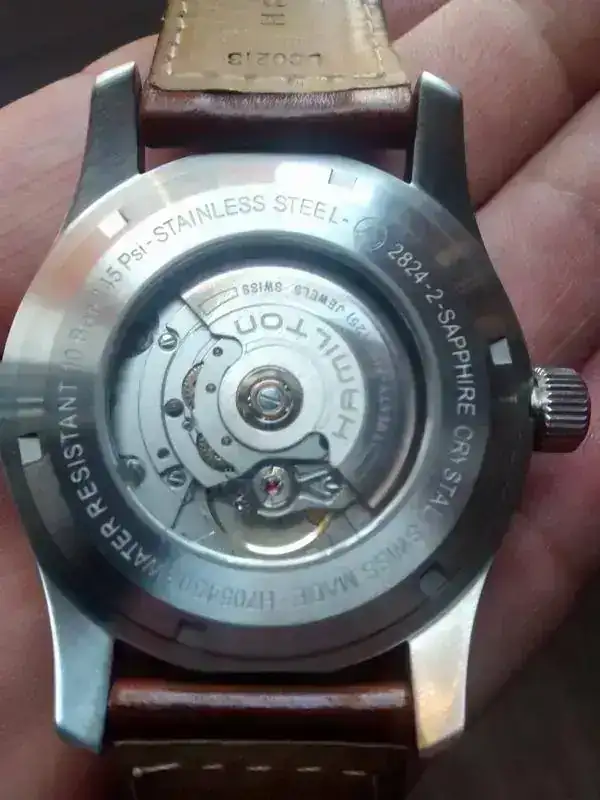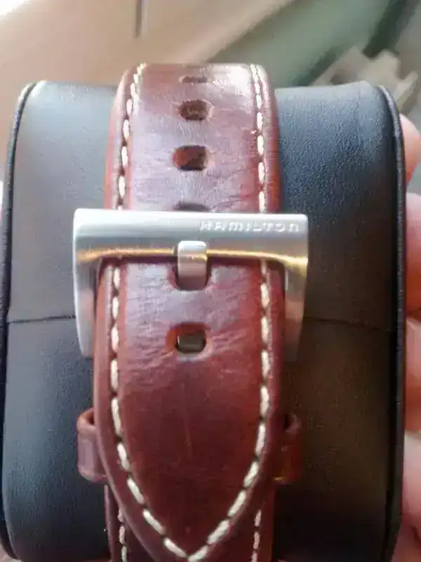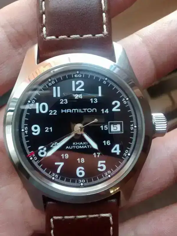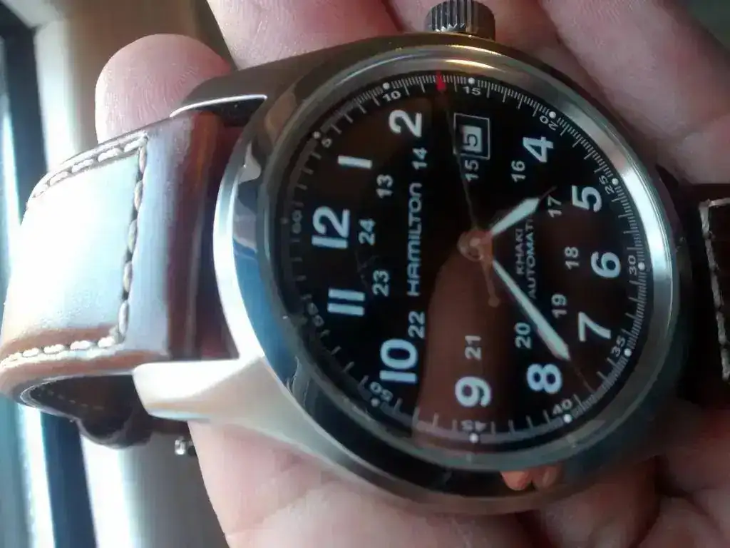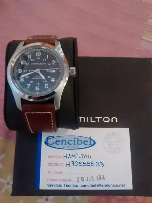 Hola, compañeros. Vendo mi Hamilton Khaki, en un estado inmejorable, reseñando solo un pequeño pelo en el bisel en las 12, que solo se ve a contraluz y he tratado de sacarlo en la foto sin éxito. No altera en absoluto su belleza y te olvidas de que está ahí, pero tengo que decirlo. Si veis rayas o cosas raras, son motas de polvo o huellas de mis dedos. Muy pocas puestas, un par de ellas desde que lo compré el 20/7/14 y con la garantía a tope. La caja es de 42 mm (45 con corona). Cristal zafiro y fondo visto. Su calibre, 2824.2, 25 joyas, parada de segundero y remonte manual, 38 horas de reserva de marcha, etc. Viene completo, con sus dos cajas, exterior e interior y documentación.