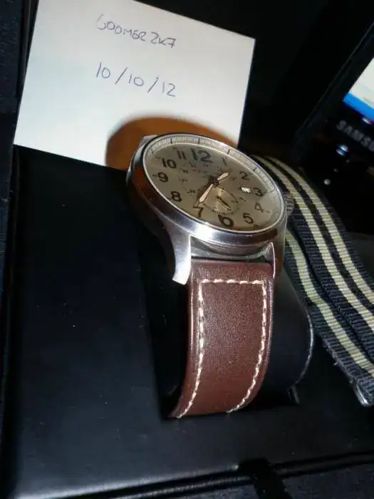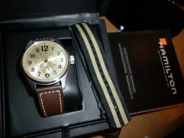Pongo a la venta un Hamilton KhakiField Officer Small Second H70655723, con dial en color champán y laventanita “small seconds” a las 6. Está en perfecto estado, yaque ha tenido pocas puestas. Sólo destacar un leve “pelillo” enel acero del asa superior izquierda.