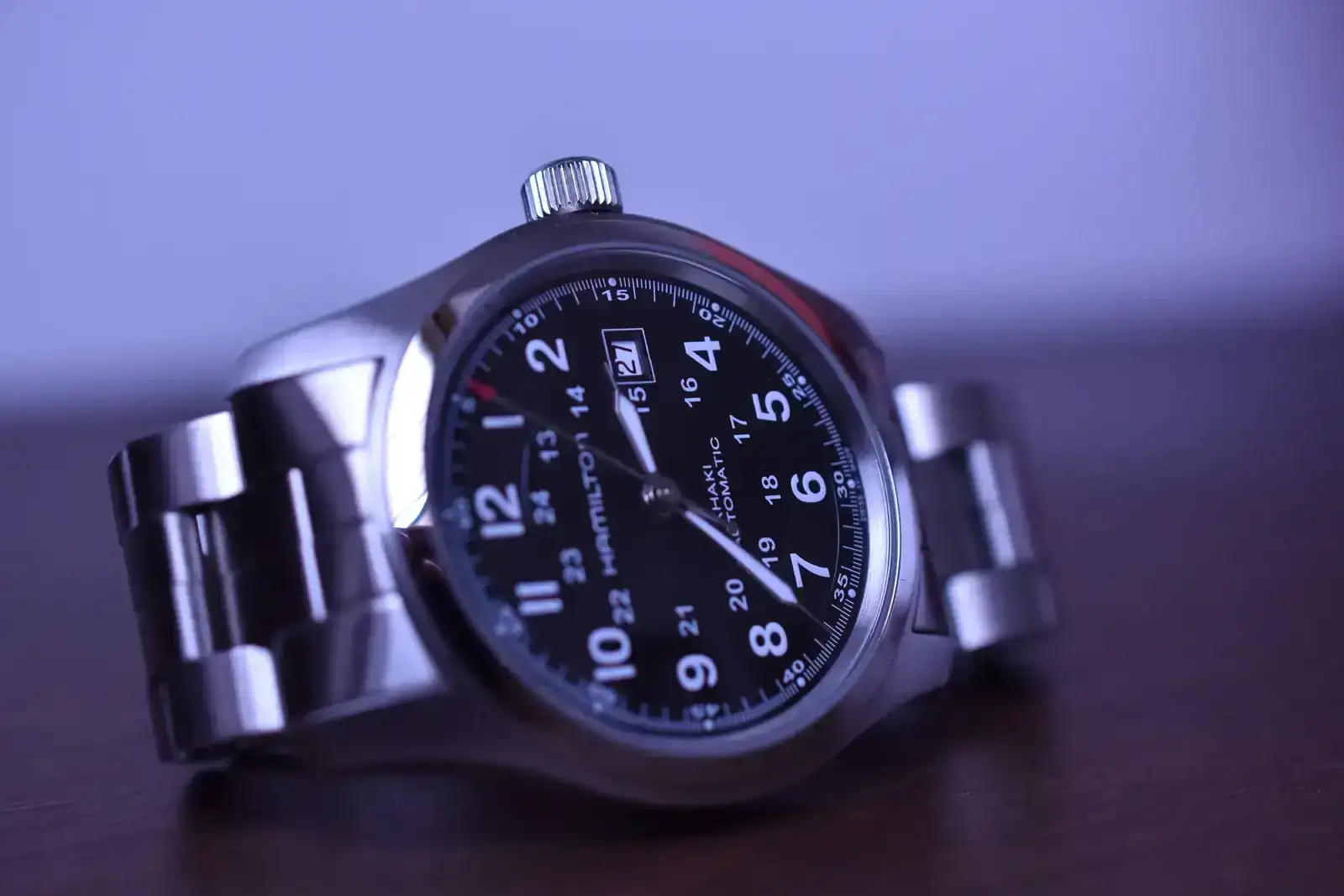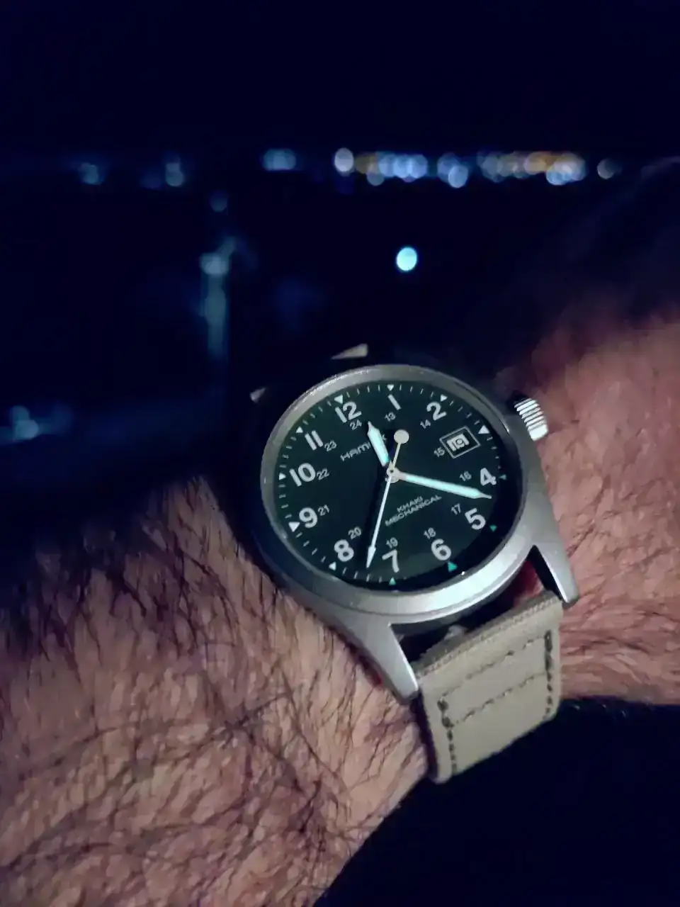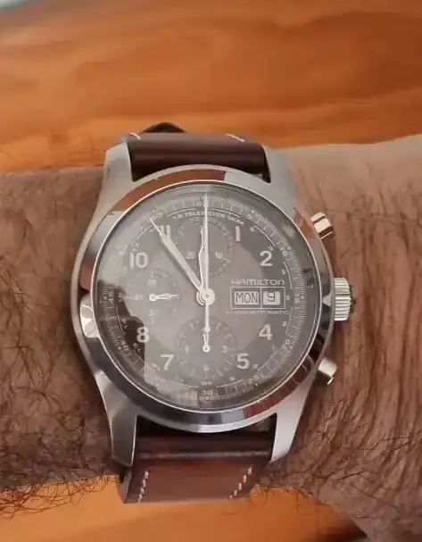 el tratamiento antirreflejo en muchos Khaki Field actuales es o inexistente o muy limitado (normalmente solo interno) y aquí Hamilton juega un poco a la ambigüedad romántica y, a mi entender, se equivoca. Por un lado, se sugiere fidelidad histórica, sí, pero por otro hay ahí un ahorro de coste disimulado. ¡Mister Hamilton, que aquí no nos chupamos el dedo! ¿Qué cuál es el resultado práctico de todo esto? Pues que, según el ángulo de luz que le esté dando a tu pieza, cuando vayas a mirar la hora no solo confirmas el minuto… también puedes repasar el estado general de tu cara y confirmar también que persisten esas ojeras de un trasnoche indisimulable. No es drama, pero, a la vista está, tampoco invisible. Y en un reloj cuya religión ha sido la legibilidad, uno podría pedir un poquito más de honestidad y de fe aplicada. Tenía que decirse y se dijo.