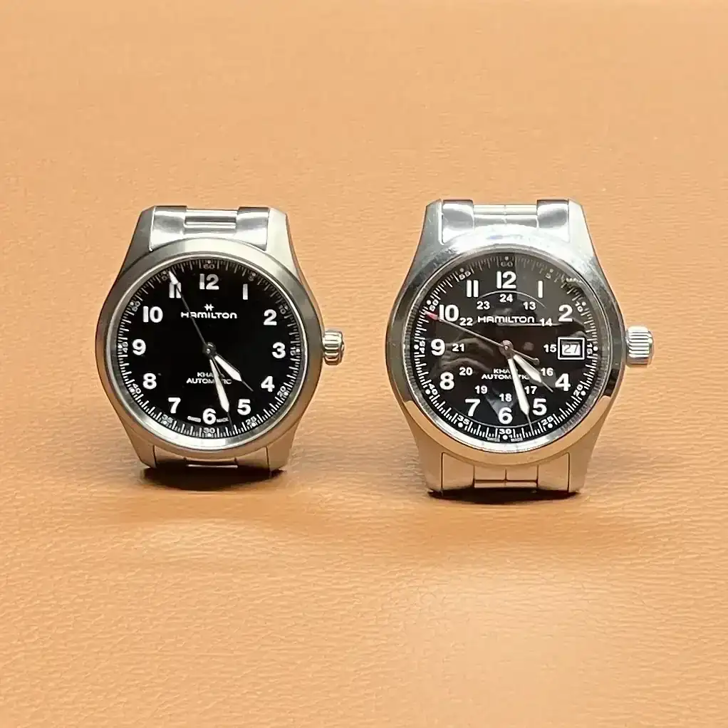 Hamilton de la 2ª GM (i) con caja de metal base cromado de unos 30-32 mm, con un bisel redondeado y prominente que ayuda a sellar el cristal de plexiglás abombado. Asas delgadas y curvas, diseñadas para pasadores de muelle. Corona de dimensiones generosas y estriado profundo para facilitar el remonte manual incluso con guantes. Todo antes de estandarizarse el dial negro, el segundero central y la caja mate. A su lado, un Khaki Field moderno de 38 mm.