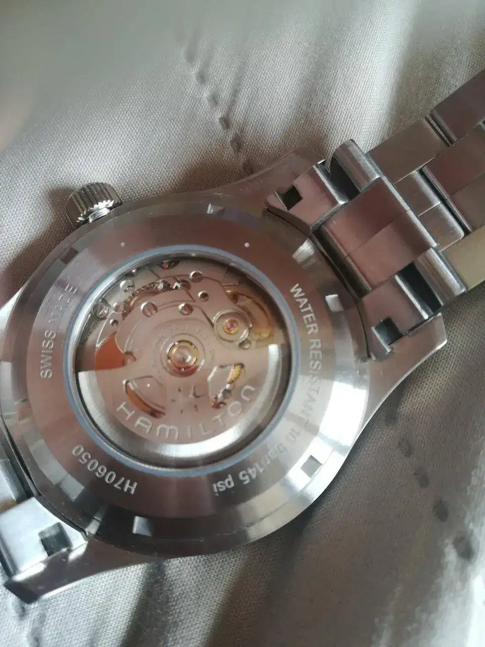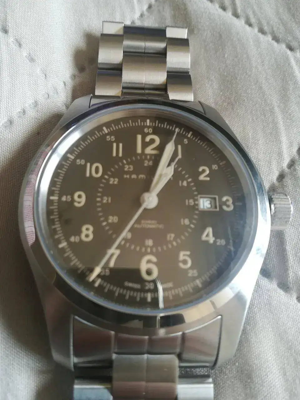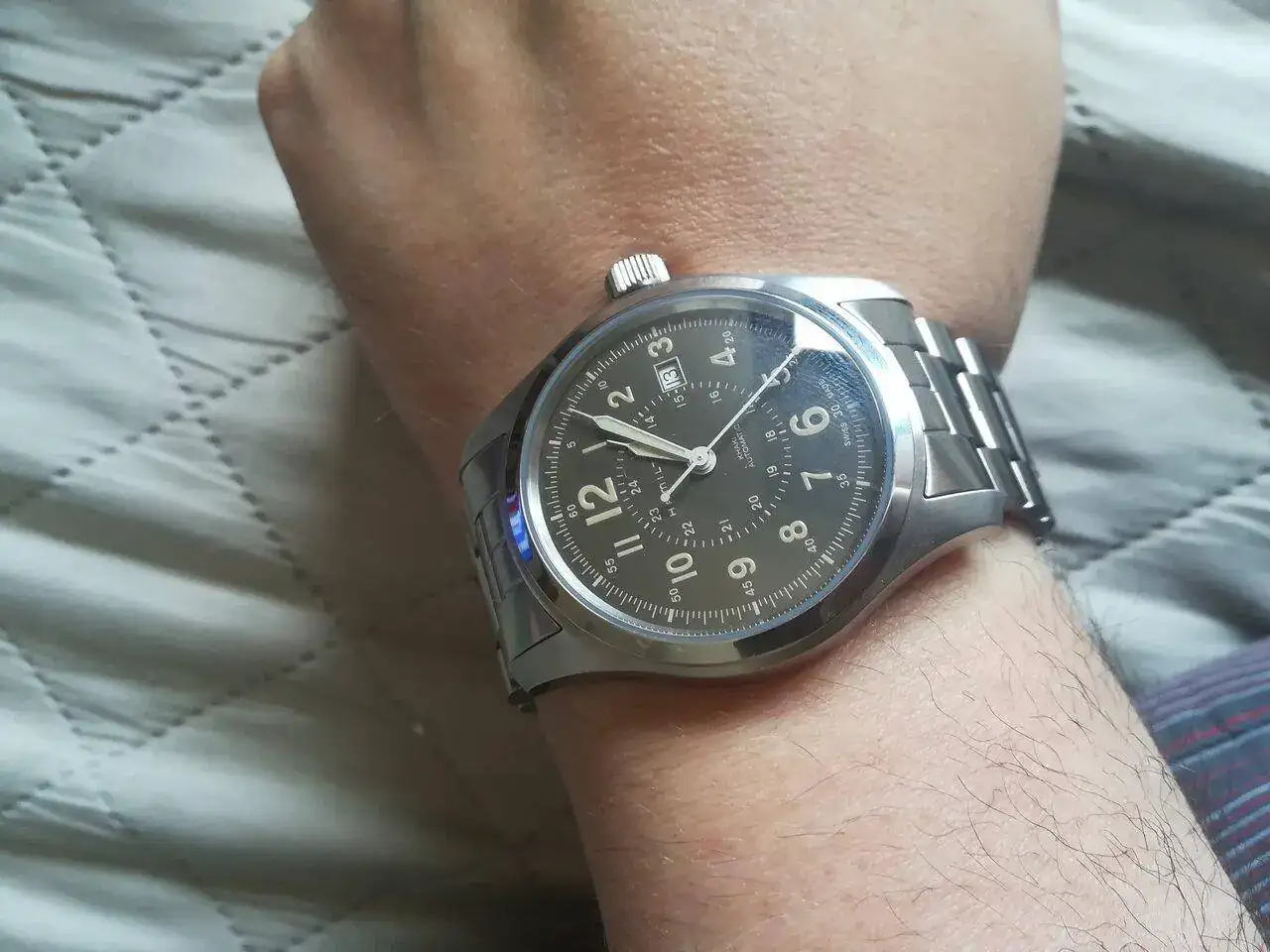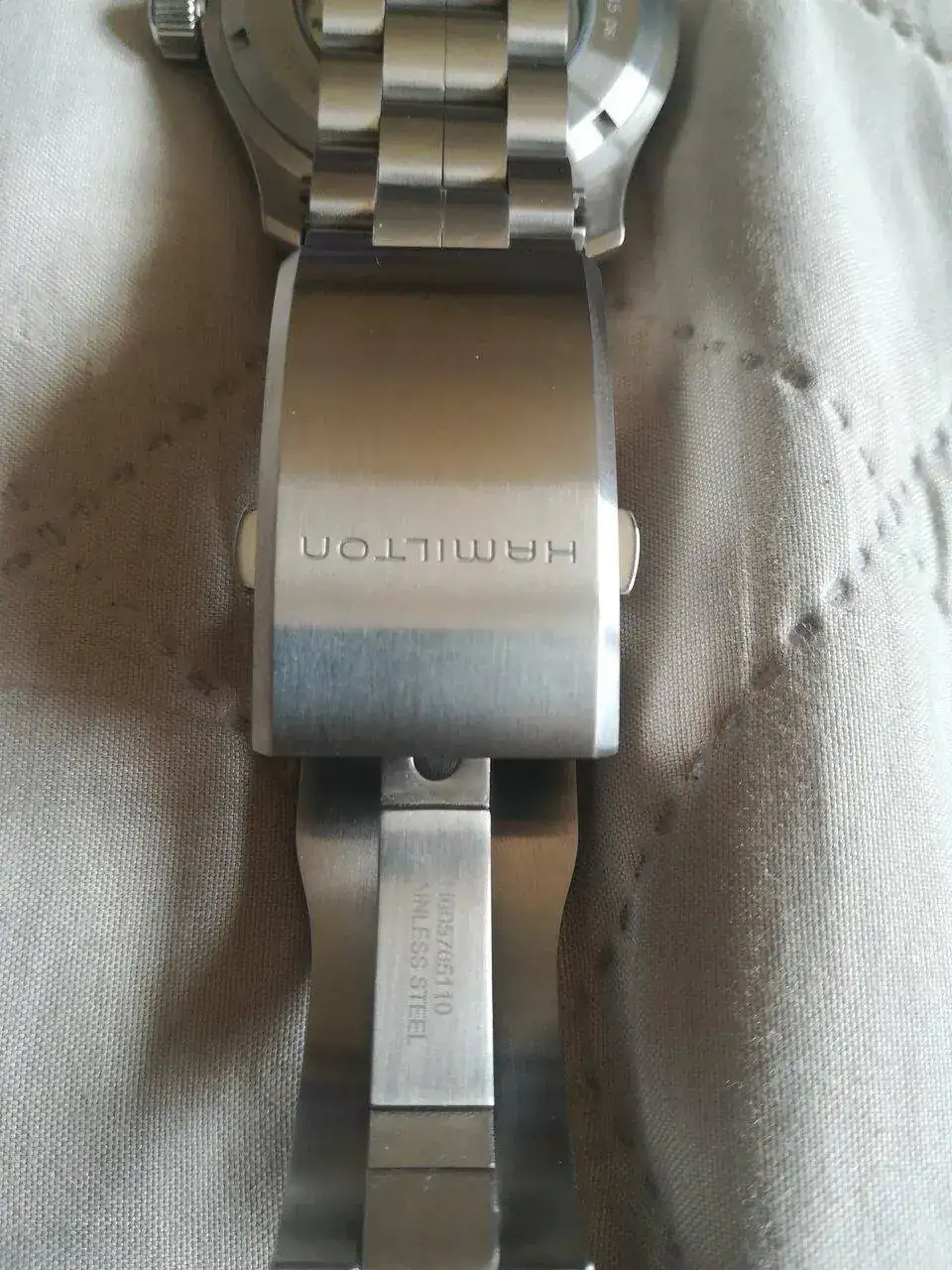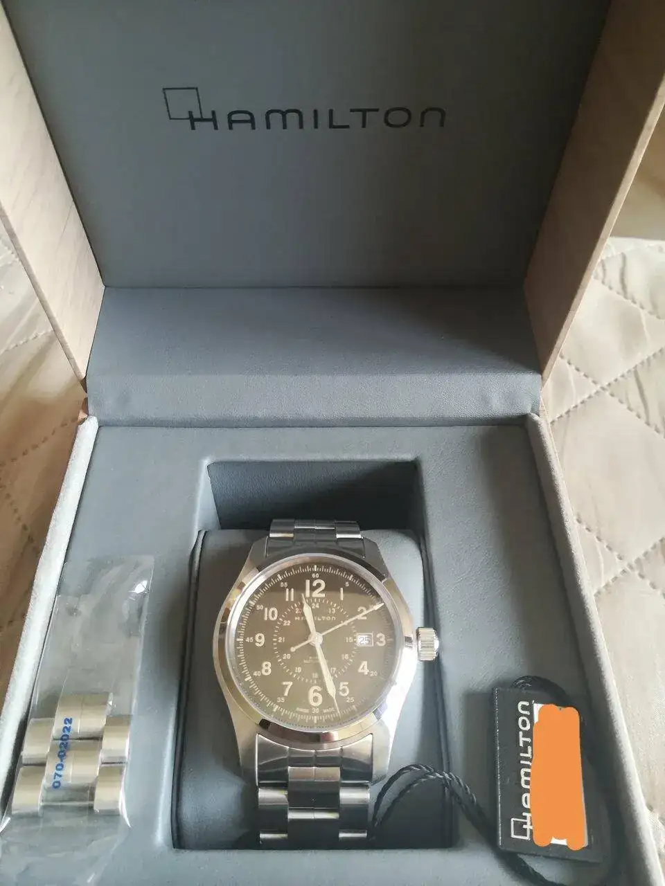 Pues el ejemplar en cuestión es un hamilton Khaki Field 42mm, quizás de 40 me hubiera quedado mejor por aquello del lug to lug de los Hamilton). El modelo en concreto es H70605193. La esfera es de un tono marrón oscuro con un punto verde.