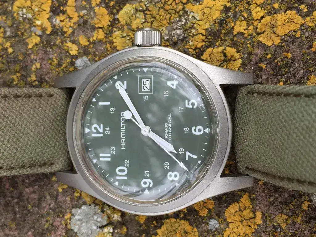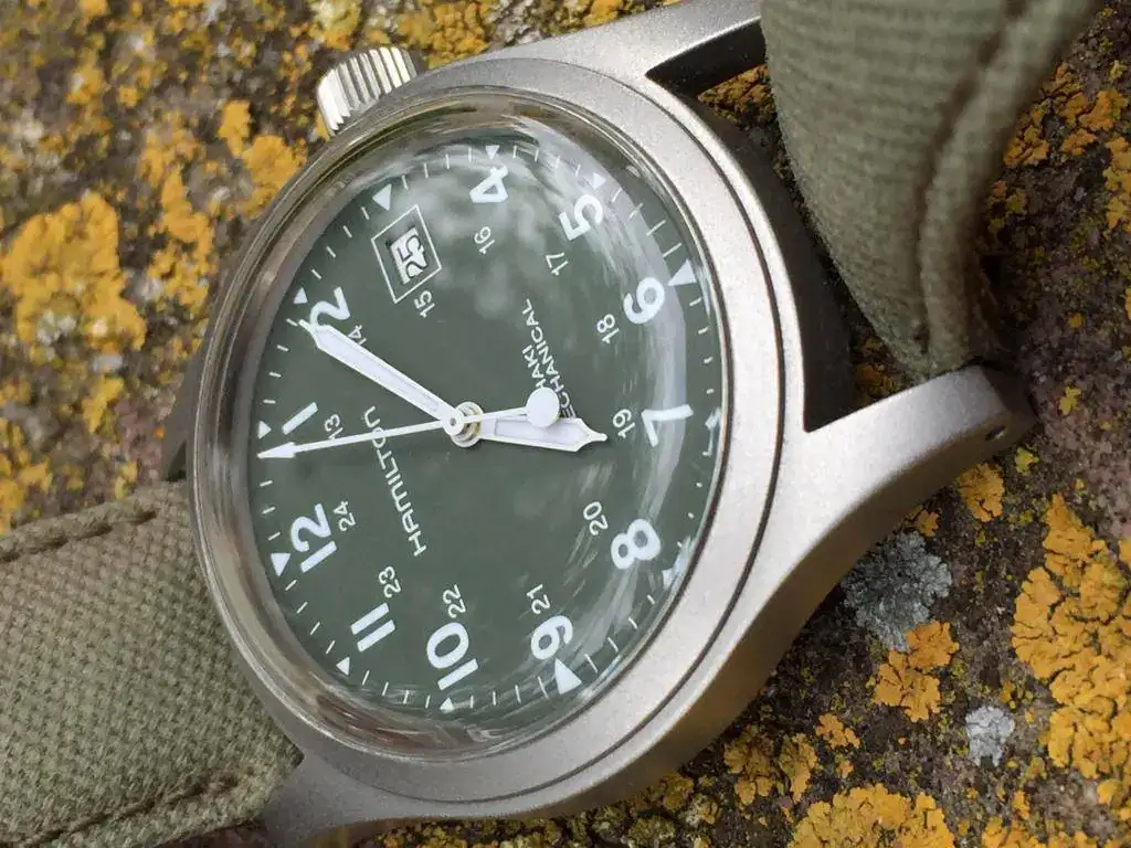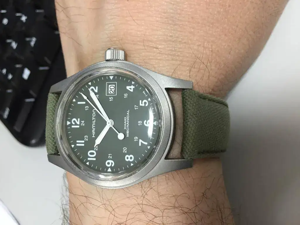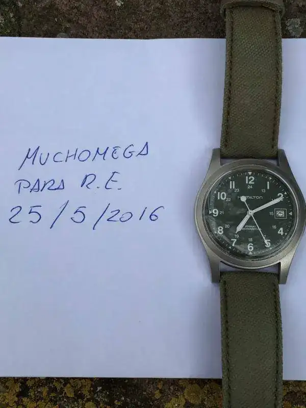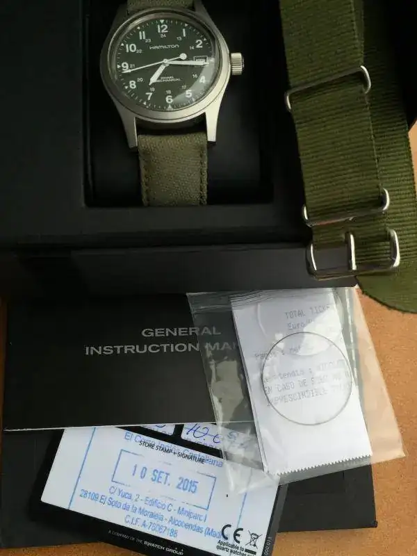 Comprado en el Corte Inglés en septiembre de 2015. En perfecto estado, la correa usada pero ponible, añado una NATO khaki de regalo. El reloj va montado con plexiglas, el anterior propietario le quitó el cristal de zafiro ya que le gustaba mucho más como queda y el aire retro que le da. No obstante, añado el cristal de zafiro original por si el que se lo lleve se lo quisiera volver a poner. Lo entrego con sus dos cajas, manual de instrucciones y tarjeta de garantía