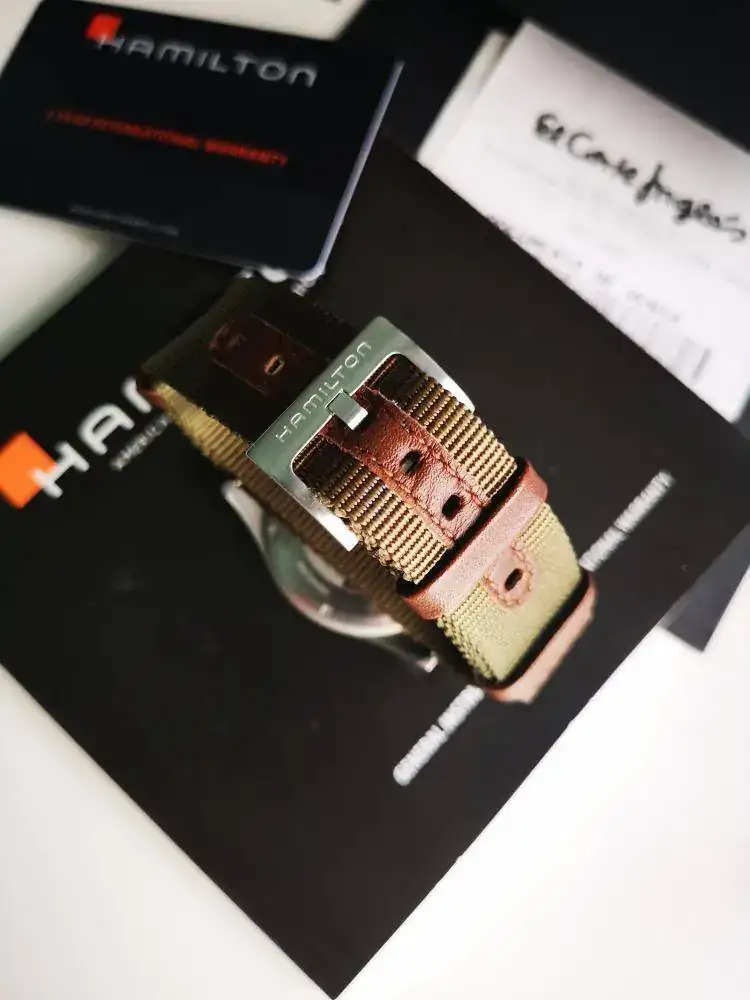 Es de 38 mm, Cristal de zafiro, movimiento mecánico de cuerda H694290 y bonita correa tipo nato en tela y piel.