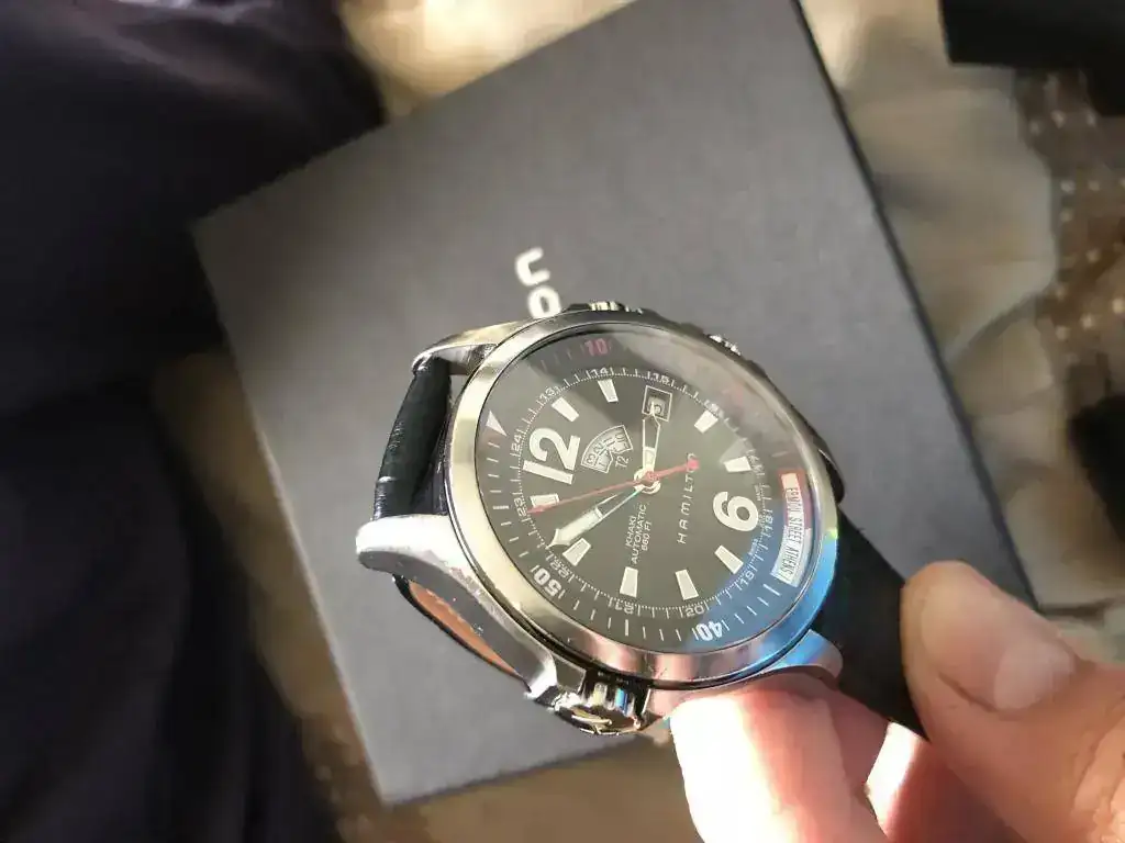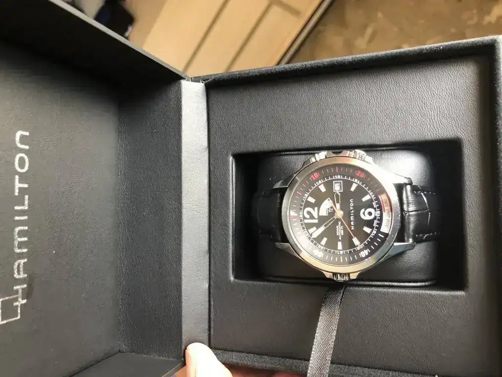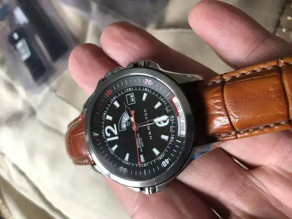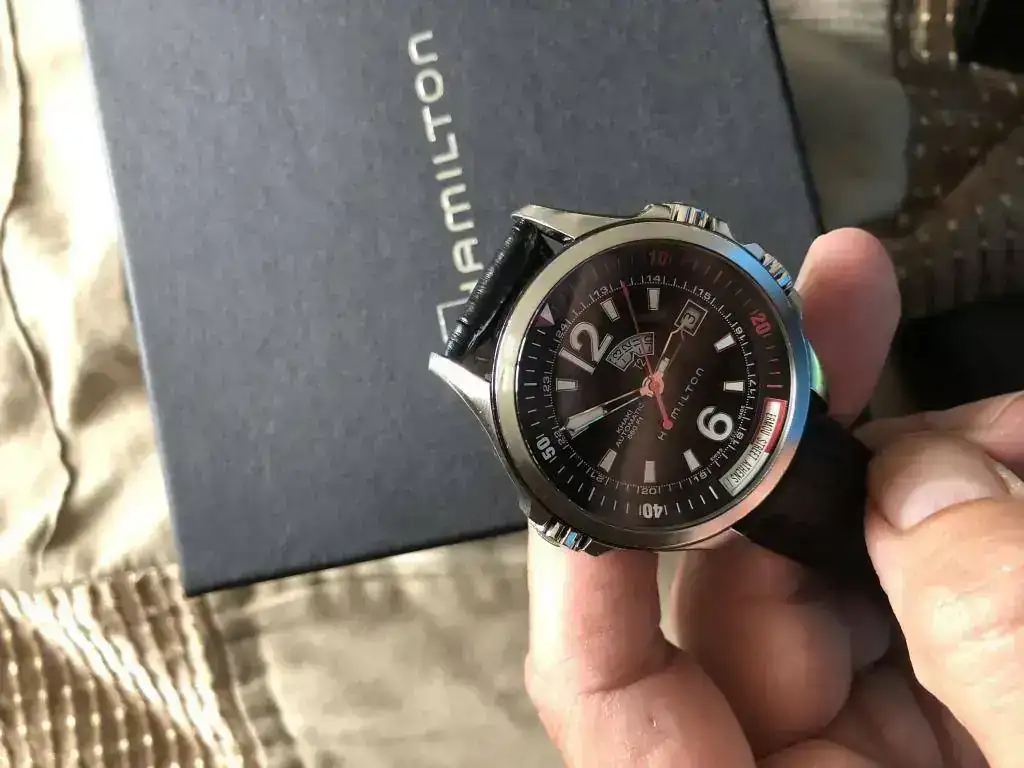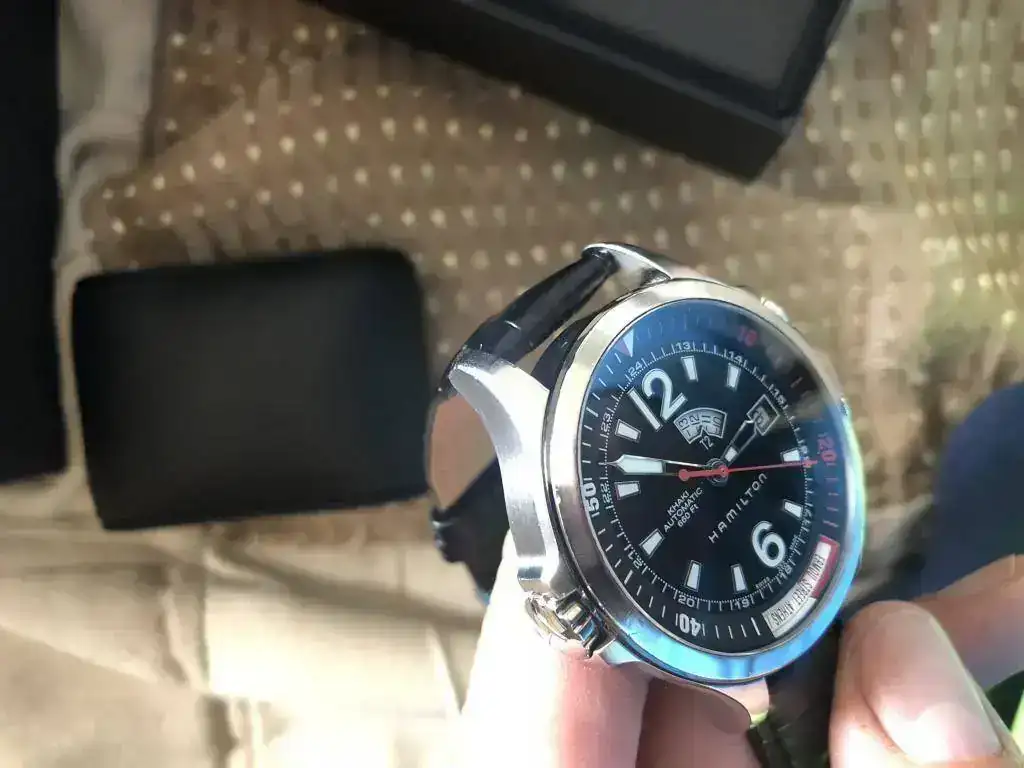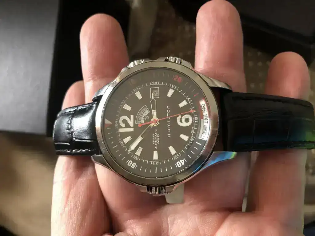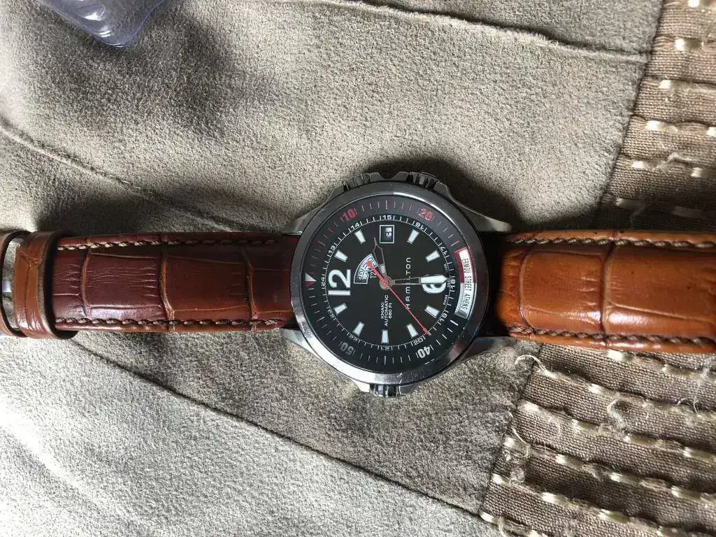Lo entrego con una correa de piel negra con deployante y una Hirsch gran duke marron con su hebilla Hamilton 100m water resistant. Ruego no cambios ni relojes a cuenta, muchas gracias