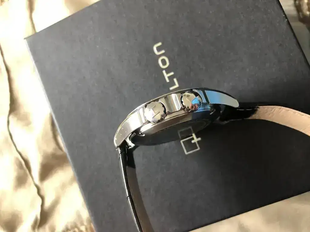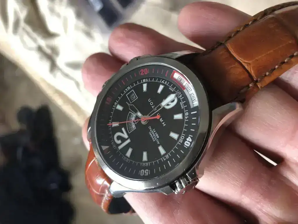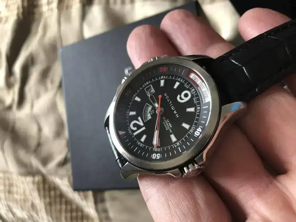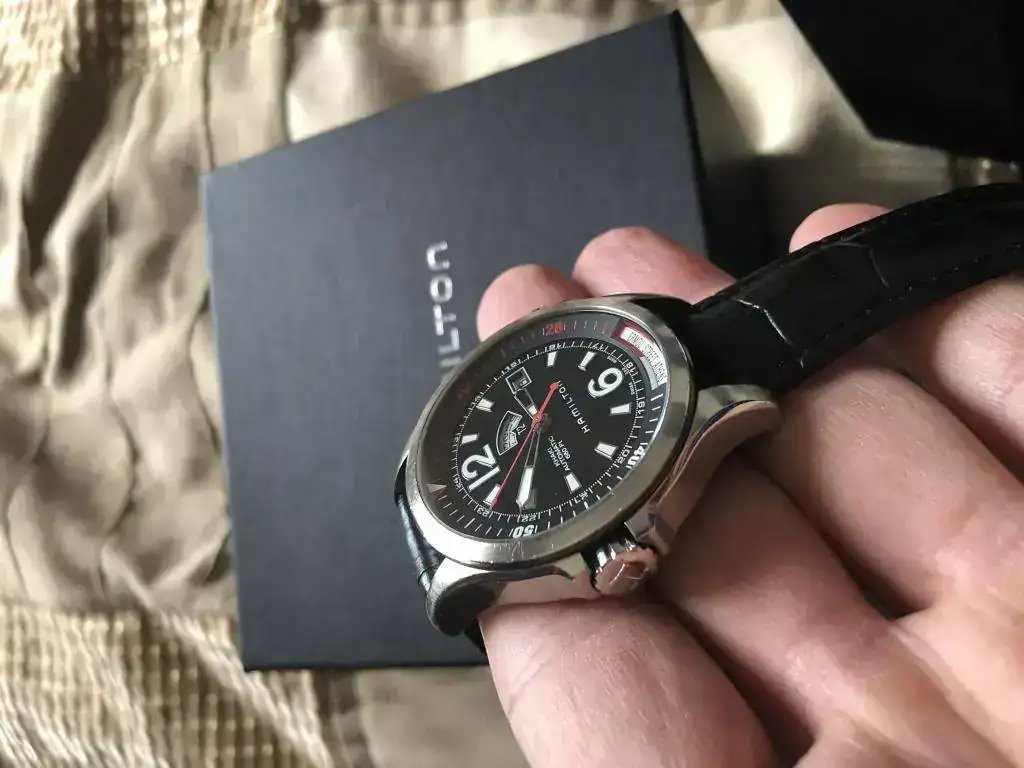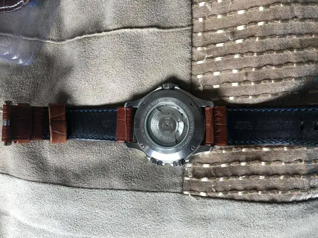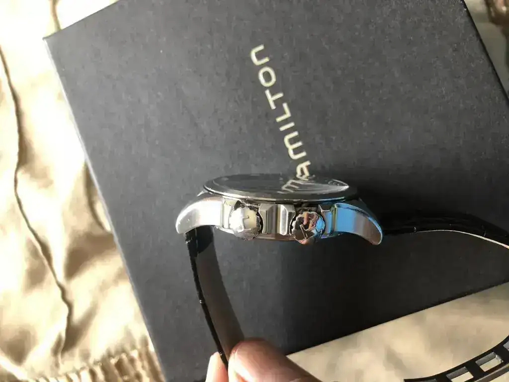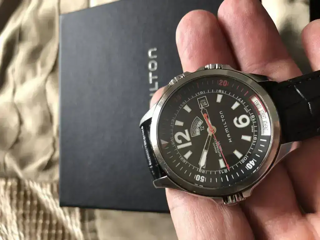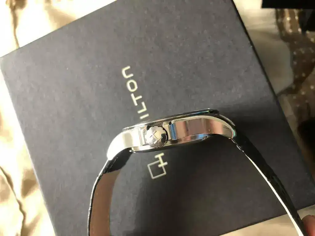 Lo entrego con una correa de piel negra con deployante y una Hirsch gran duke marron con su hebilla Hamilton 100m water resistant. Ruego no cambios ni relojes a cuenta, muchas gracias