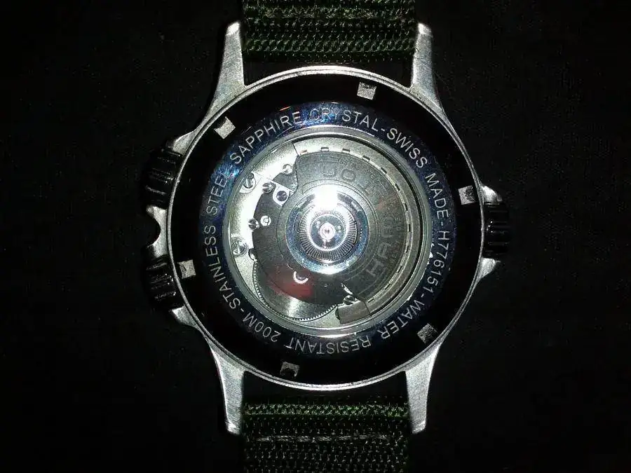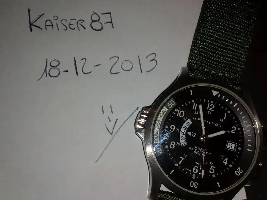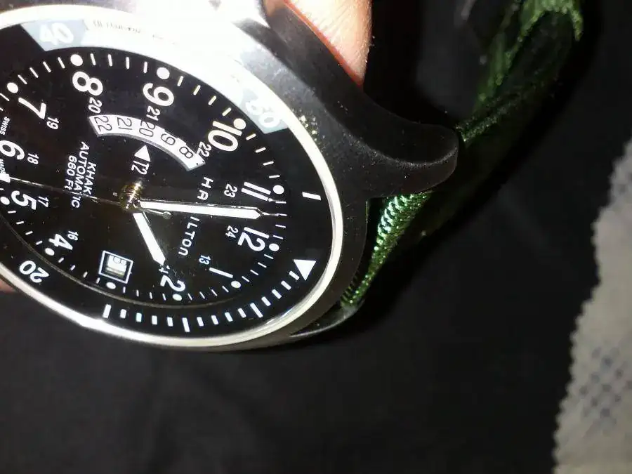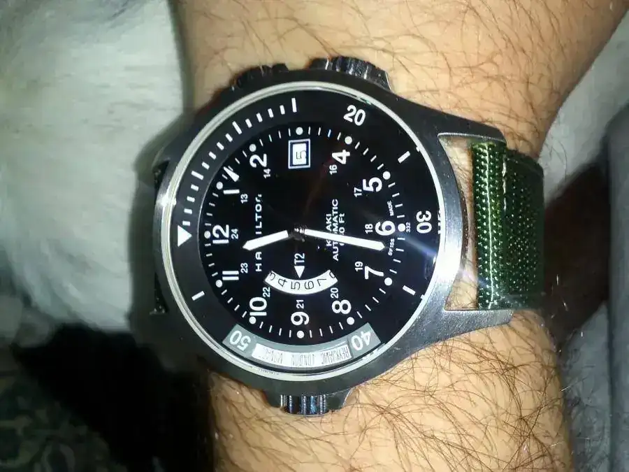 Y con permiso de la direccion del foro pongo este ultimo reloj a la venta un Hamilton Khaki Navy GMT automatico maquina ETA 2893 doble uso horario y con marcas de uso y una pequeña marca en el zafiro cerca del casillero del dia del mes pero no he logrado sacarla en fotos pero lo digo para que conste, el reloj va con correa de piel de coco marron y cierre mariposa original. (La correa nato verde no esta incluida) el reloj va sin caja ni papeles pero se enviara debidamente protegido.