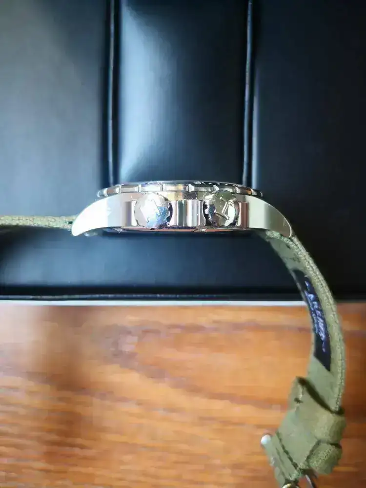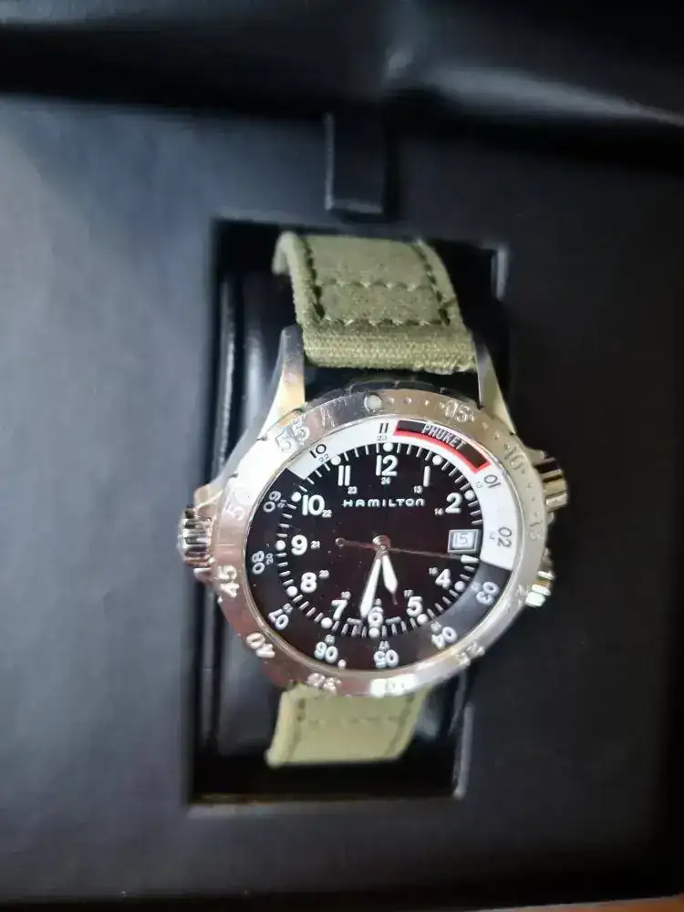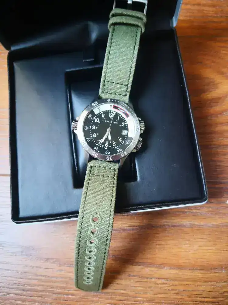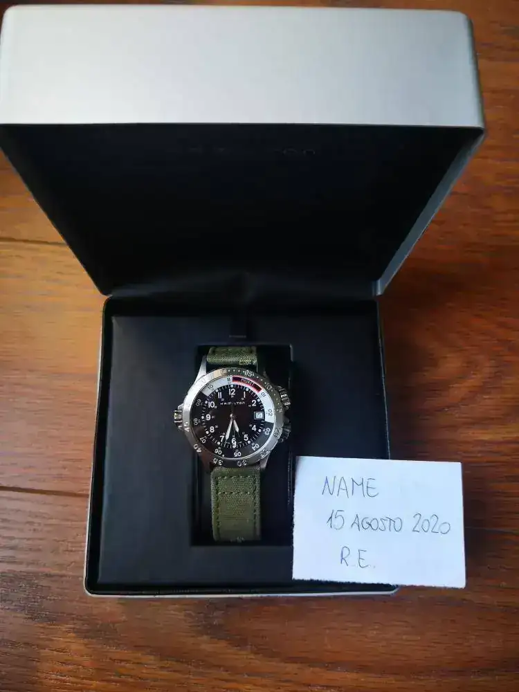 Vendo Hamilton khaki Navy GMT cuarzo en buen estado. Caja completa con garantía sin fecha. El reloj está usado pero en buen estado a reseñar una marquita en el bisel y en una de las asas(pongo una foto lo más cerca posible) el cristal en perfecto estado. La correa original de goma tiene una rajita y le falta una cincha, por eso incluyo una canvas "Archer" el reloj funciona perfectamente.