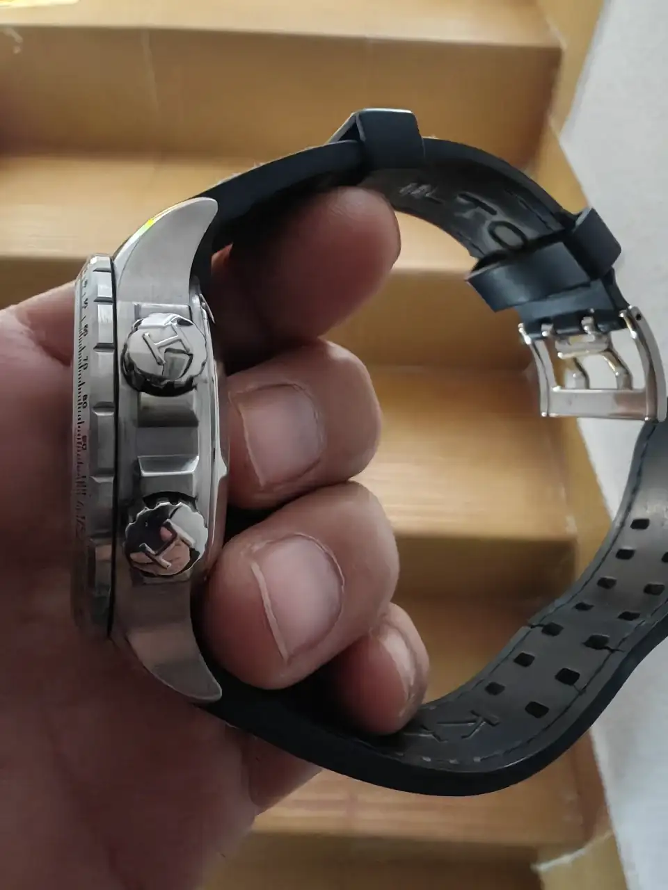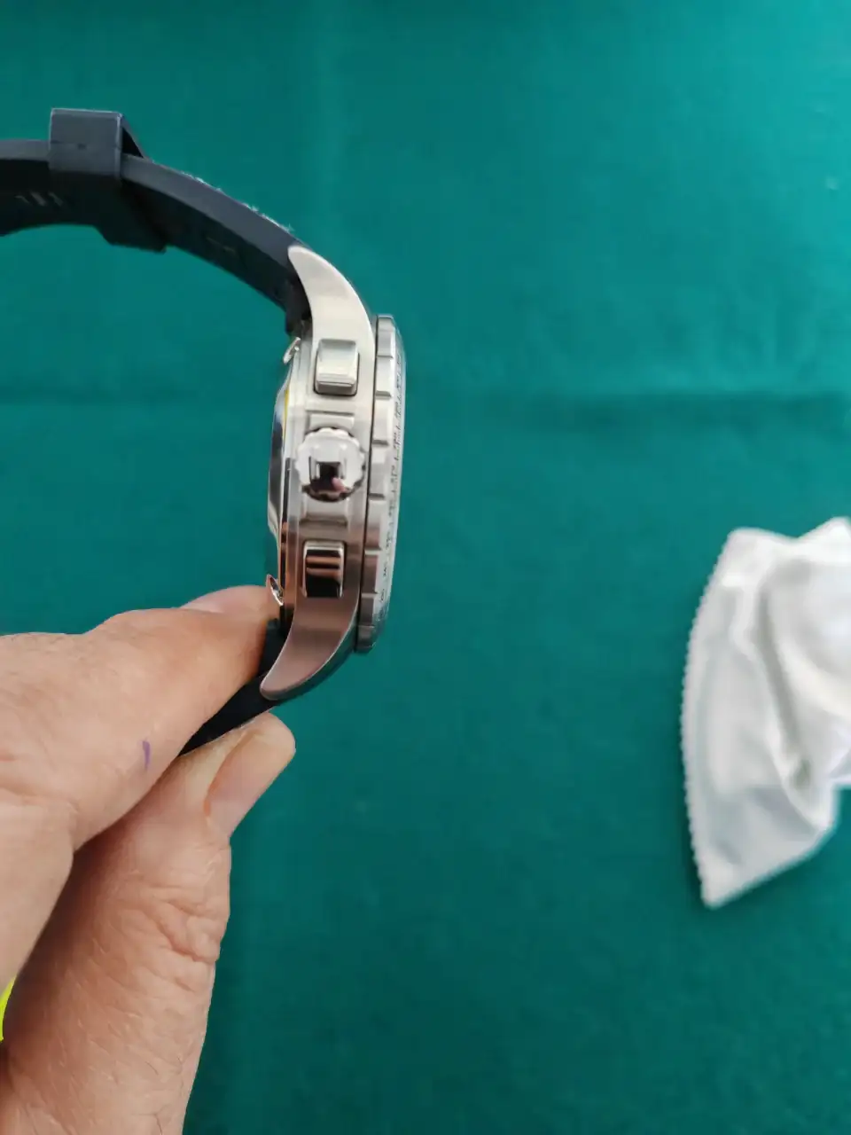 Lo compré directamente en Relojería en el año 2012. Viene con su correa original de caucho grueso. Es un reloj contundente, por lo que he podido medir tiene 44-45 mm de caja sin contar los botones. Lleva tres coronas roscadas y firmadas, bisel giratorio, resetea perfecto. La dotación está completa, caja, manual de instrucciones y tarjeta de garantía (ya caducada). El precio que le pongo es de 600 €, envío incluido sin asegurar. No me interesan cambios.