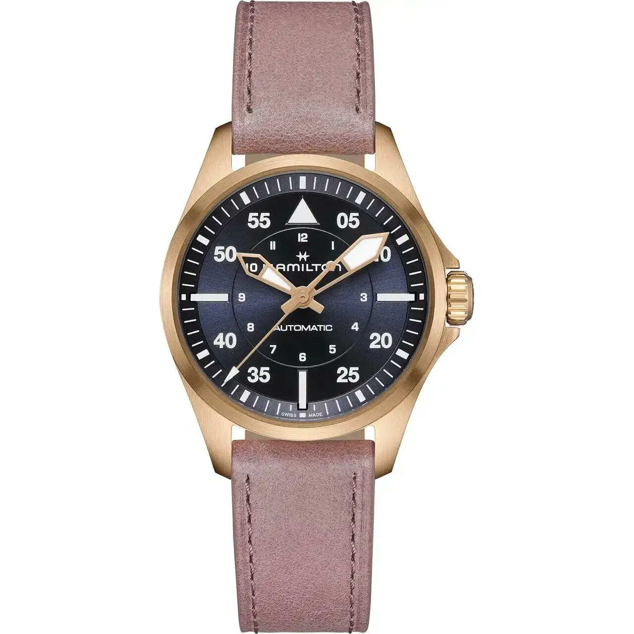 “El Khaki Pilot Auto, diseñado para los verdaderos amantes de la aviación, evoca el espíritu de la exploración y la aventura del Khaki. Las versiones de 36 mm, impulsadas por el movimiento automático H-10 con una reserva de marcha de 80 horas y un resorte regulador de Nivachron™, responden a la tendencia de relojes más pequeños. Estos diseños más compactos, que cumplen los estándares de precisión de la cabina, cobran vida en el cielo y en tierra firme. El Khaki Pilot Auto combina un brazalete atemporal de acero inoxidable con una sofisticada esfera negra y un revestimiento especial de Super-LumiNova para una mayor legibilidad.“