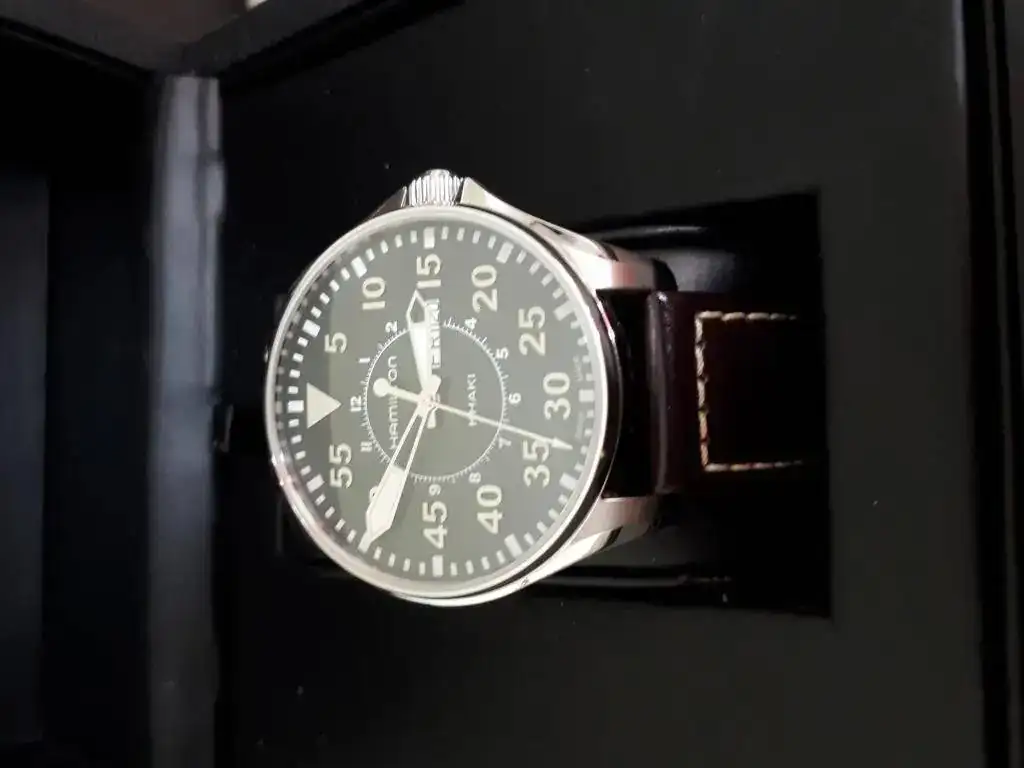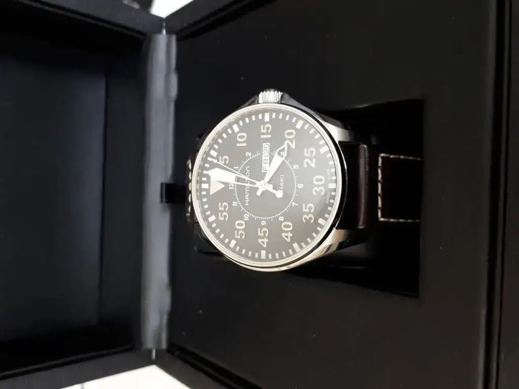 Buenas tardes, saco a la venta este Hamilton Khaki Pilot Day Date Quartz en un perfecto estado. Es una pieza con caja de acero inoxidable de 42 mm, corona a rosca y sumergible a 200 m.