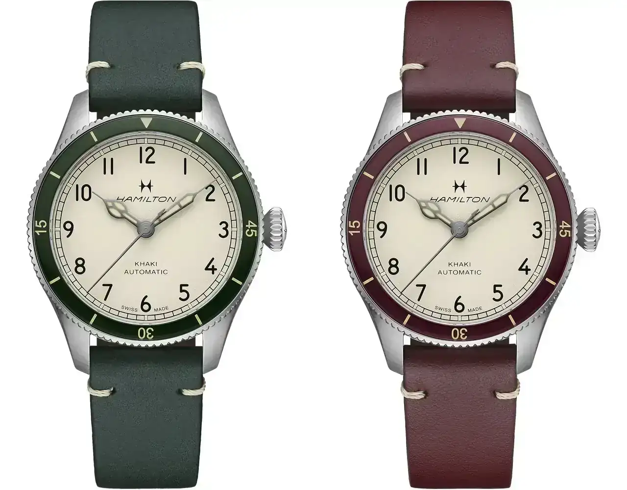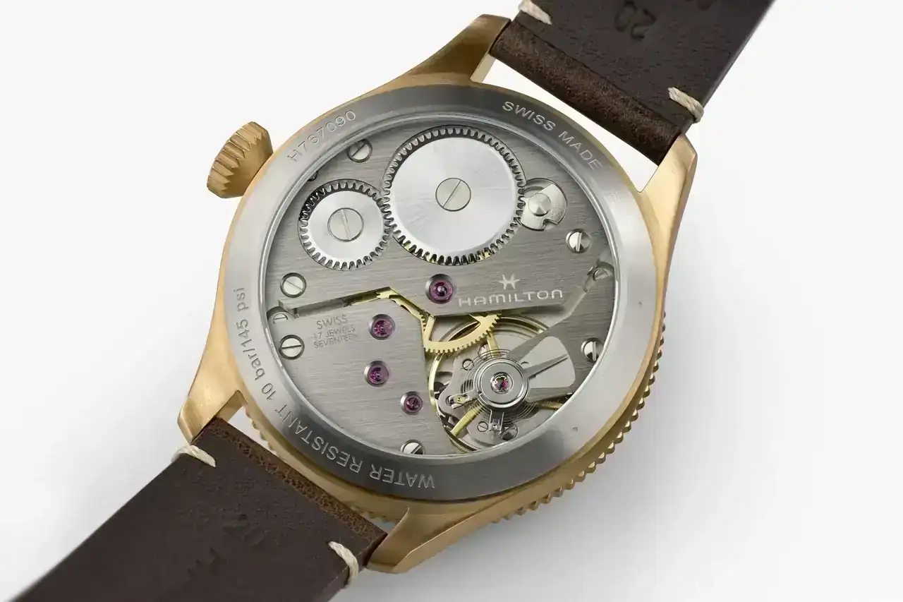 Los dos modelos de 38 y caja de acero presentan un calibre automatico H-10 con 80 horas de reserva de marcha mientras que el modelo de 43 y caja de bronce muestra lo que parece un Unitas y solo 46 horas. Lo curioso es que en la nota de prensa casi no se dan detalles de este calibre, pero al tener el fondo transparente parecería que no hay dudas al respecto (y se ve bien acabadito...).
