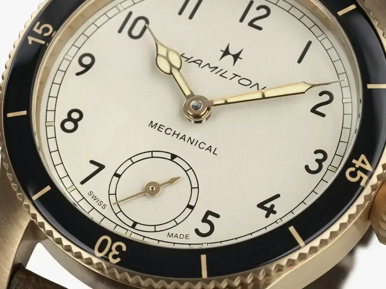 Agujas de horas y minutos con recubrimiento galvánico en color 4N y Super-LumiNova® beige