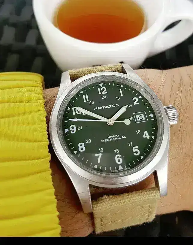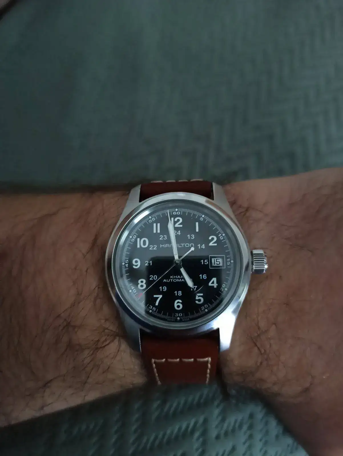 Hoy ha caido el que creo que es (aun no siendo el auténtico y purista Hamilton Khaki) el definitivo, un automático de 40mm con esfera militar y fondo visto que la verdad es que en la muñeca queda de lujo! Sólo me da rabia que el reloj no sea completamente mate y que tenga el borde en brillo, es muy bonito pero le resta imagen de reloj militar. Qué opináis de este modelo? Tenéis el mismo problema que yo?