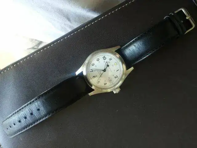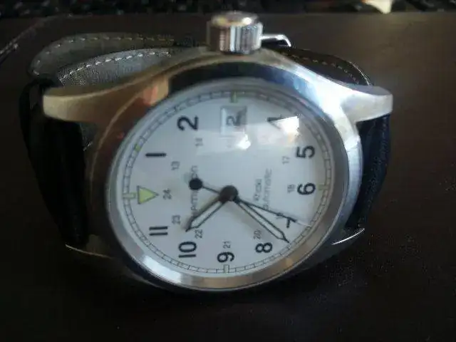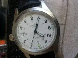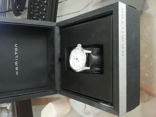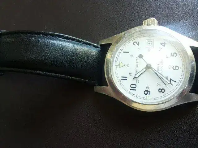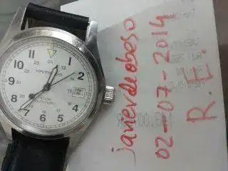 HAMILTON KHAKY AUTOMATIC 38MM esfera blanca, correa de piel negra original de la marca, creo que esta a un 40/50% de su uso, tiene arañazos no profundos. La caja y bisel tienen arañazos superficiales (creo que una simple toallita de capecod y se arregla), el cristal como zafiro que es esta perfecto y la marcha es muy buena. No tengo papeles, si caja.
