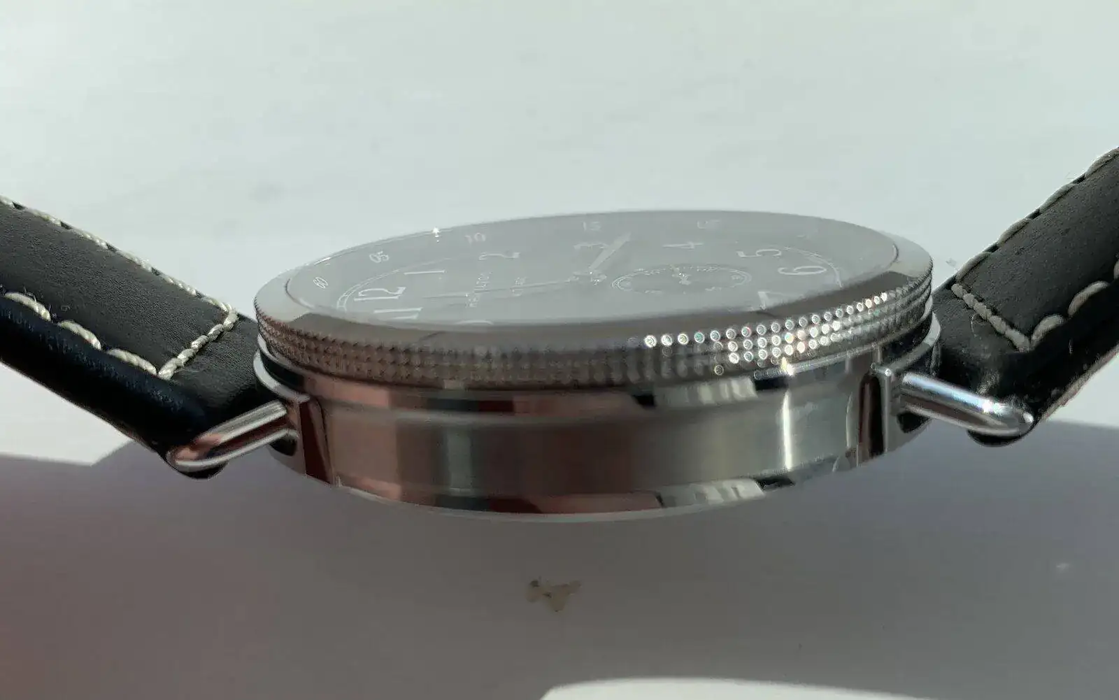 La caja estilo reloj de bolsillo se inspiró en los cronómetros marinos de la década de 1940 de Hamilton.