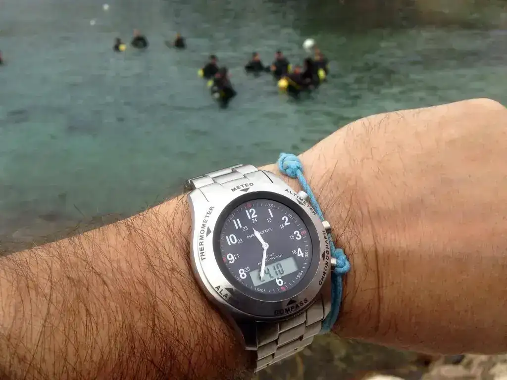 Dial negro, con venta digital con indicación de hora o fecha y bisel con inscripción de sus funciones: altímetro, barómetro, brújula, cronómetro, temperatura y alarma.