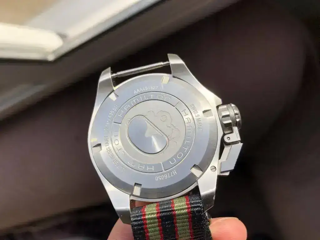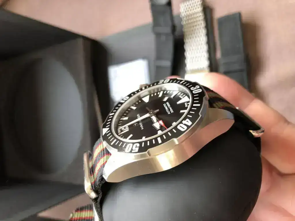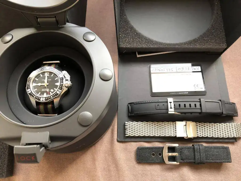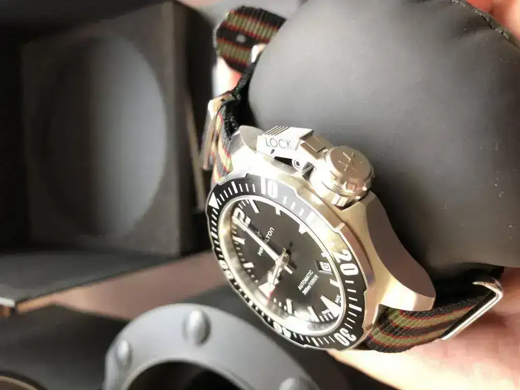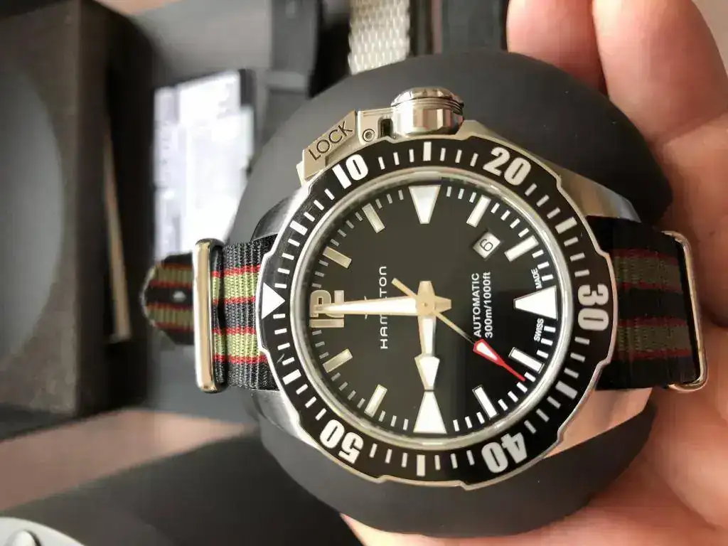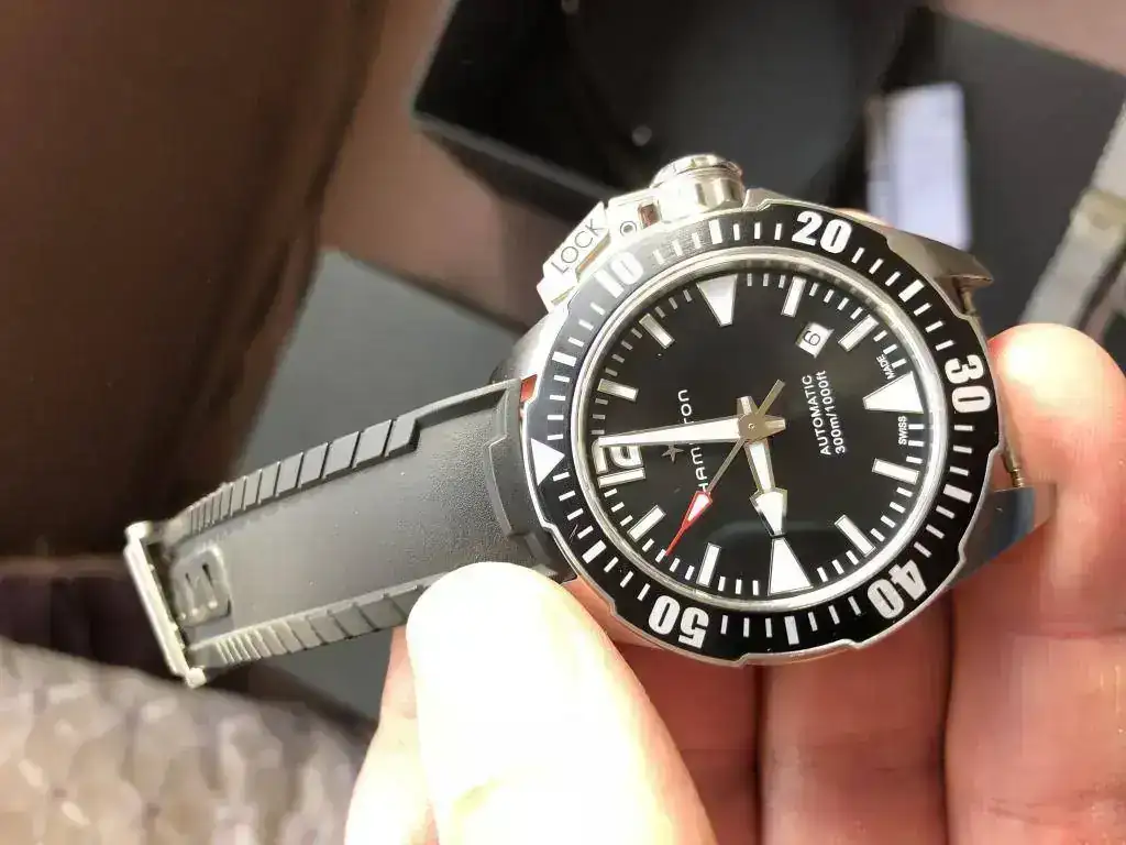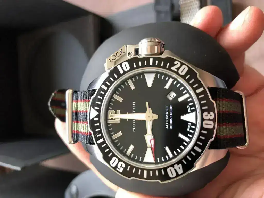 Buenos dias saco a venta este Hamilton Navy Frogman con poquisimas puestas; como nuevo, solo una minimarquita inapreciable en una asa (intentar ver en la foto)