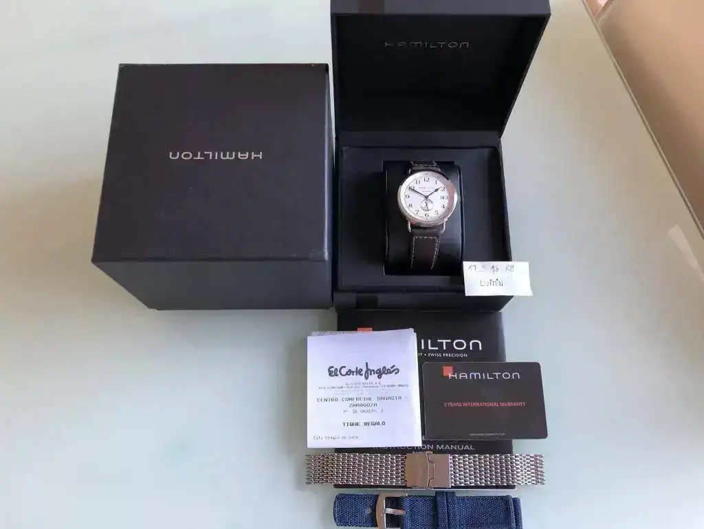 El reloj se entrega con toda su dotación: Caja exterior en cartón duro, caja interior y manual de instrucciones con garantia sellada (2015) mas el tiquet regalo del Corte Ingles donde se compró