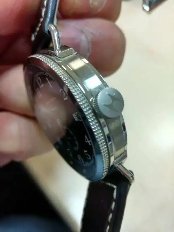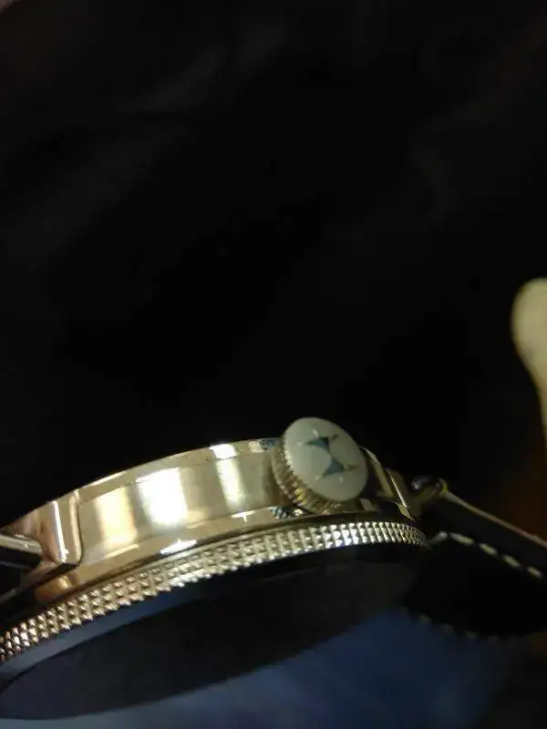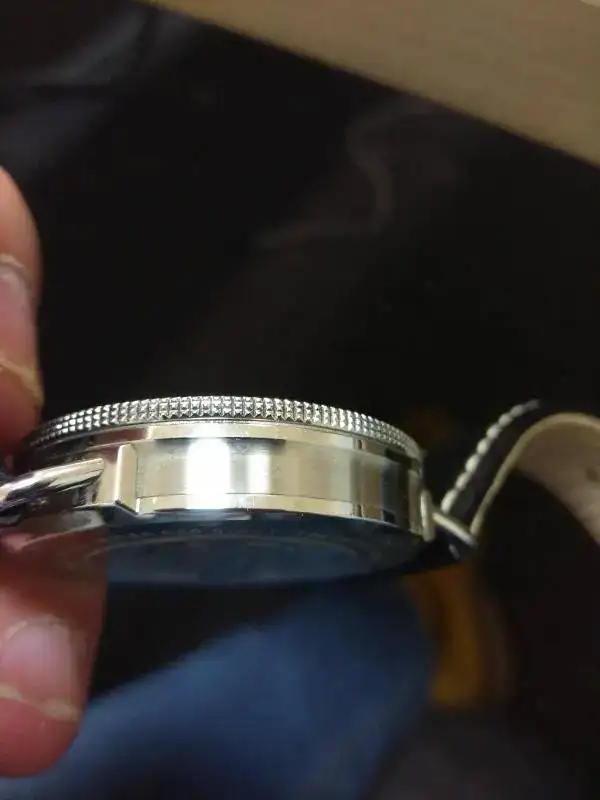 Está en muy buen estado de caja y demás aunque cabe destacar que tiene una micro marca en el cristal a la altura del 55. Apenas se distingue y sólo se ve al poner el reloj a contraluz y dándole la luz directa... no afecta al día a día pero ahí está y hay que remarcarlo. La he sacado magnificada en una foto para que se viese.
