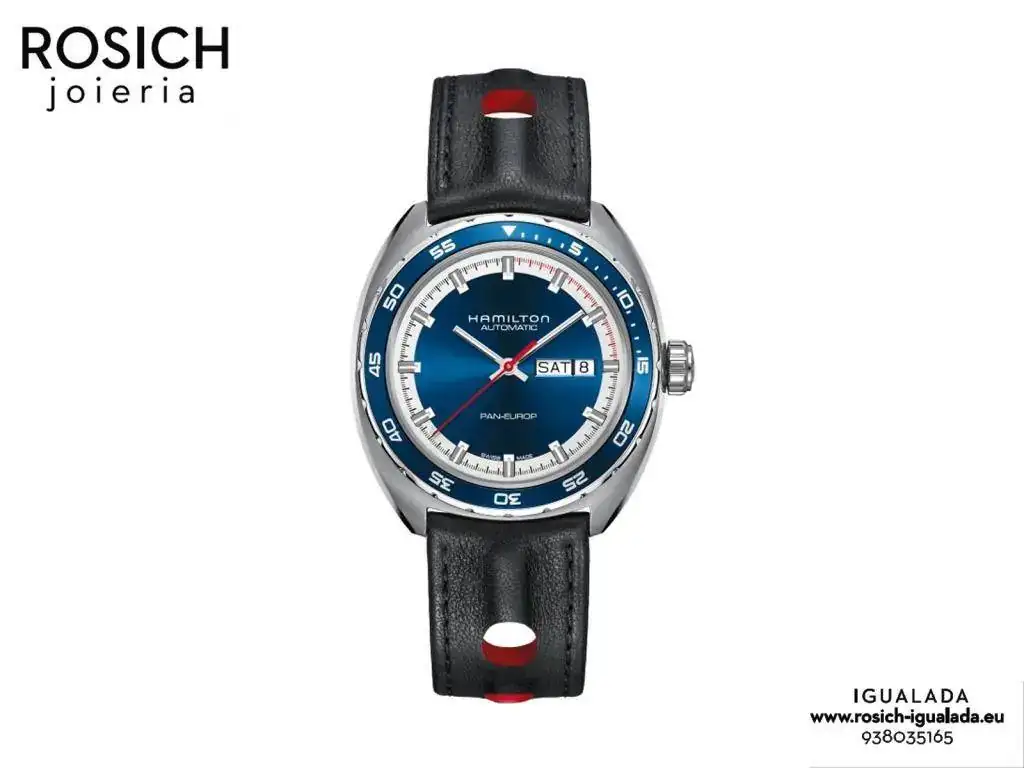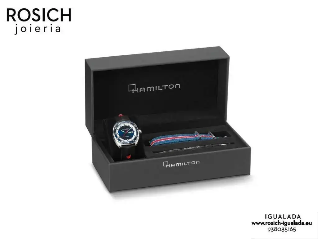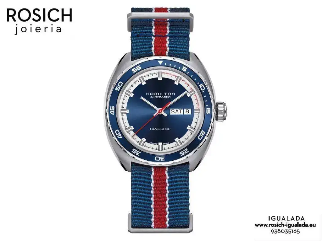 Tenemos en estoc el nuevo Hamilton Pan Europ en esfera azul y caja especial con dos correas, la negra/roja y la nato azul con lineas blancas y una roja.