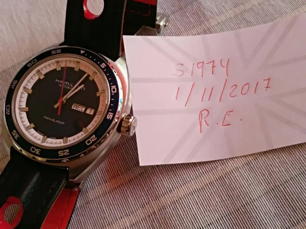 Reloj AUTOMATICO HAMILTON PAN EUROP (PVP 995 EUR, Maquina H30 CON 80 Horas de reserva de marcha, admite carga manual y parada de segundero, excelente estado y marcha, leves marcas de estos 4 meses de uso alterno, algún leve roce en el lateral izquierdo y un mini ding en la parte metálica exterior del bisel al lado del triángulo (Ver fotos ampliadas, en vivo ni se percibe) pero por decir algo, Son chorradas pero para los muy meticulosos lo cito, Ambas correas como nuevas, La nato sin estrenar, incluye toda su dotación a excepción de la herramienta de cambio de correas que no es la original, garantía nacional con fecha 30-6-2017, le quedan 20 meses vamos.
