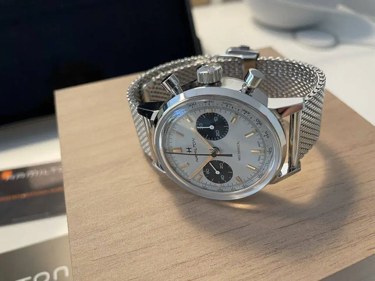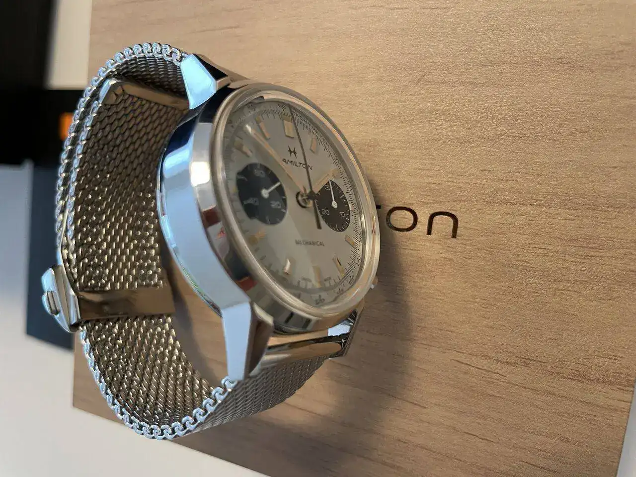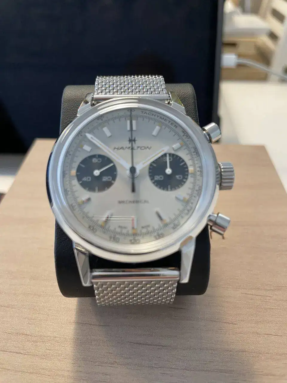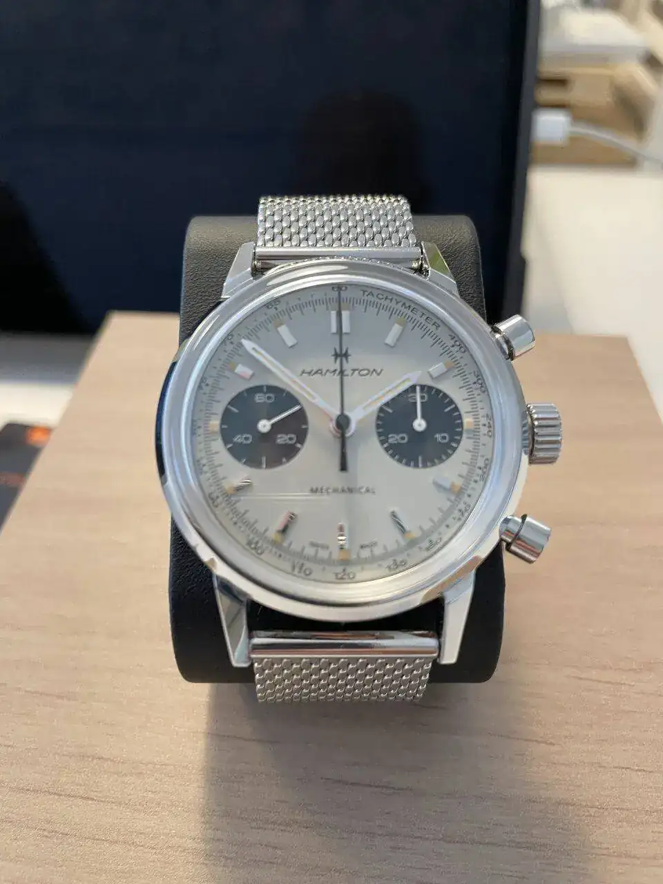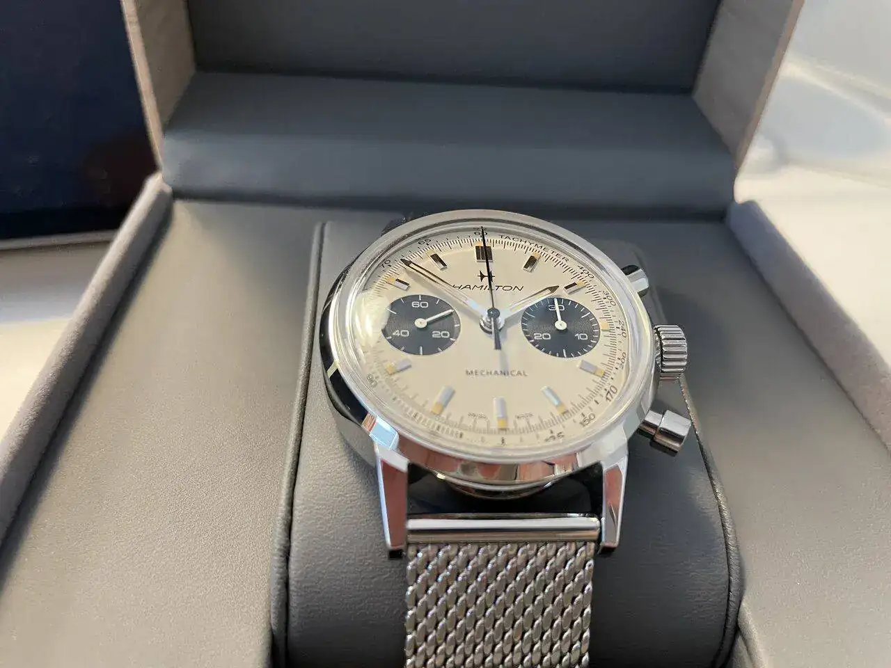 AMERICAN CLASSIC INTRA-MATIC CHRONOGRAPH H dial panda , con el nuevo movimiento de cuerda manual H51. Espectacular esfera rematada con un precioso cristal abombado y correa malla milanesa con cierre desplegable con pulsadores, con unos acabados sublimes todo el conjunto. Su estado es excelente ya que es de febrero y apenas se ha usado, le pondría un 9,5 sobre 10 por ponerle algo debido a algún inevitable pelillo en los preciosos pulidos y en el interior de las asas por algún cambio de correa para ver cómo le quedaba la piel. Si alguien quiere también la correa de piel original negra puede contactar por privado y hablamos precio.