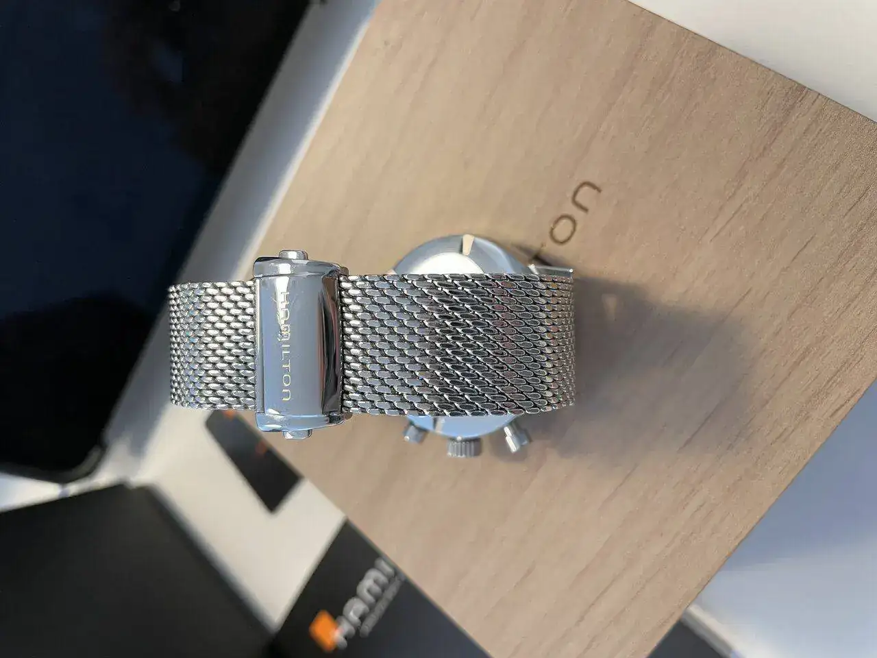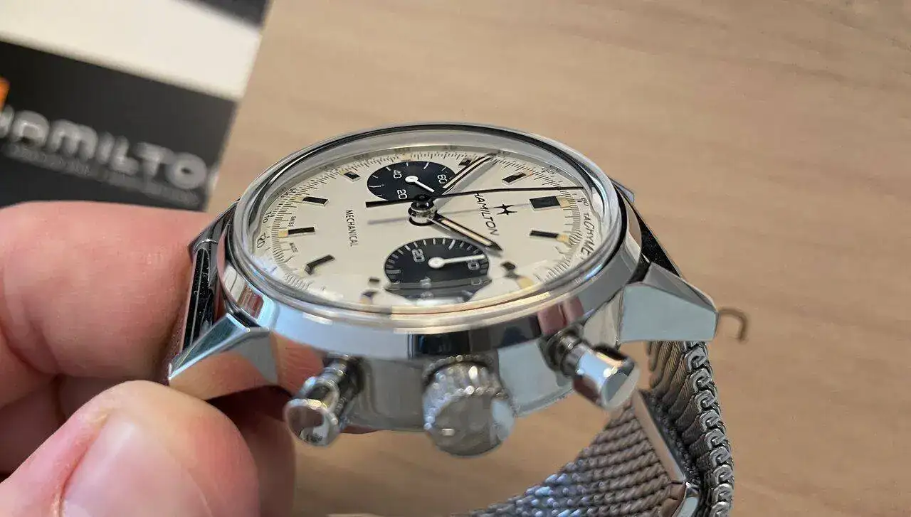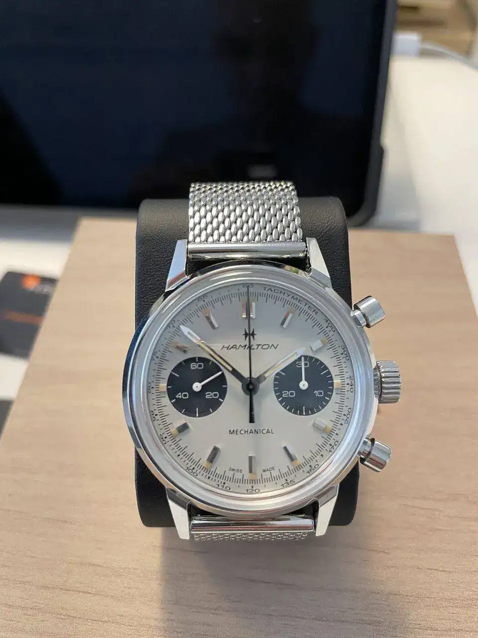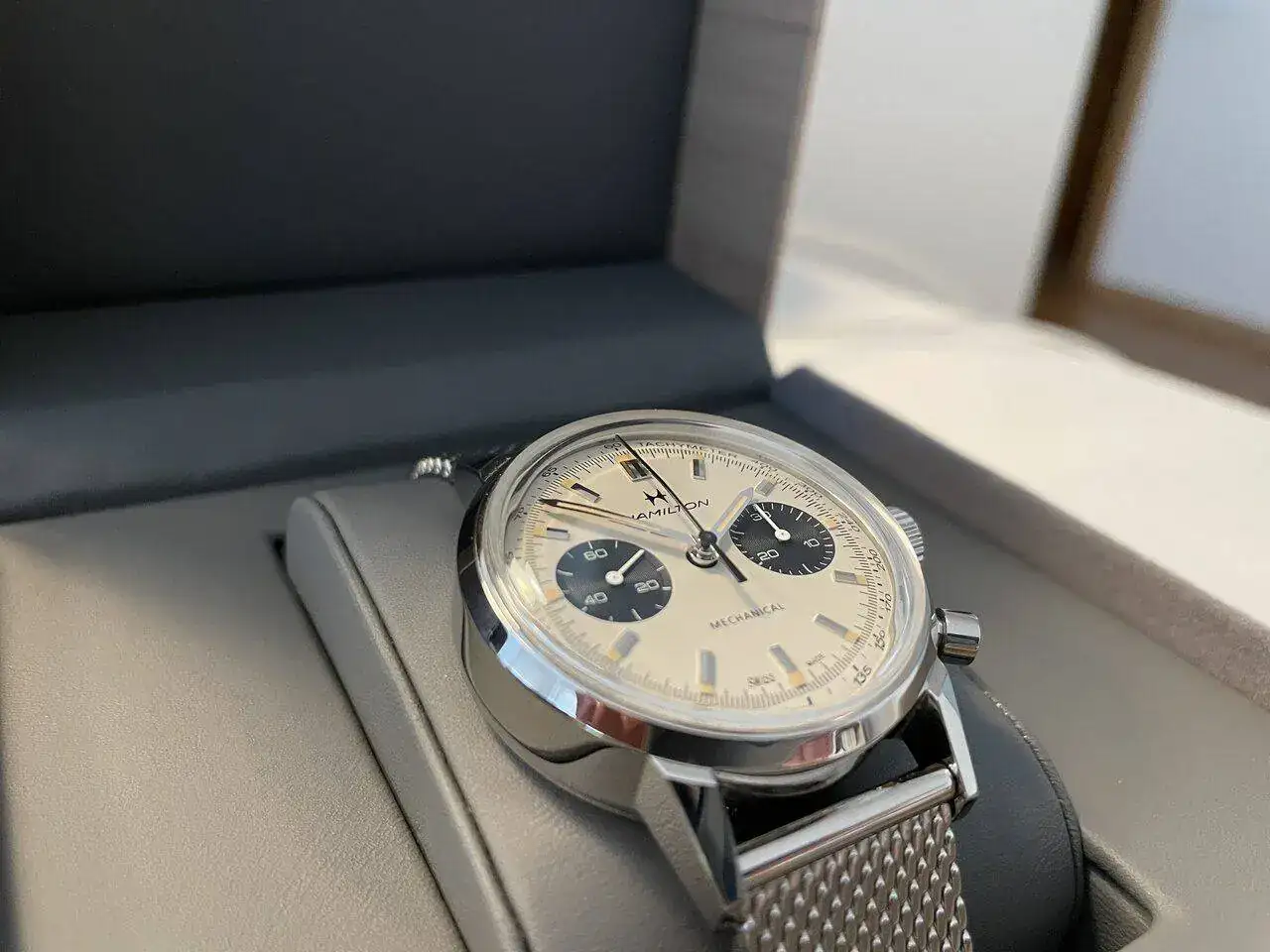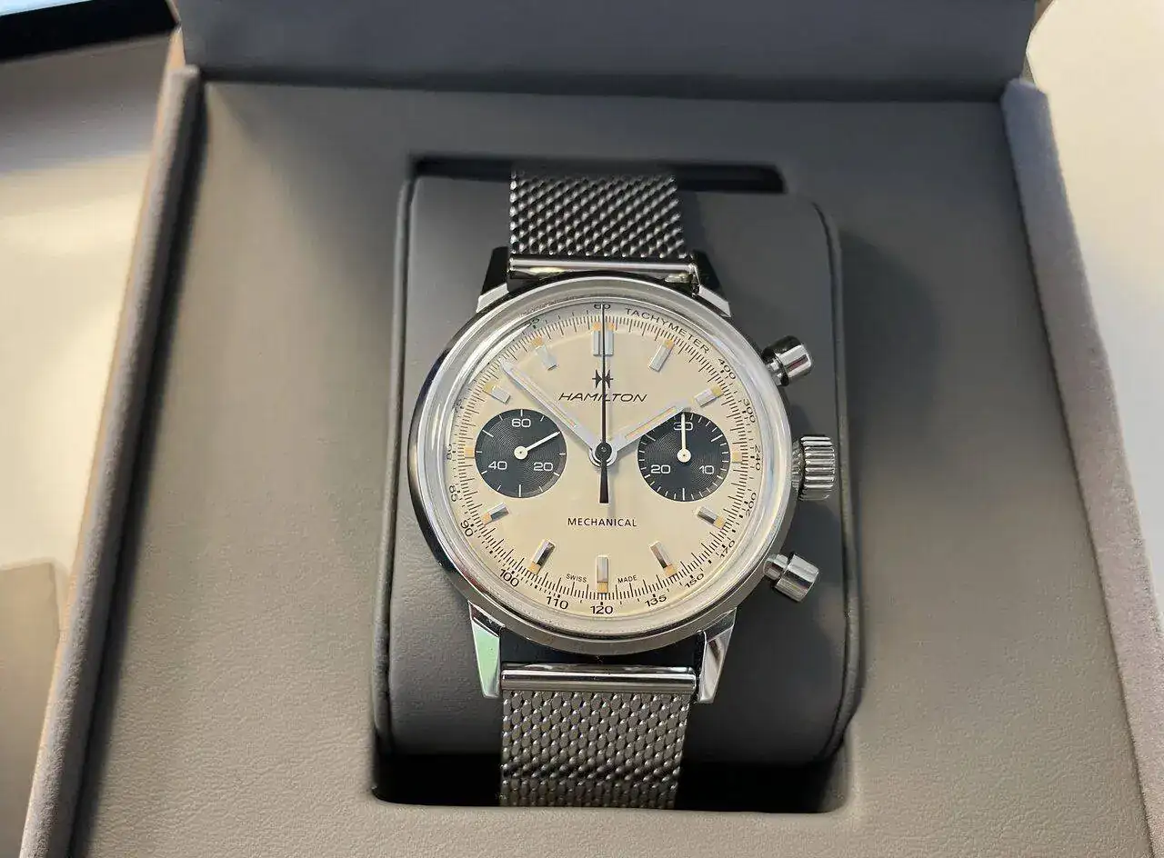 AMERICAN CLASSIC INTRA-MATIC CHRONOGRAPH H dial panda , con el nuevo movimiento de cuerda manual H51. Espectacular esfera rematada con un precioso cristal abombado y correa malla milanesa con cierre desplegable con pulsadores, con unos acabados sublimes todo el conjunto. Su estado es excelente ya que es de febrero y apenas se ha usado, le pondría un 9,5 sobre 10 por ponerle algo debido a algún inevitable pelillo en los preciosos pulidos y en el interior de las asas por algún cambio de correa para ver cómo le quedaba la piel. Si alguien quiere también la correa de piel original negra puede contactar por privado y hablamos precio.