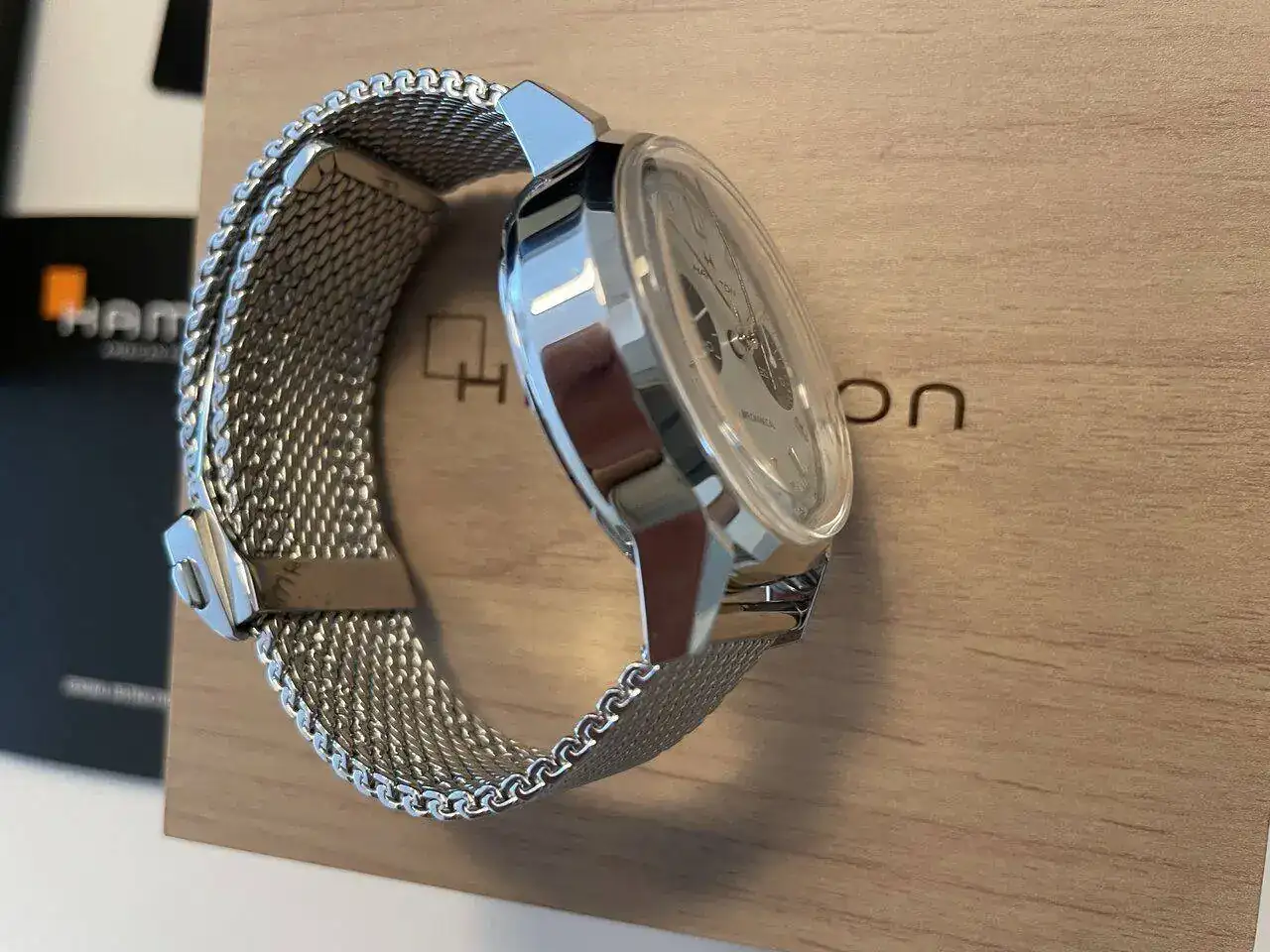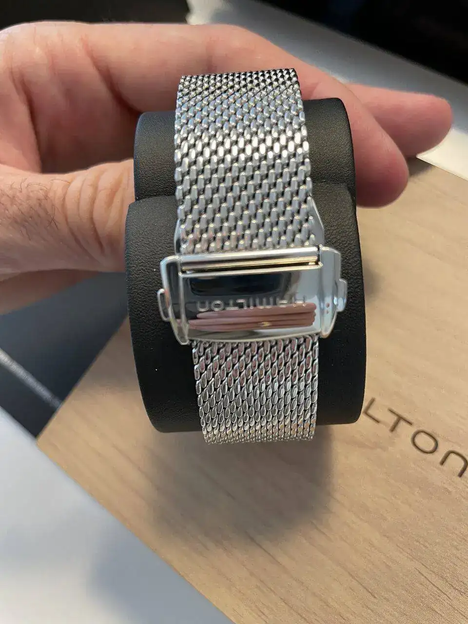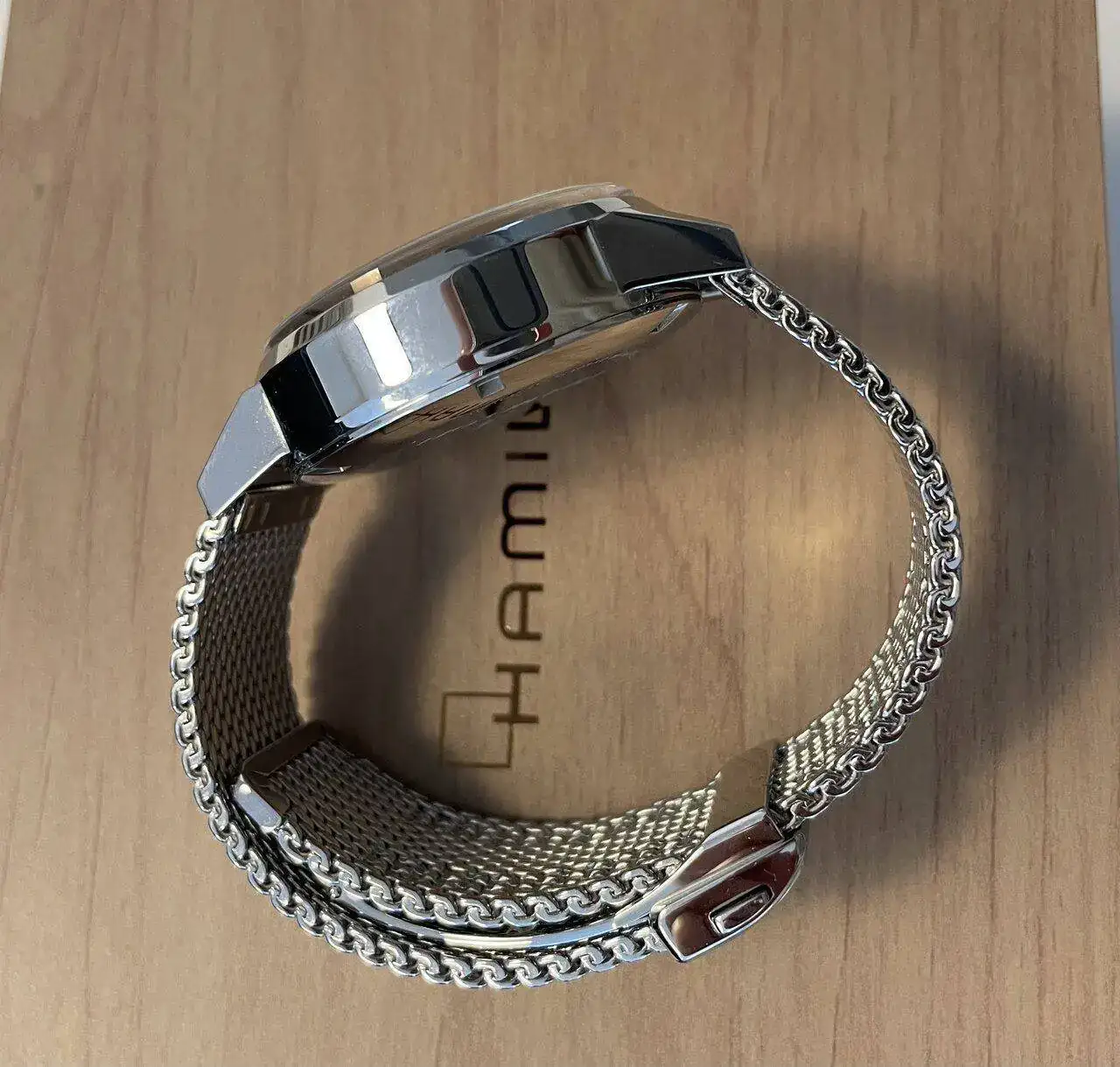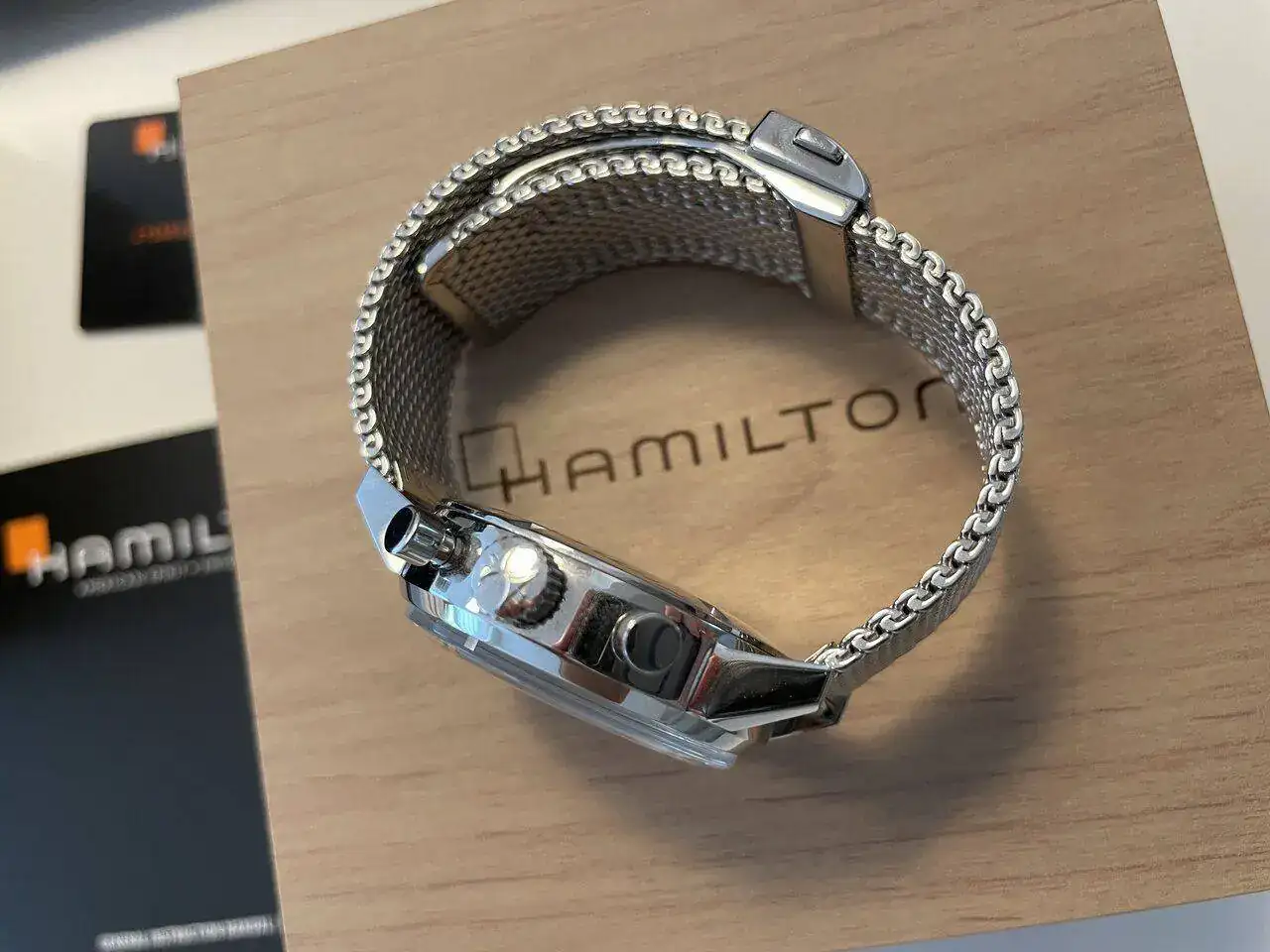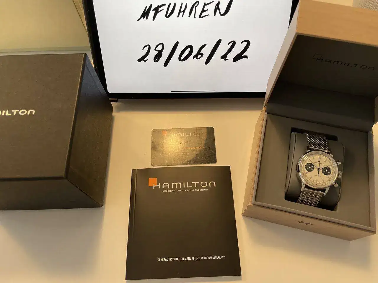 AMERICAN CLASSIC INTRA-MATIC CHRONOGRAPH H dial panda , con el nuevo movimiento de cuerda manual H51. Espectacular esfera rematada con un precioso cristal abombado y correa malla milanesa con cierre desplegable con pulsadores, con unos acabados sublimes todo el conjunto. Su estado es excelente ya que es de febrero y apenas se ha usado, le pondría un 9,5 sobre 10 por ponerle algo debido a algún inevitable pelillo en los preciosos pulidos y en el interior de las asas por algún cambio de correa para ver cómo le quedaba la piel. Si alguien quiere también la correa de piel original negra puede contactar por privado y hablamos precio.