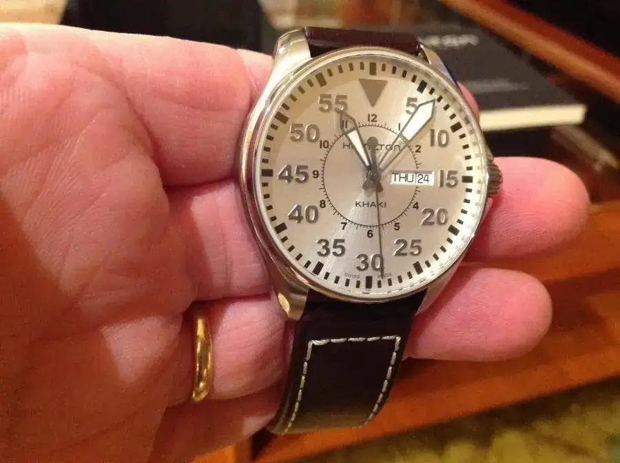 se impone la realidad de que no soy capaz de llevar un reloj de más de 40 mm.El reloj está impecable y tiene una docena de puestas. Por supuesto dotación completa, garantía apenas estrenada y, para hacer la cosa más atractiva, incluyo una morellato acabado coco con hebilla original Hamilton, y otra correa textil-caucho para poder mojarla sin remilgos (este reloj es 200 metros).