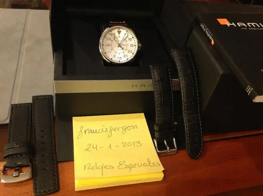 El reloj está impecable y tiene una docena de puestas. Por supuesto dotación completa, garantía apenas estrenada y, para hacer la cosa más atractiva, incluyo una morellato acabado coco con hebilla original Hamilton, y otra correa textil-caucho para poder mojarla sin remilgos (este reloj es 200 metros).