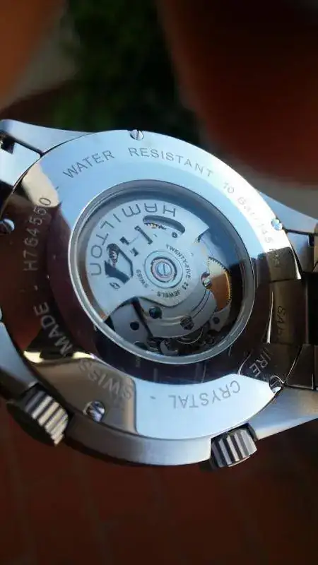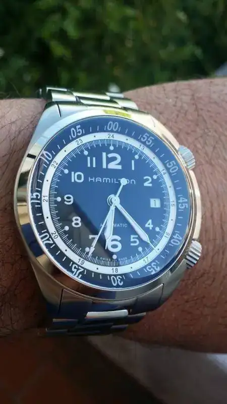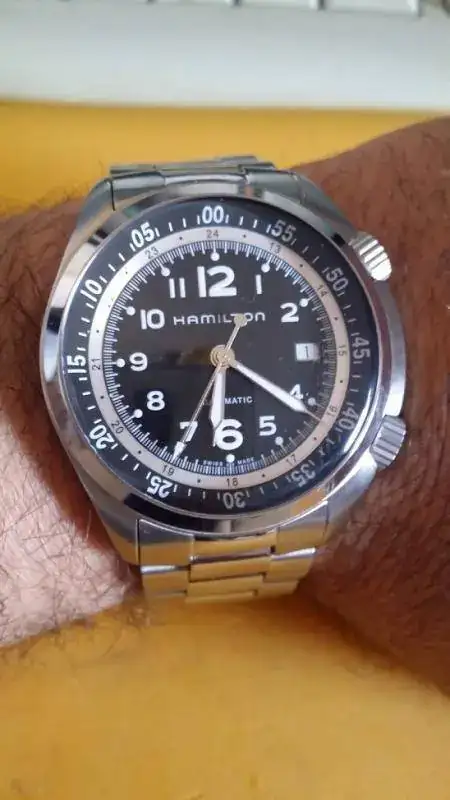 Es la versión con armis, automático con doble corona una para el movimiento y otra para el bisel interno de la esfera. Monta el que Hamilton denomina como calibre H10 que es una ETASA 2824-2, de sobra conocido por su robustez y fiabilidad.
